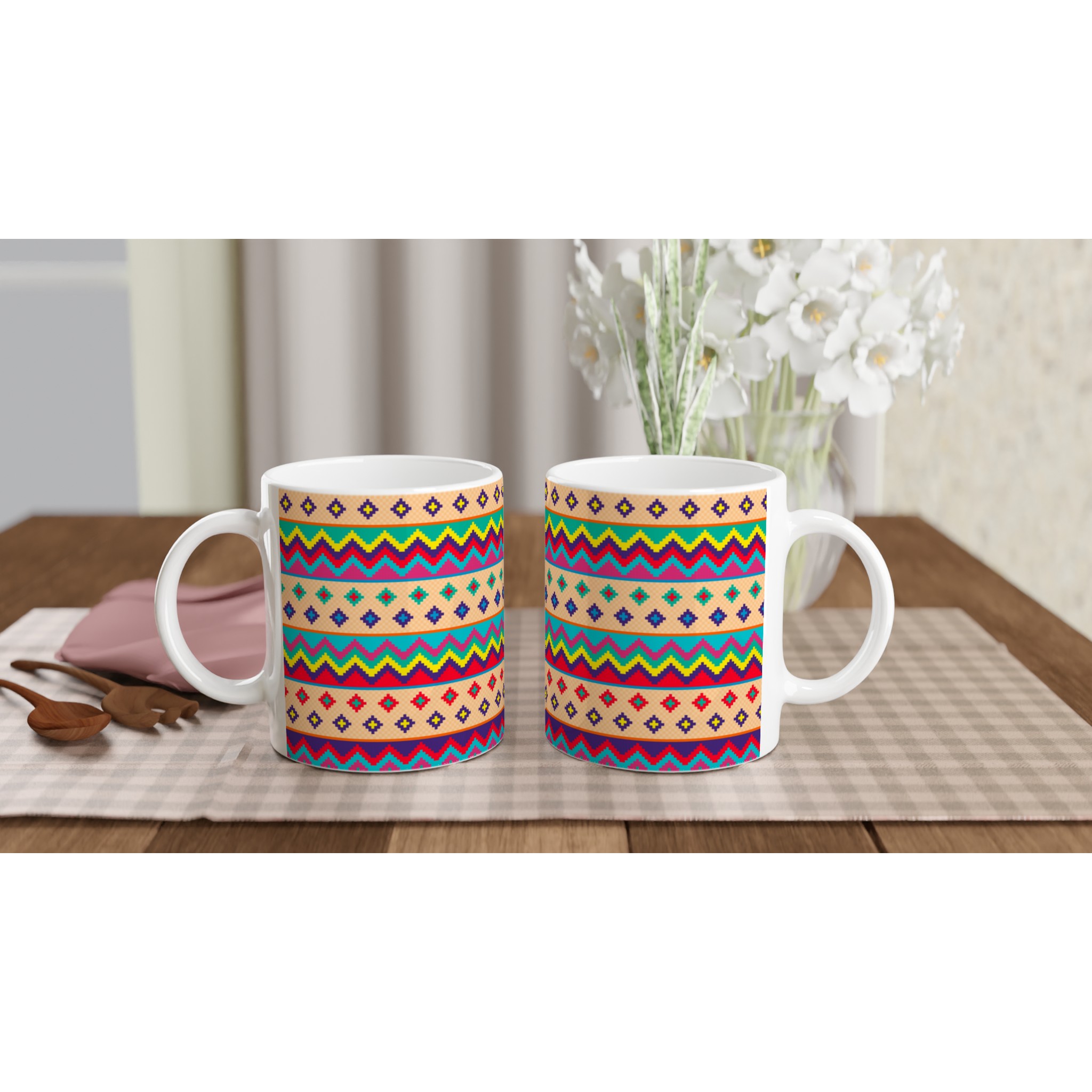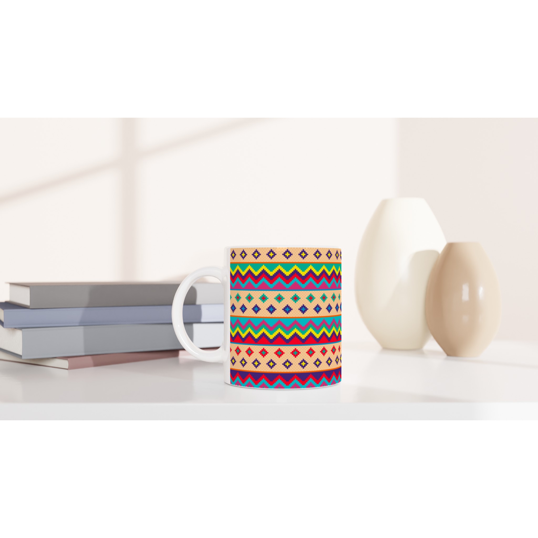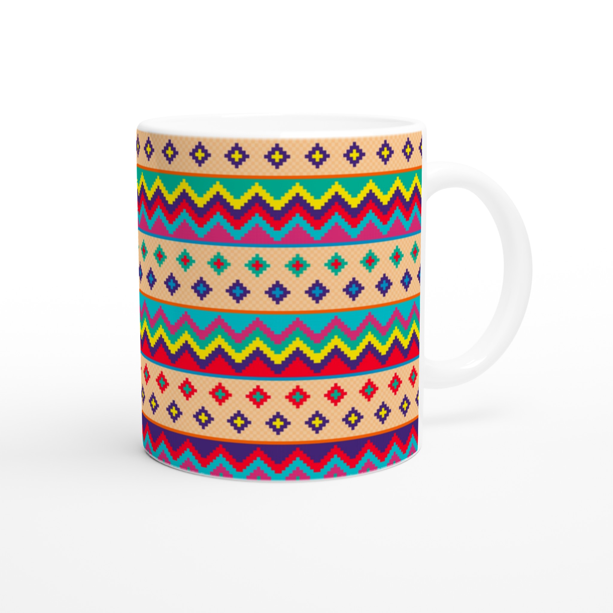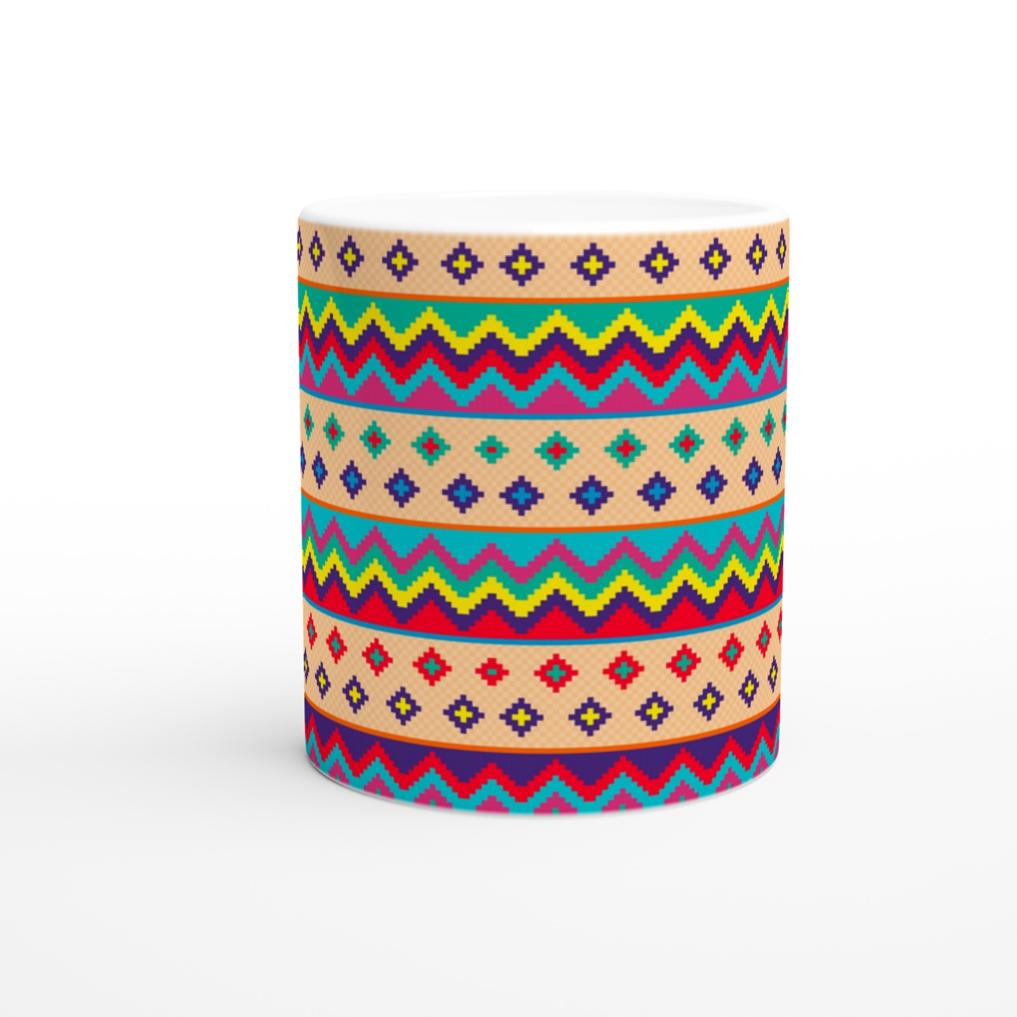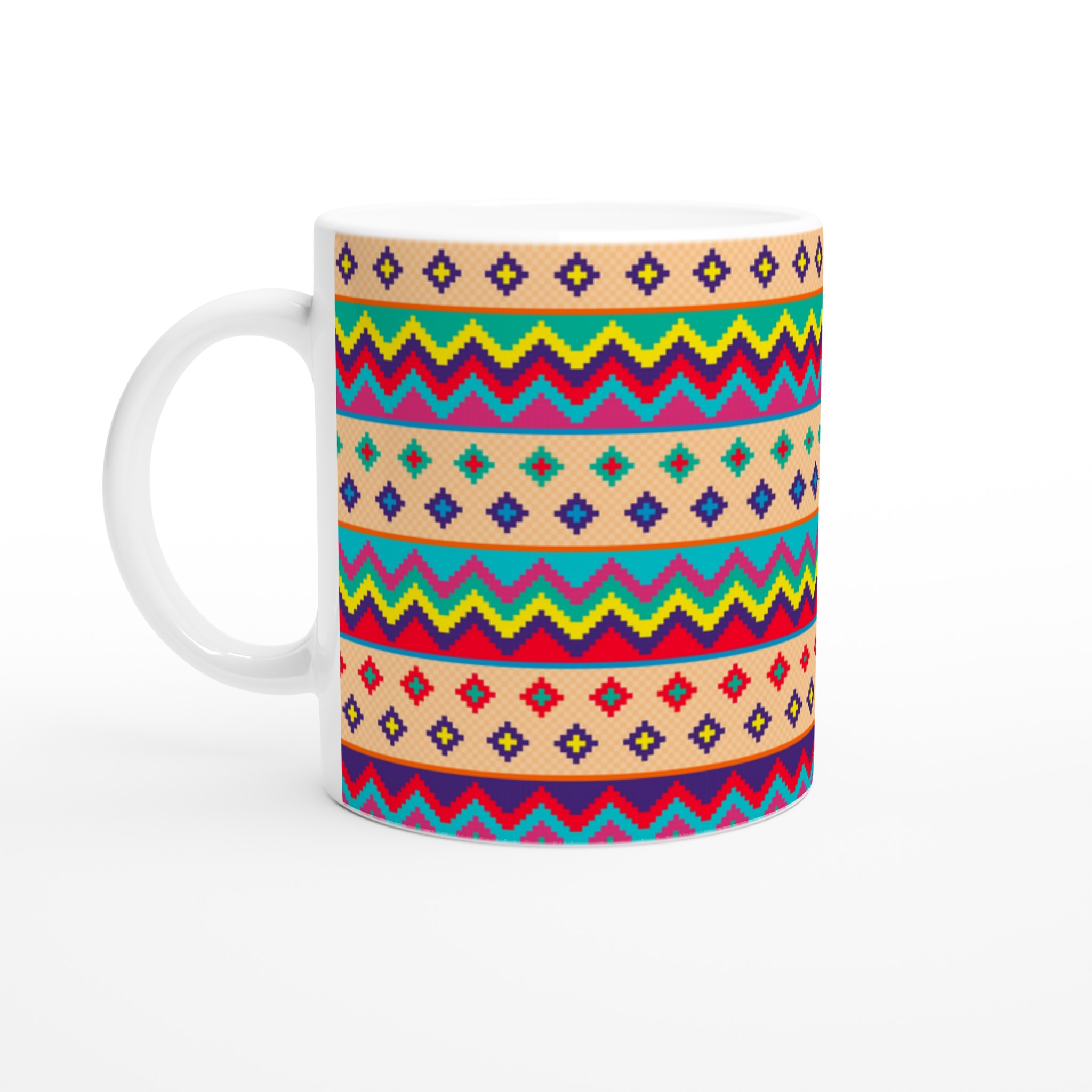Väck dina sinnen varje morgon med denna livfulla keramikmugg! Prydd med ett fängslande aztekinspirerat pixelkonstmönster i nyanser av rött, turkos, gult och djuplila, kommer denna mugg garanterat att tillföra en explosion av glädje och färg till din fikastund. Det unika, geometriska mönstret är en hyllning till traditionell konst med en modern, digital twist, vilket gör den till en riktig samtalsstartare och en perfekt present till den designmedvetne.