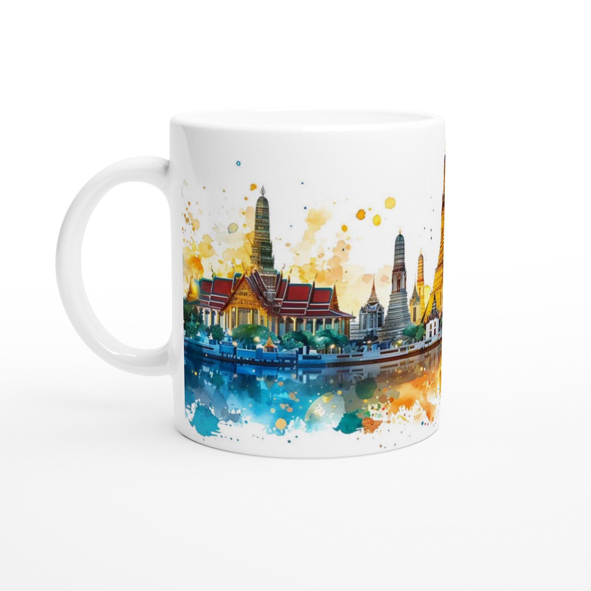 Fånga den magiska skönheten hos Bangkoks tempel och flodlandskap med denna unika akvarellinspirerade mugg. De varma guldtonerna möter svala blå nyanser i en konstnärlig explosion av färg som för tankarna till en solnedgång över Chao Phraya-floden. Denna mugg är inte bara en dryckesbehållare, utan ett konstverk som skapar en känsla av lugn och inspiration med varje klunk. Ett perfekt sätt att addera en touch av thailändsk mystik till din dag, eller som en oförglömlig present till den som älskar resor och konst.