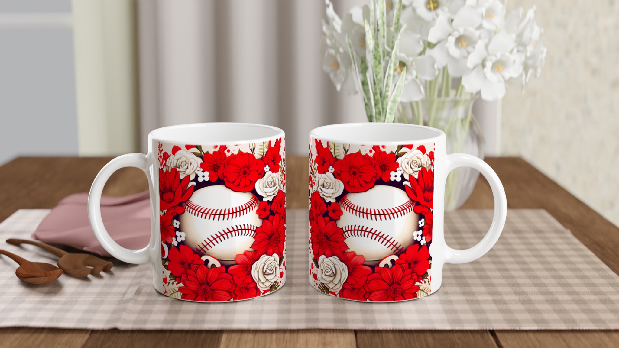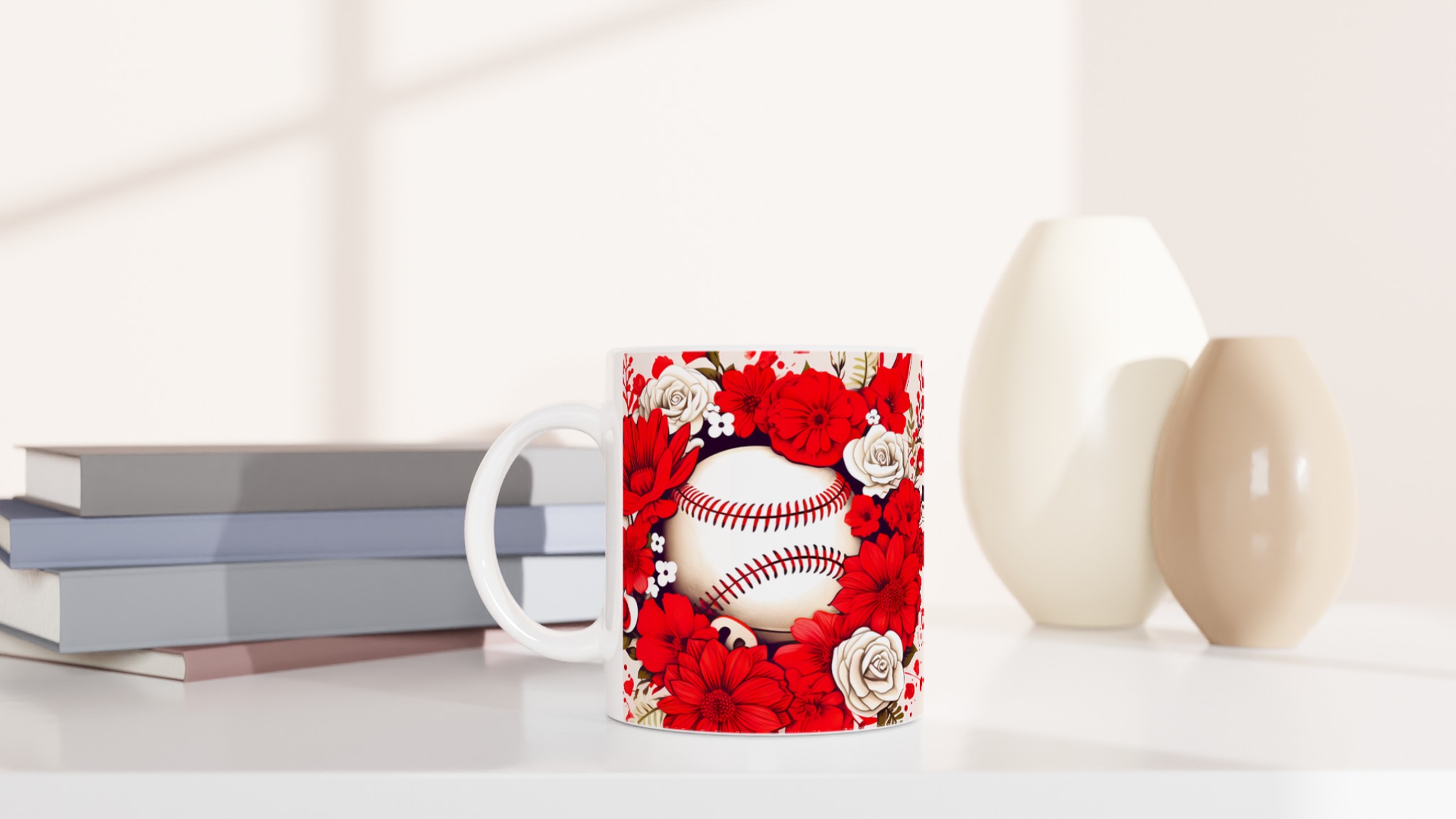 Fånga känslan av vår och passion med vår Baseball Bloom keramiska mugg. Denna unika mugg pryds av en slående design med detaljerade röda och vita blommor som elegant ramar in en klassisk baseball, vilket skapar en perfekt harmoni mellan sportig entusiasm och tidlös skönhet. Den är inte bara en fröjd för ögat, utan också den perfekta följeslagaren för dina favoritdrycker.