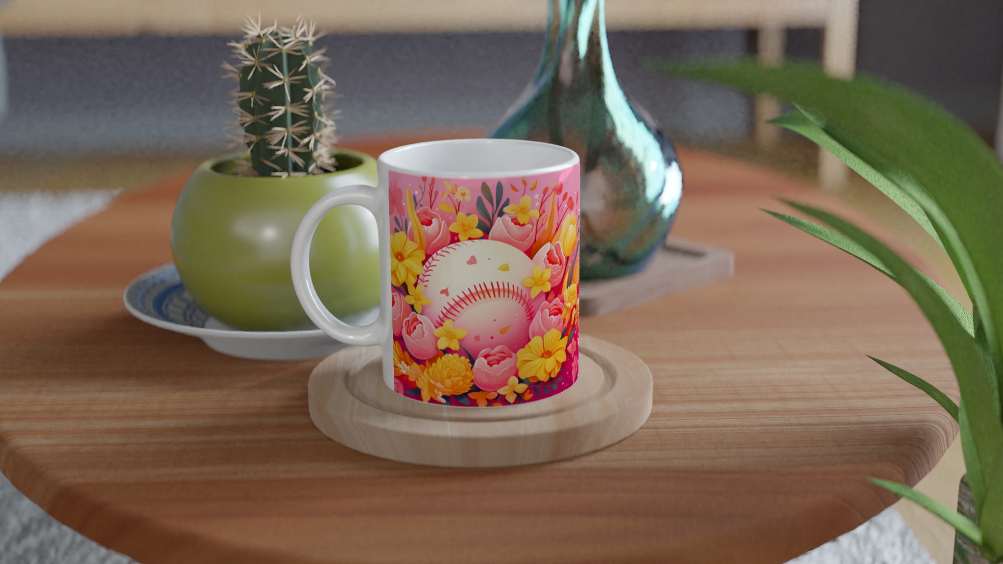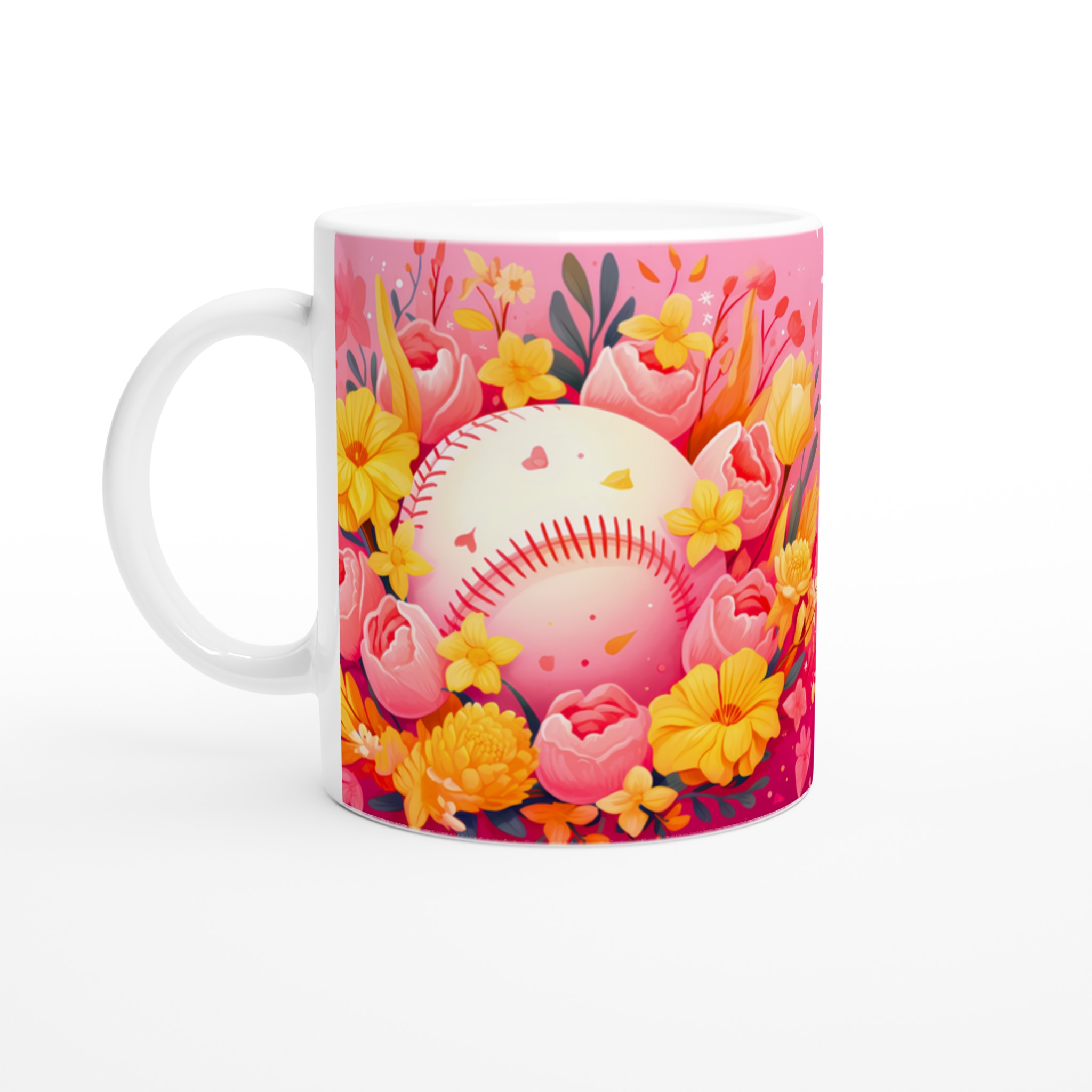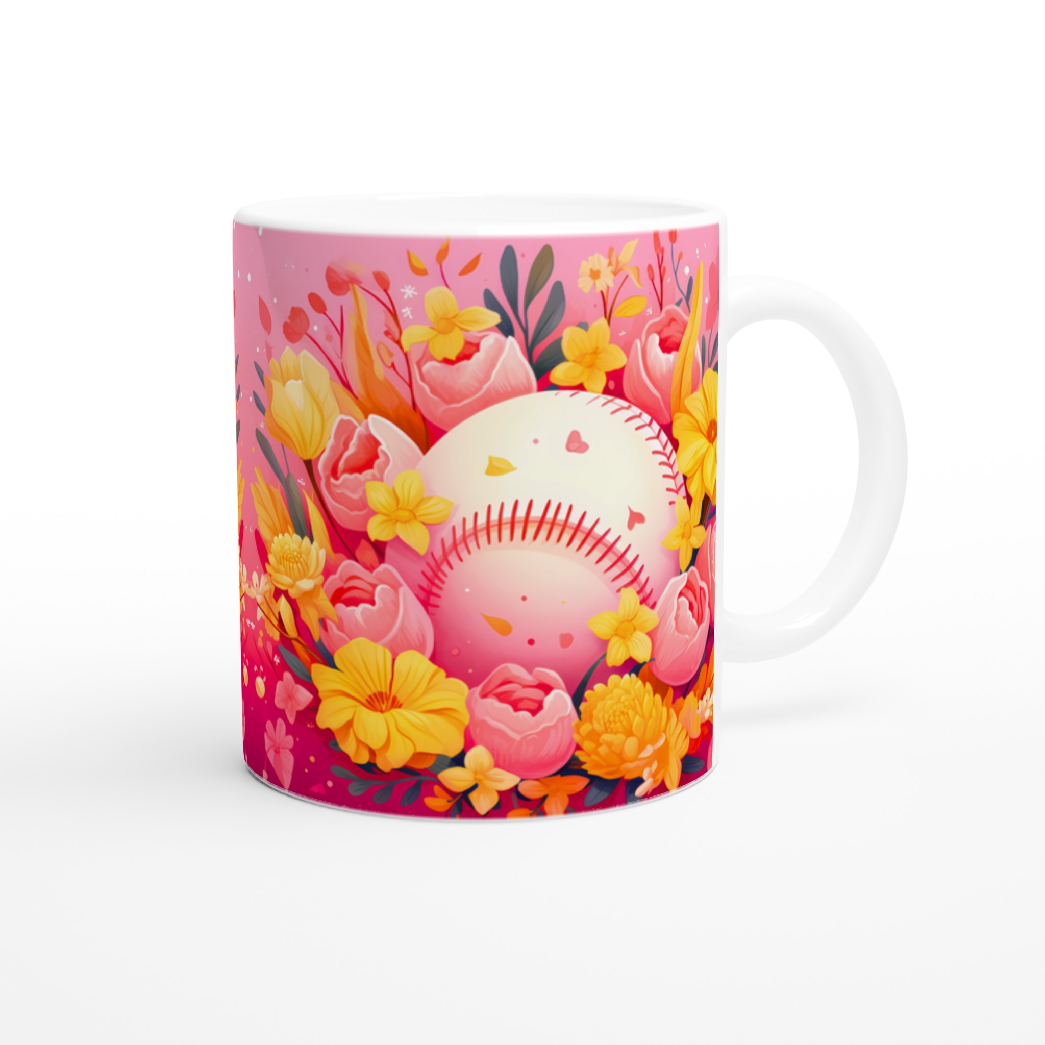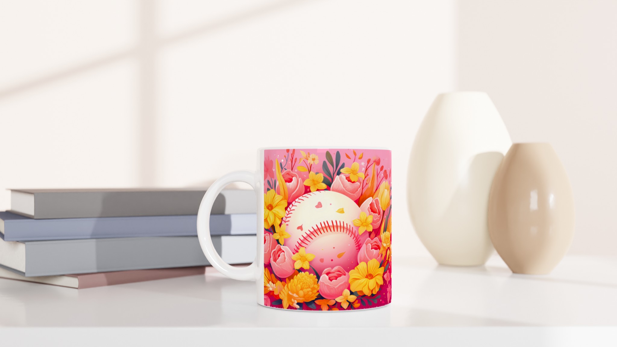 Fånga den glada känslan av vår och baseboll med denna charmiga keramiska mugg! Omsluten av en symfoni av rosa, gula och korallfärgade blommor, med en klassisk baseboll i centrum, blir denna mugg snabbt en vardagsfavorit. Perfekt för morgonkaffet, kvällens varma choklad eller när du bara vill njuta av en kopp te. Den blanka vita ytan gör att trycken framhävs med klara och levande färger, som håller sig fina även efter många turer i mikron och diskmaskinen.