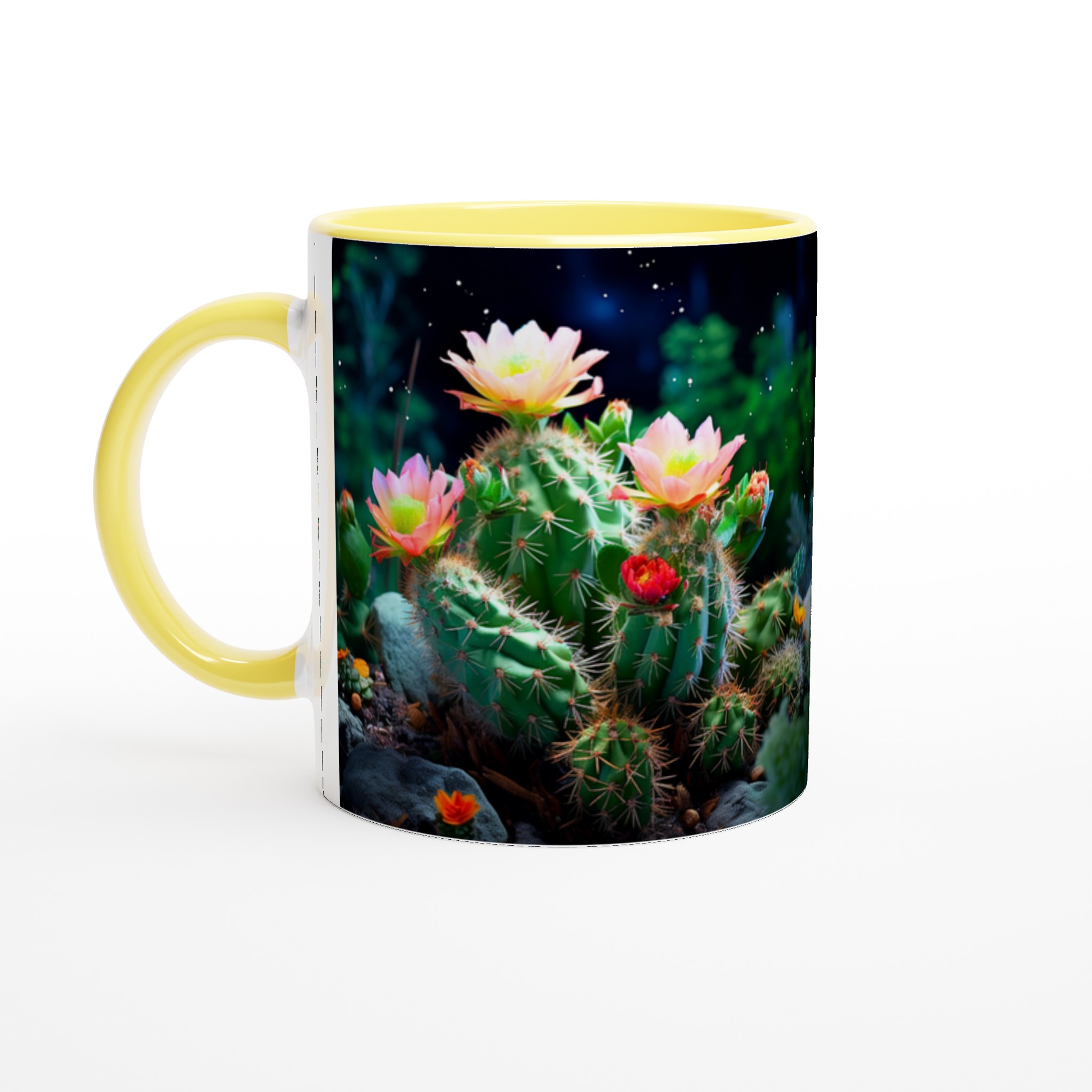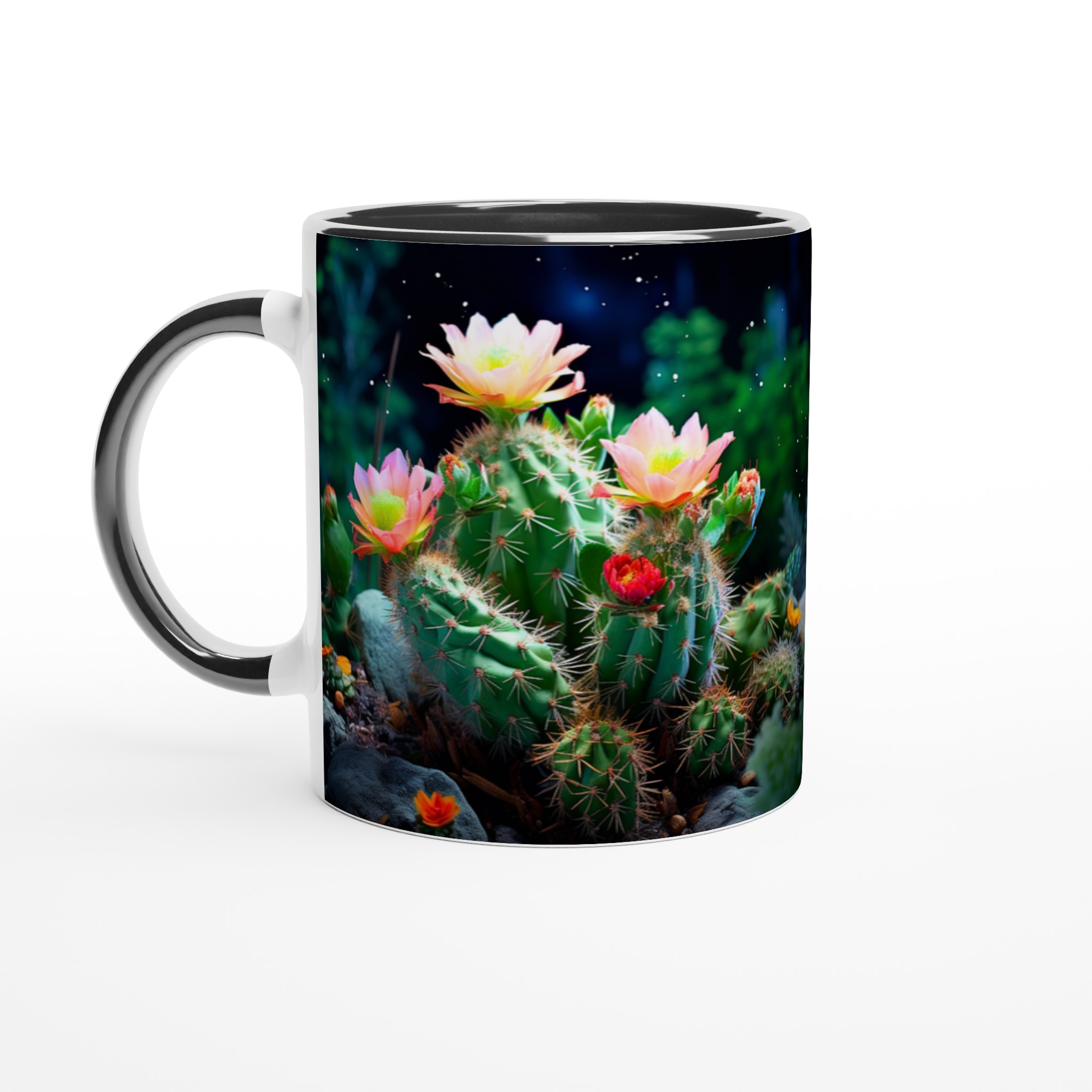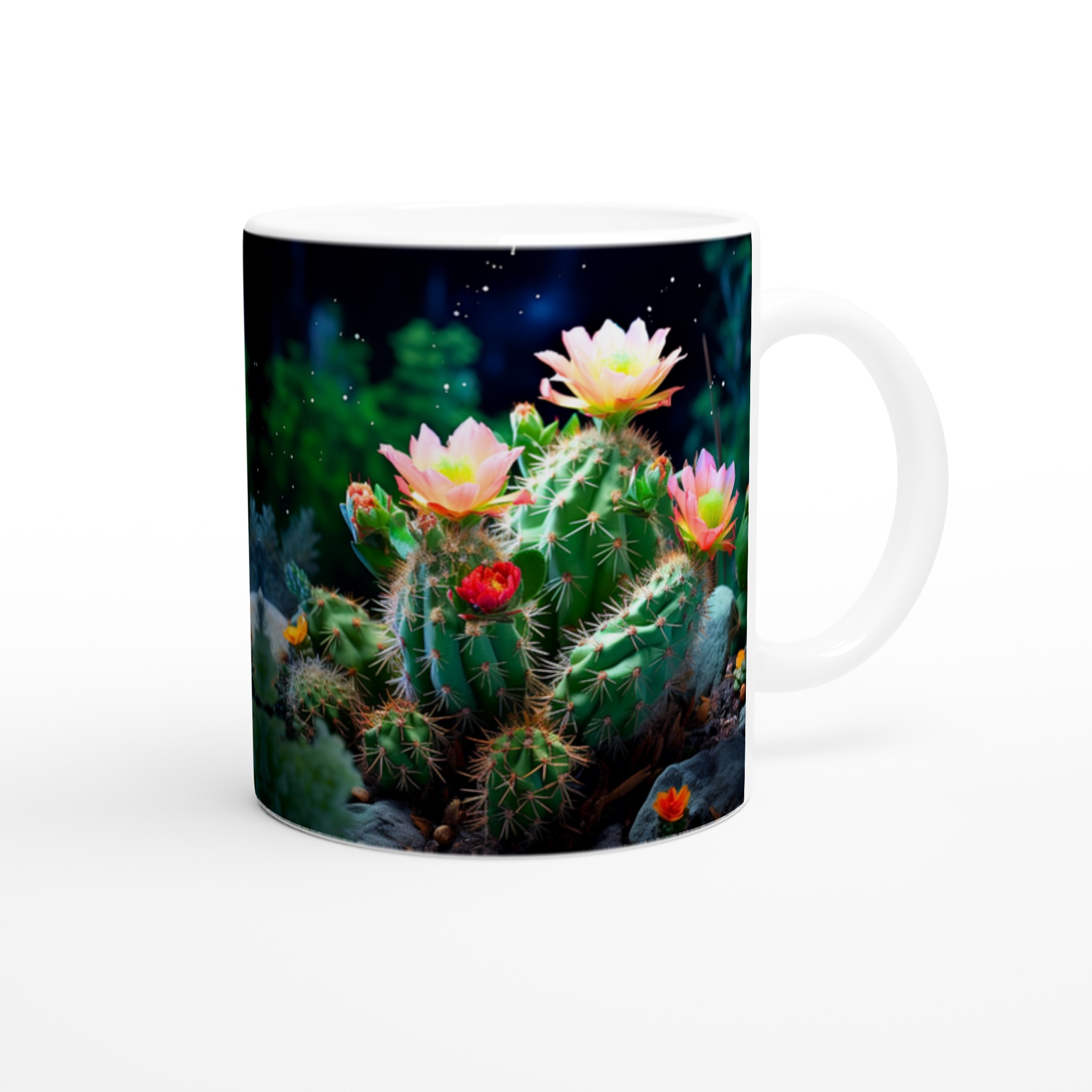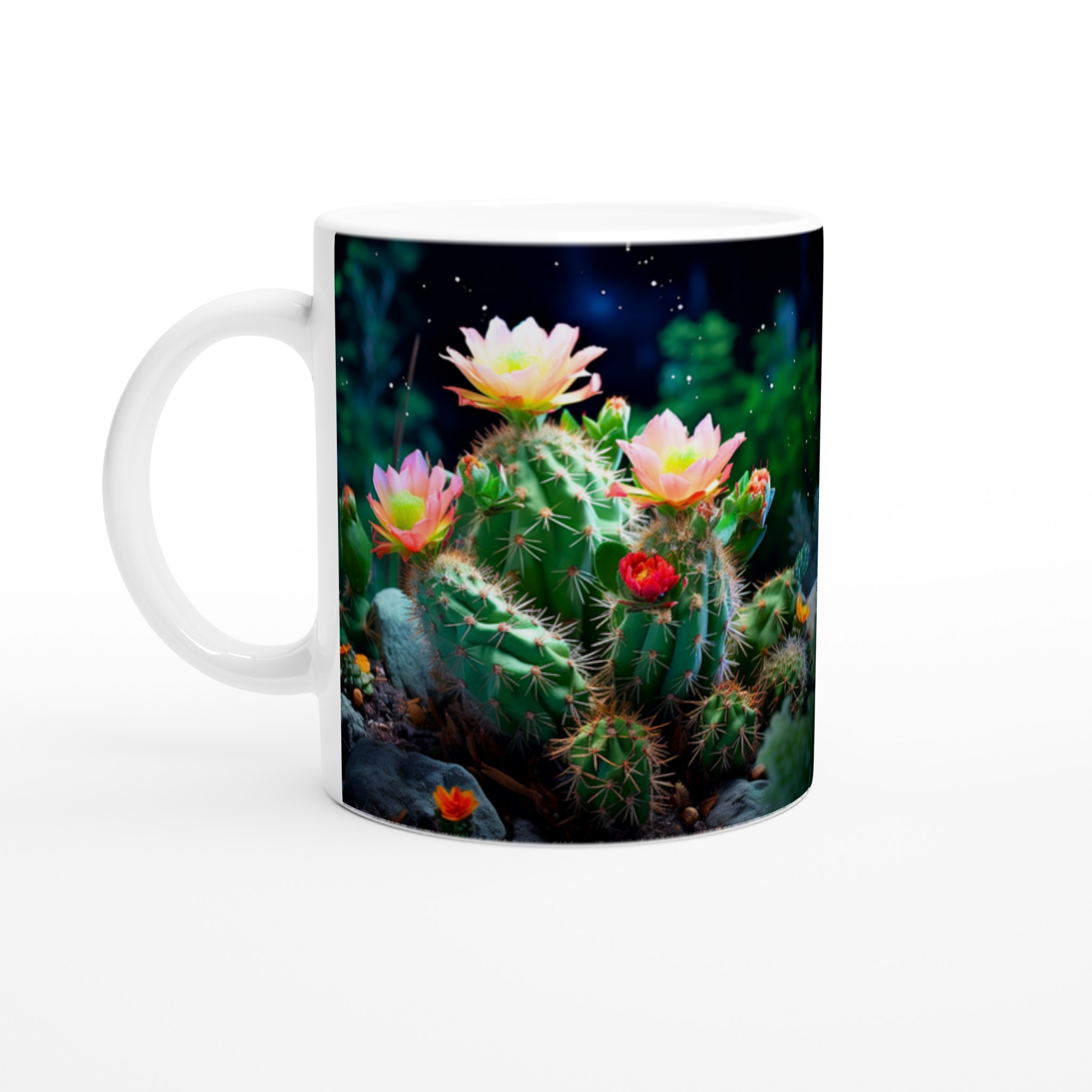 Fånga naturens förtrollande skönhet med vår Blommande Kaktus keramiska mugg. Detta motiv, inspirerat av magin hos blommande kaktusar under natthimlen, ger din fika en touch av mystik och livfulla färger. Den här stilrena keramiska muggen blir snabbt en vardagsfavorit. Perfekt för morgonkaffet, kvällens varma choklad eller när du bara vill njuta av en kopp te.