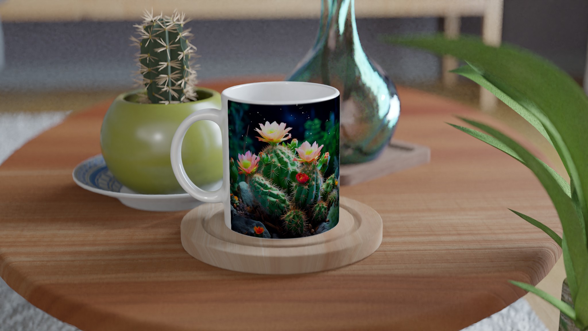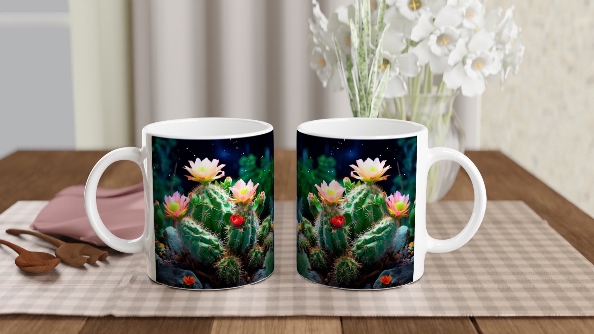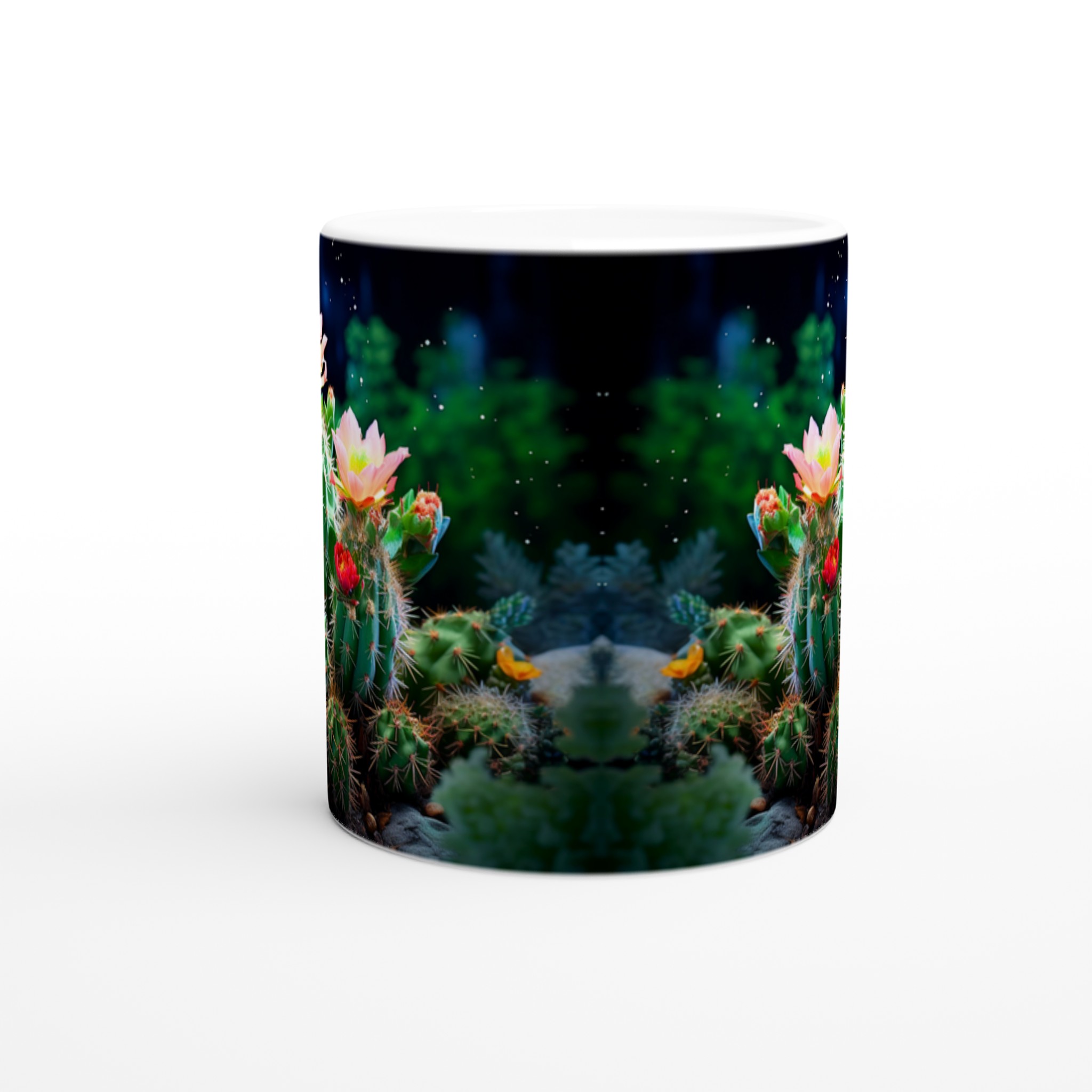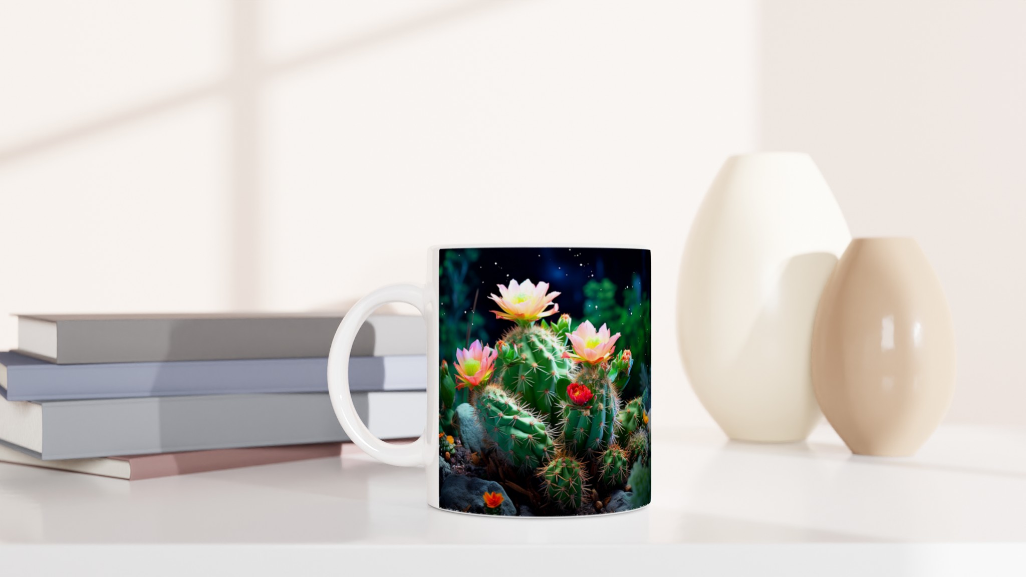 Fånga naturens förtrollande skönhet med vår Blommande Kaktus keramiska mugg. Detta motiv, inspirerat av magin hos blommande kaktusar under natthimlen, ger din fika en touch av mystik och livfulla färger. Den här stilrena keramiska muggen blir snabbt en vardagsfavorit. Perfekt för morgonkaffet, kvällens varma choklad eller när du bara vill njuta av en kopp te.