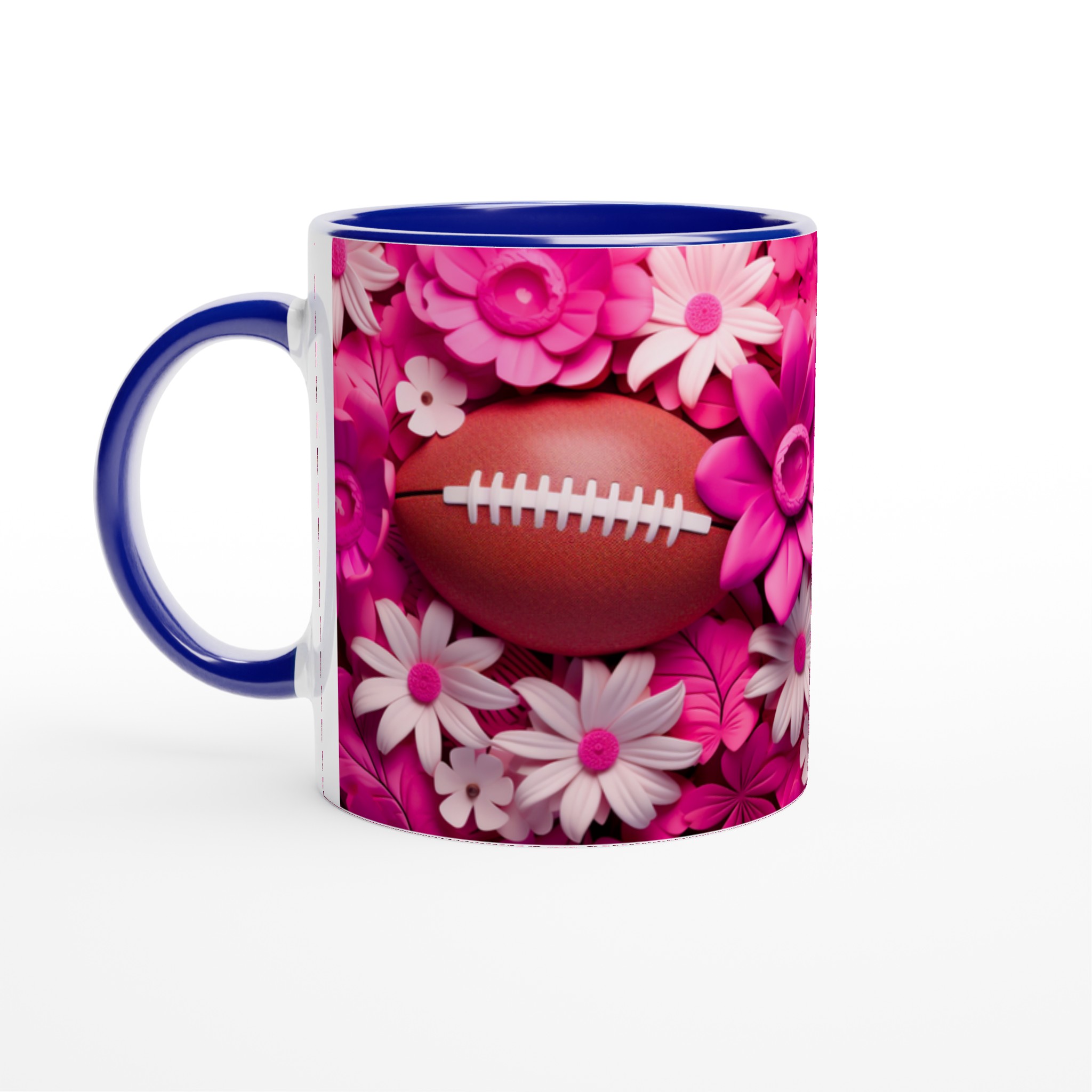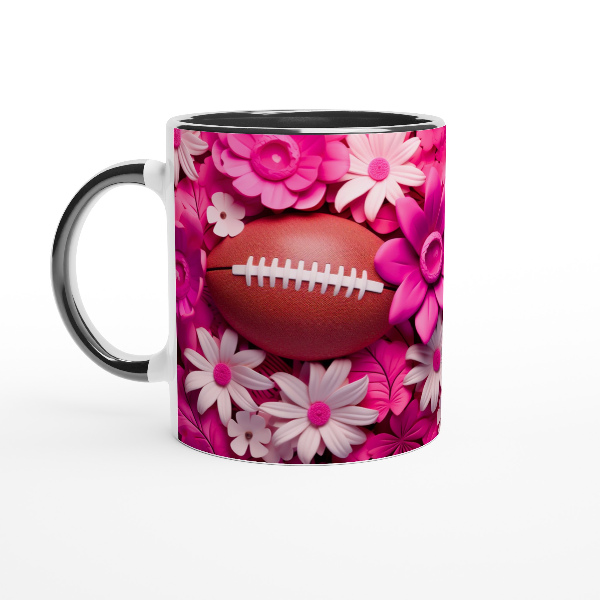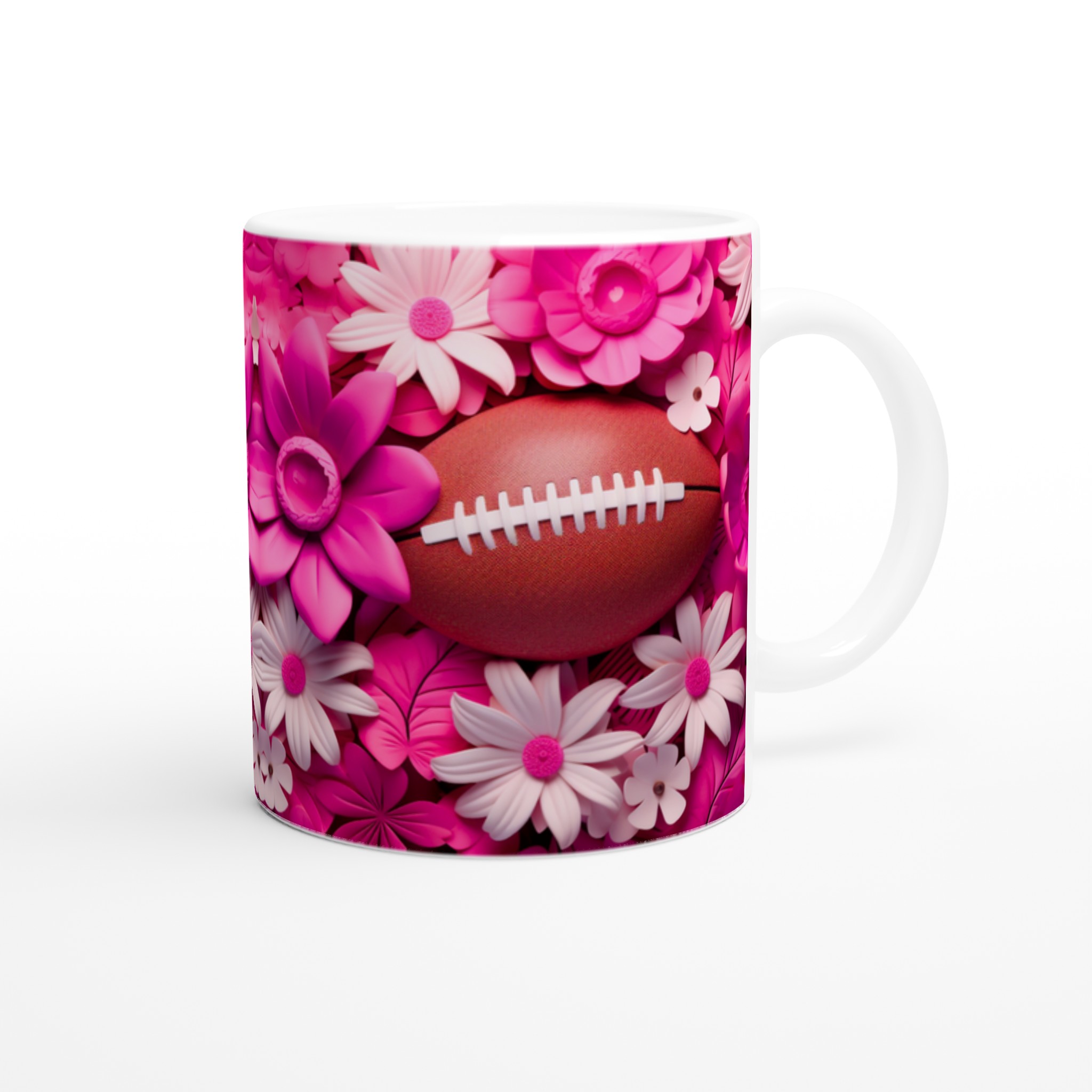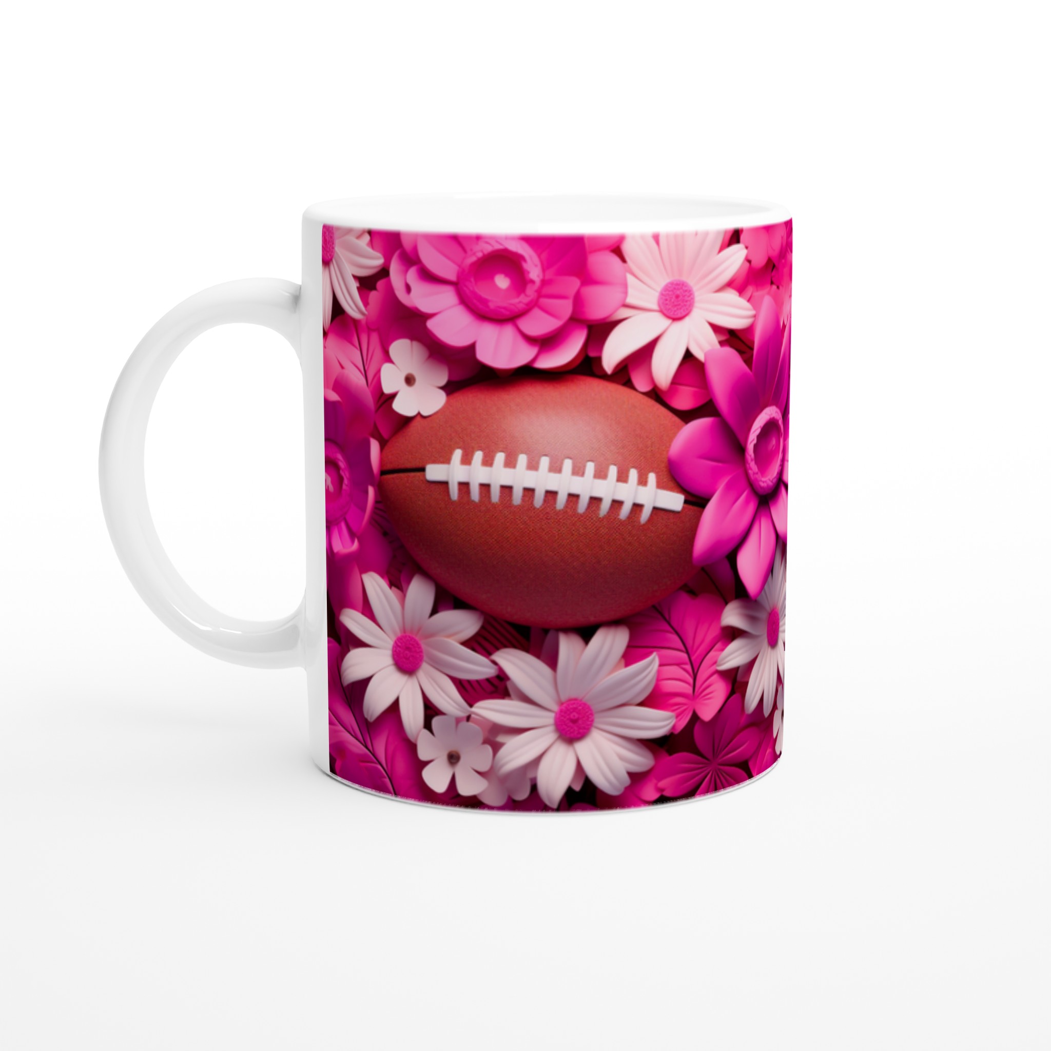 Fånga glädjen och passionen med vår unika keramiska mugg, designad med ett lekfullt motiv av amerikansk fotboll omgiven av frodiga rosa och vita blommor. Denna mugg blir snabbt en vardagsfavorit, perfekt för att starta morgonen med kaffe, mysa med varm choklad på kvällen, eller när du bara vill njuta av en kopp te med stil. Den blanka ytan framhäver trycken med klara och levande färger, som förblir lika fina även efter otaliga turer i mikron och diskmaskinen.