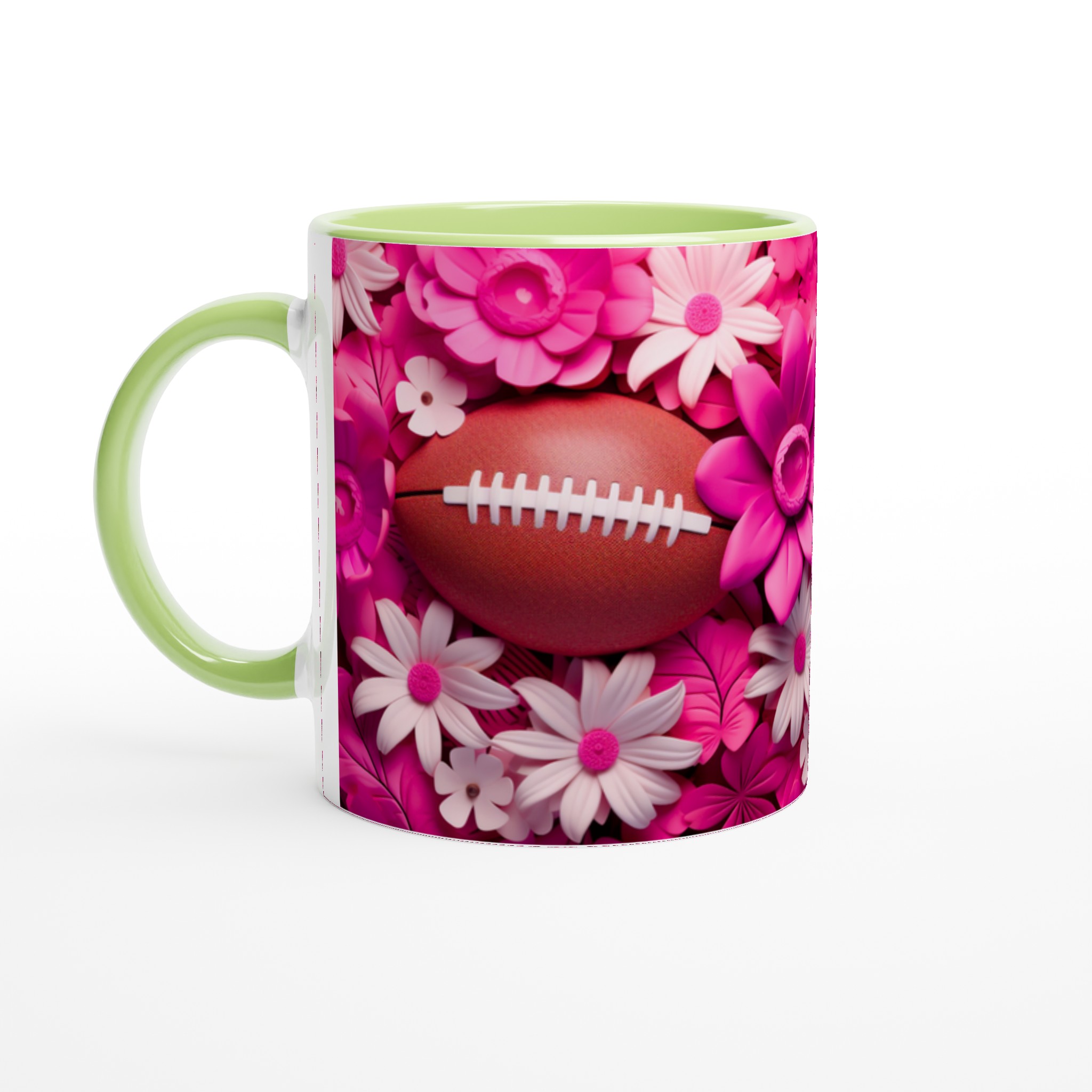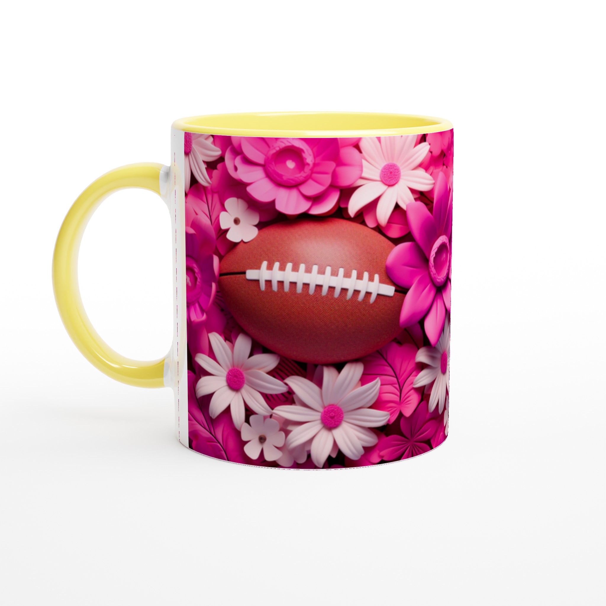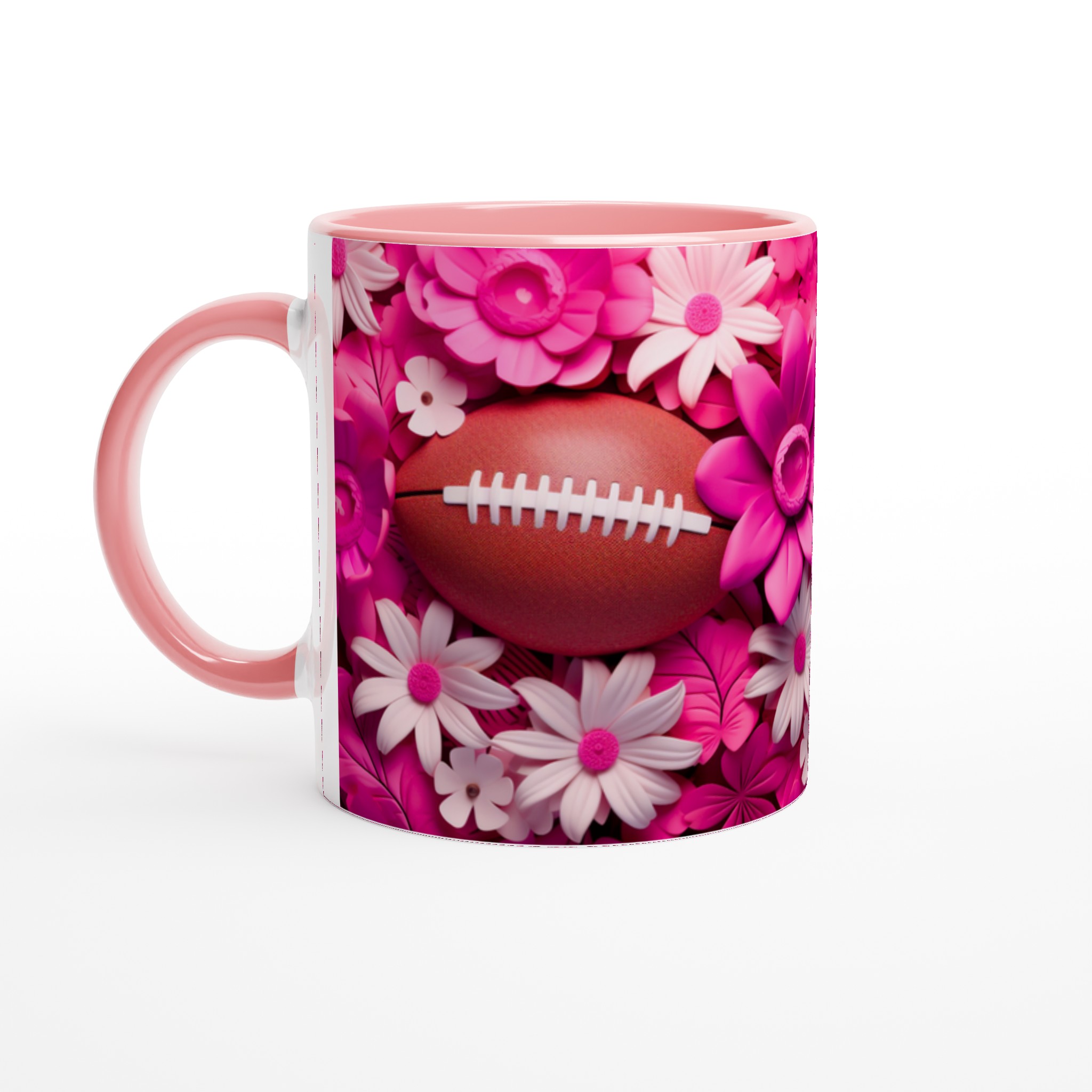 Fånga glädjen och passionen med vår unika keramiska mugg, designad med ett lekfullt motiv av amerikansk fotboll omgiven av frodiga rosa och vita blommor. Denna mugg blir snabbt en vardagsfavorit, perfekt för att starta morgonen med kaffe, mysa med varm choklad på kvällen, eller när du bara vill njuta av en kopp te med stil. Den blanka ytan framhäver trycken med klara och levande färger, som förblir lika fina även efter otaliga turer i mikron och diskmaskinen.
