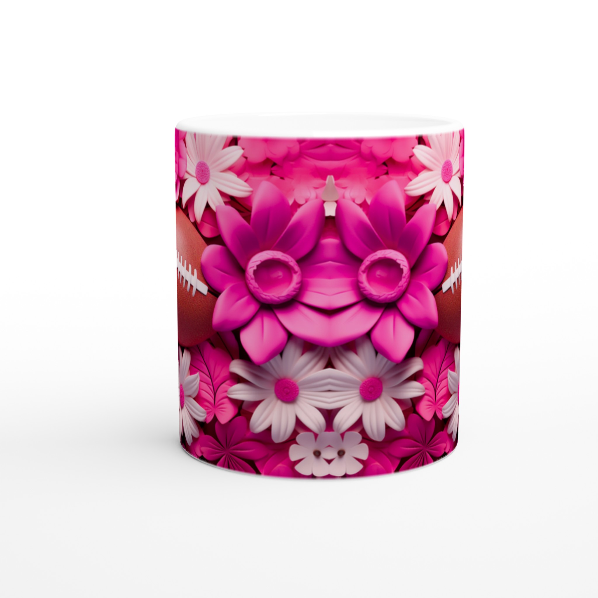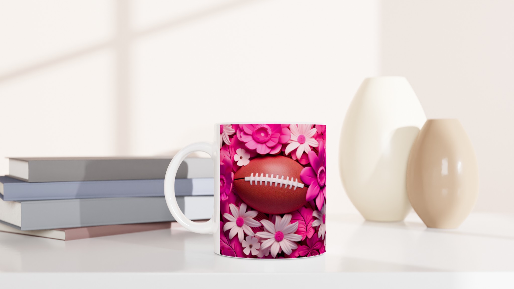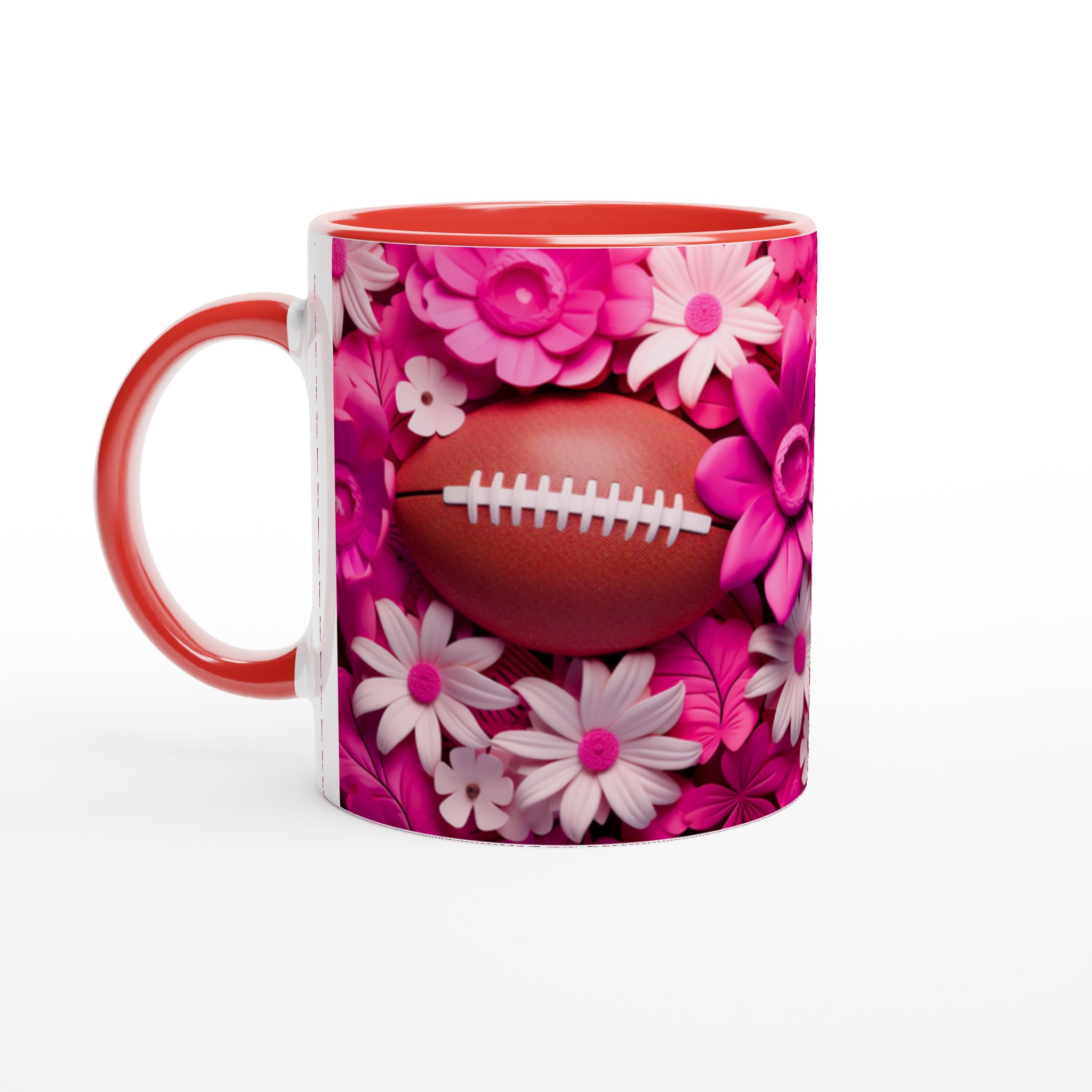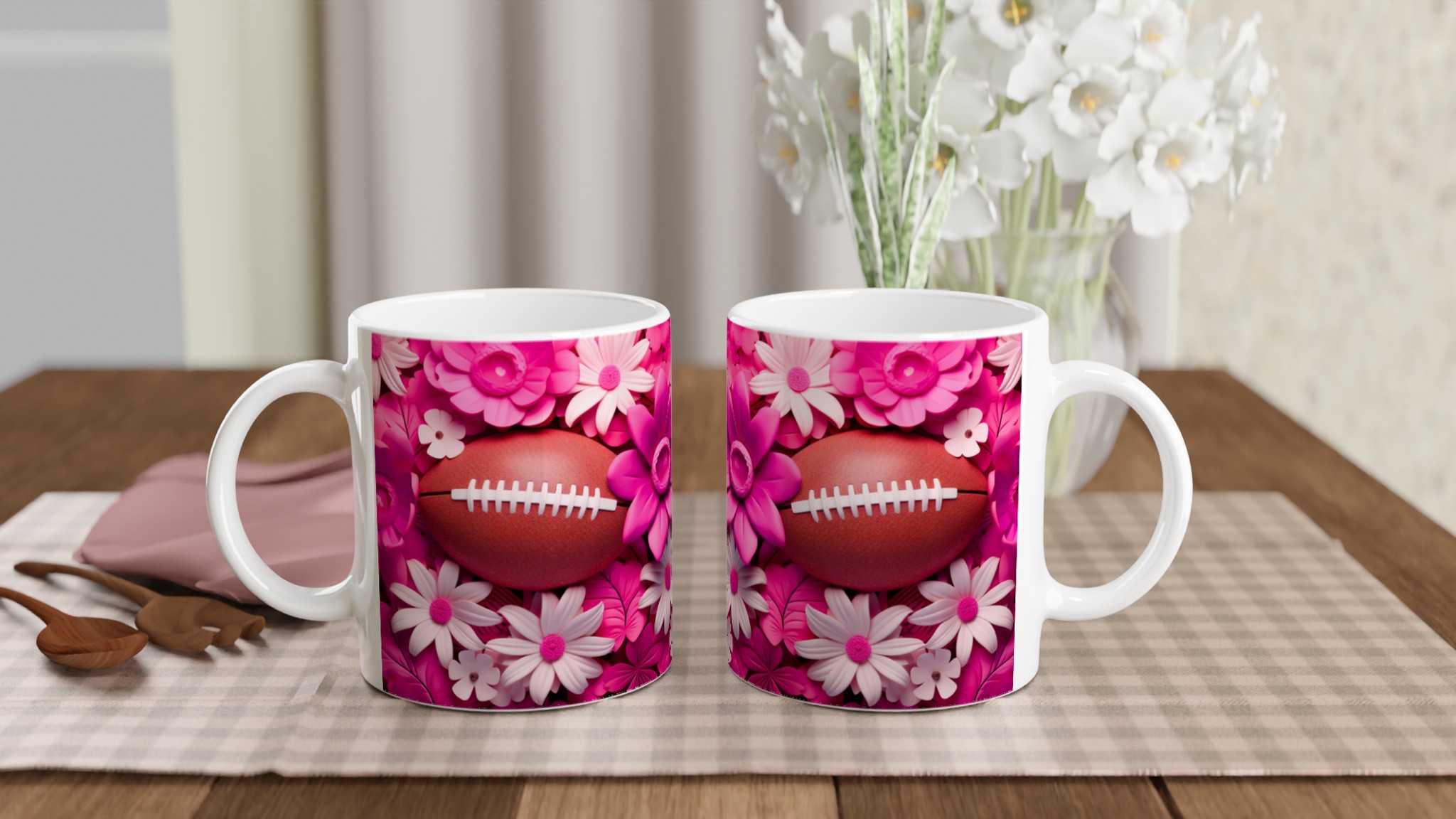 Fånga glädjen och passionen med vår unika keramiska mugg, designad med ett lekfullt motiv av amerikansk fotboll omgiven av frodiga rosa och vita blommor. Denna mugg blir snabbt en vardagsfavorit, perfekt för att starta morgonen med kaffe, mysa med varm choklad på kvällen, eller när du bara vill njuta av en kopp te med stil. Den blanka ytan framhäver trycken med klara och levande färger, som förblir lika fina även efter otaliga turer i mikron och diskmaskinen.