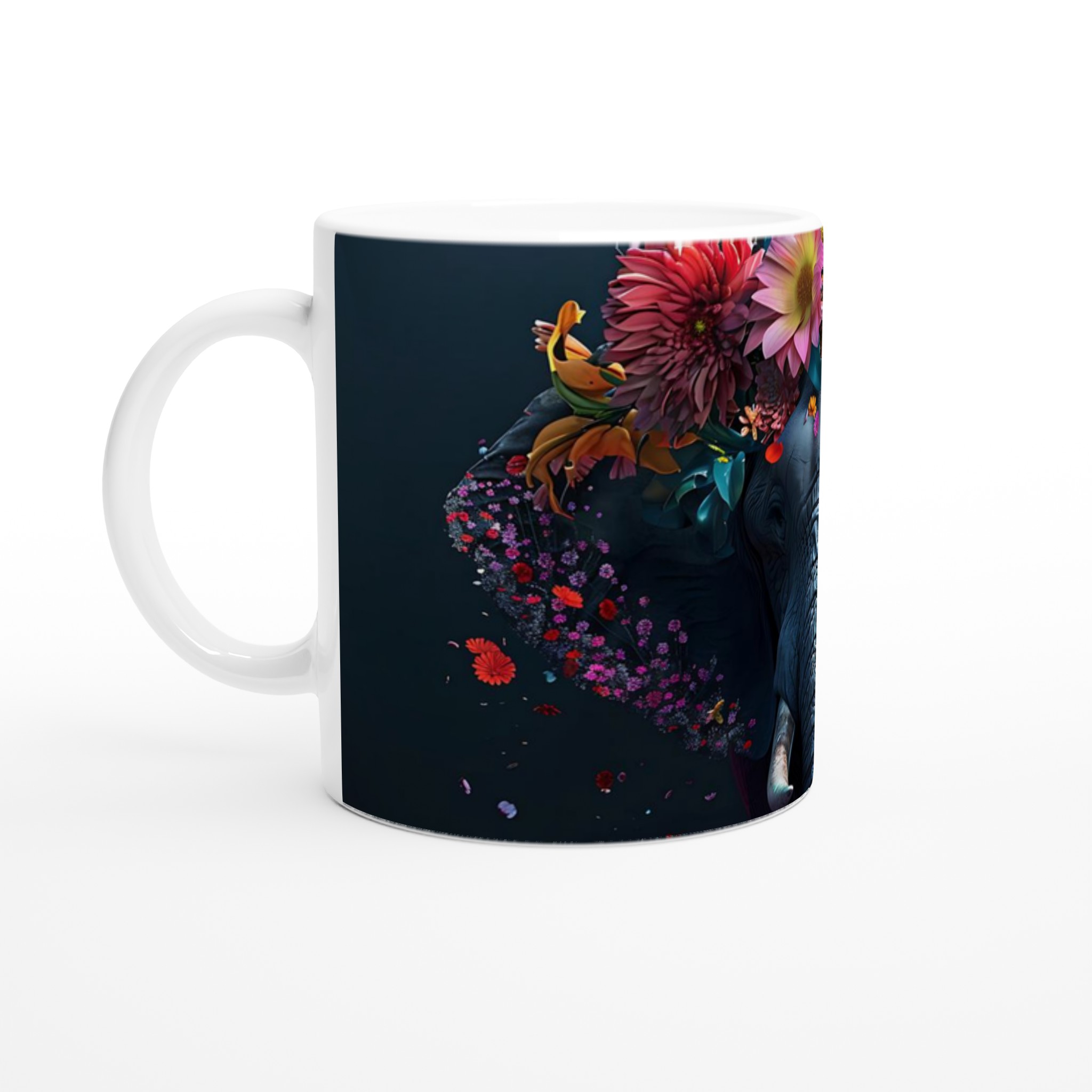 Inspirerad av den majestätiska elefanten smyckad med en krans av livfulla blommor, förvandlar denna mugg din fikapaus till en stund av lugn och skönhet. Den blanka vita ytan ger ett skarpt och levande tryck som verkligen sticker ut, oavsett om det är en personlig design, ett roligt citat eller en present till någon du tycker om.