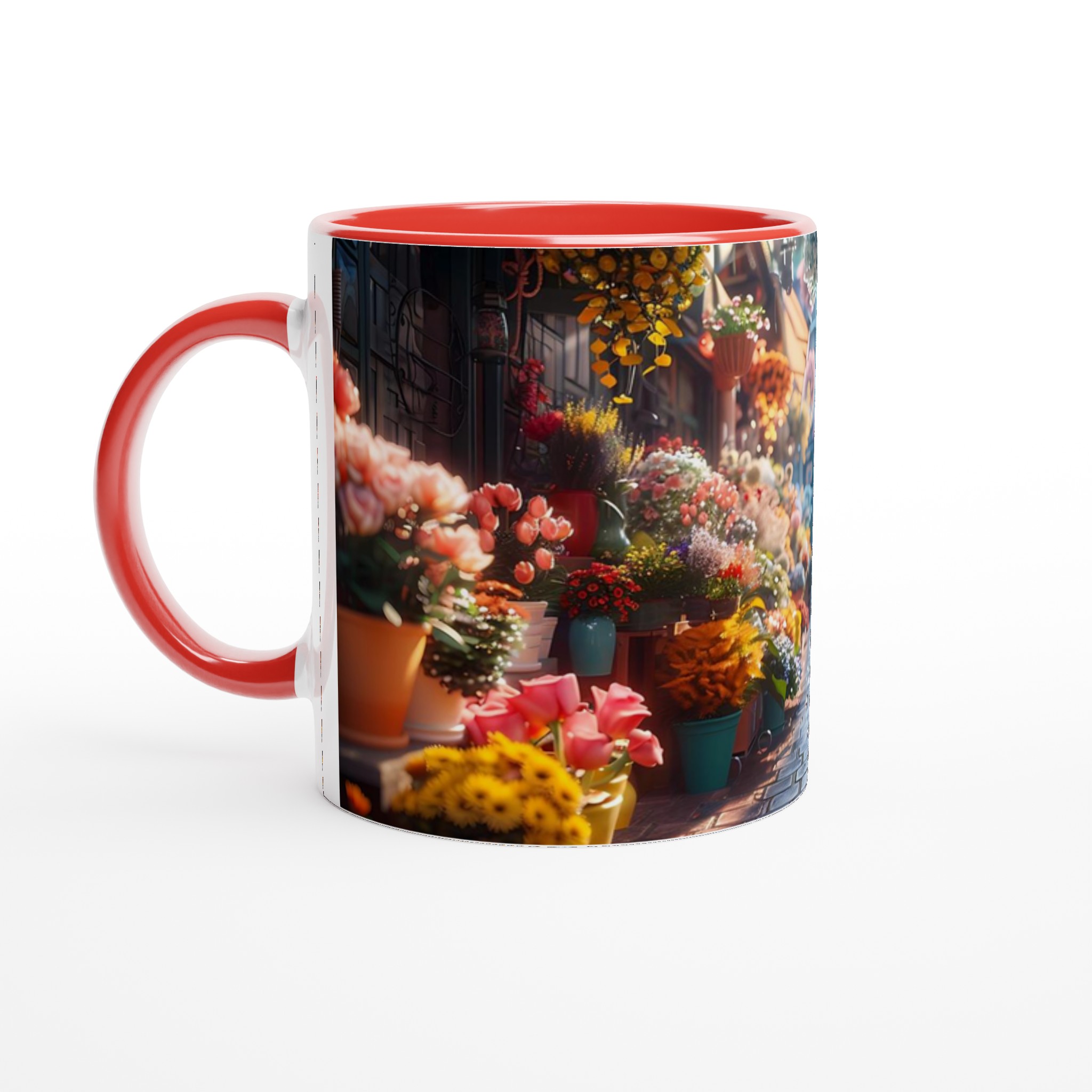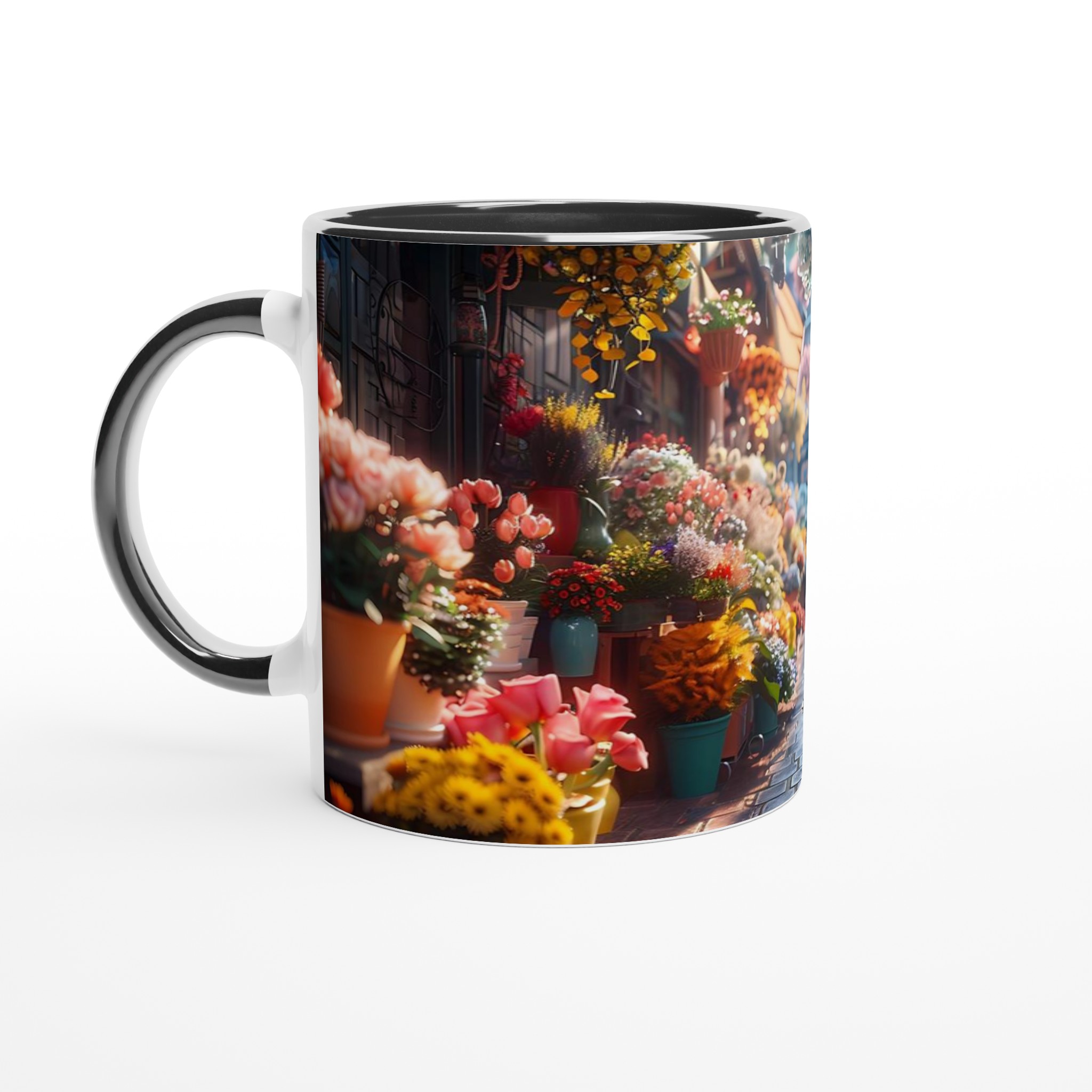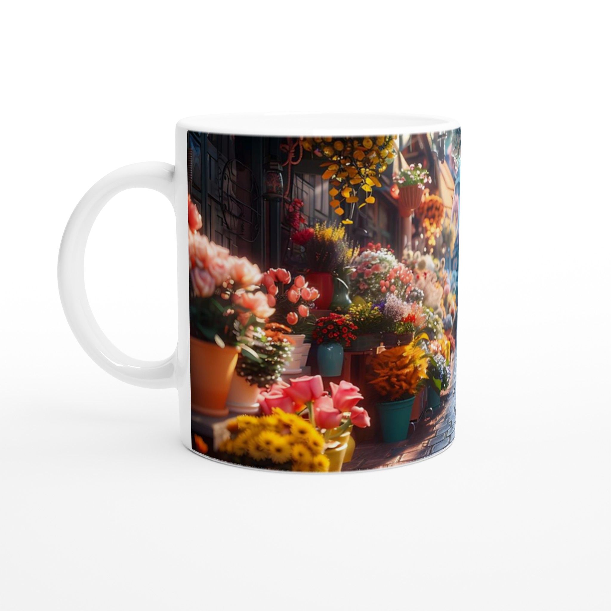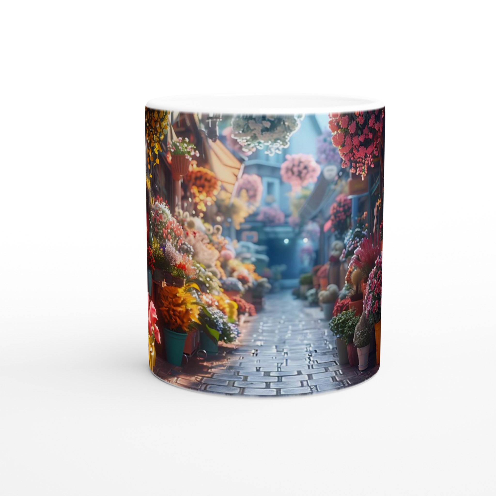 Föreställ dig en mysig blomstrande gränd, fylld med livfulla färger och en känsla av lugn – den känslan vill vi förmedla med vår Keramiska Mugg. Den här stilrena muggen blir snabbt en vardagsfavorit. Perfekt för morgonkaffet, kvällens varma choklad eller när du bara vill njuta av en kopp te. Den blanka ytan gör att trycken framhävs med klara och levande färger, som håller sig fina även efter många turer i mikron och diskmaskinen.