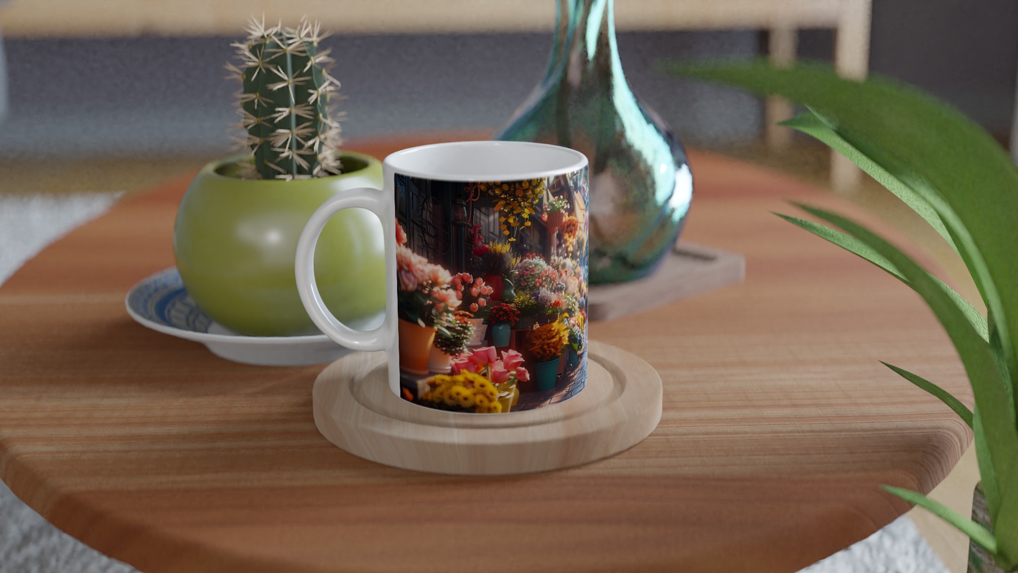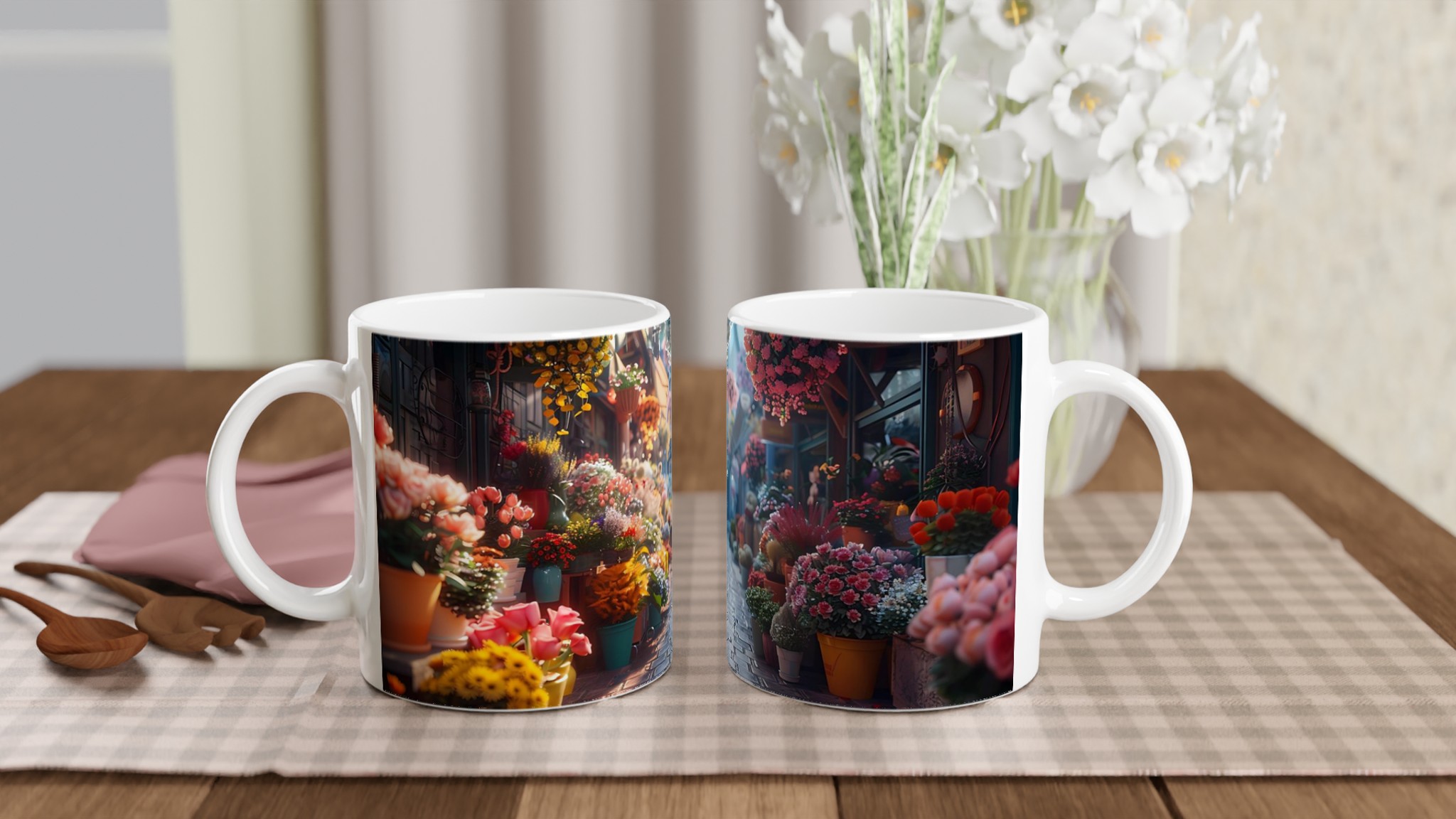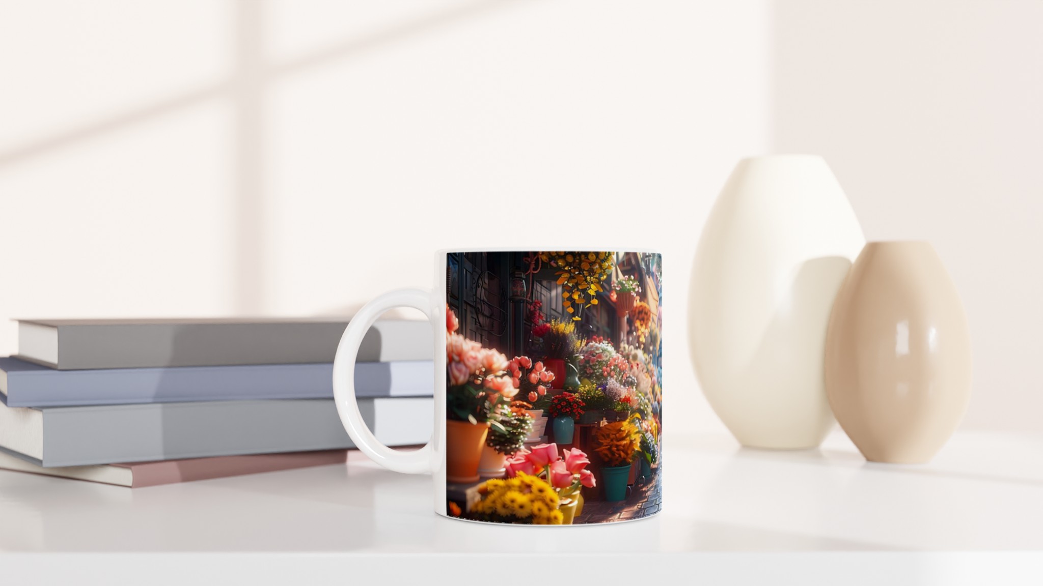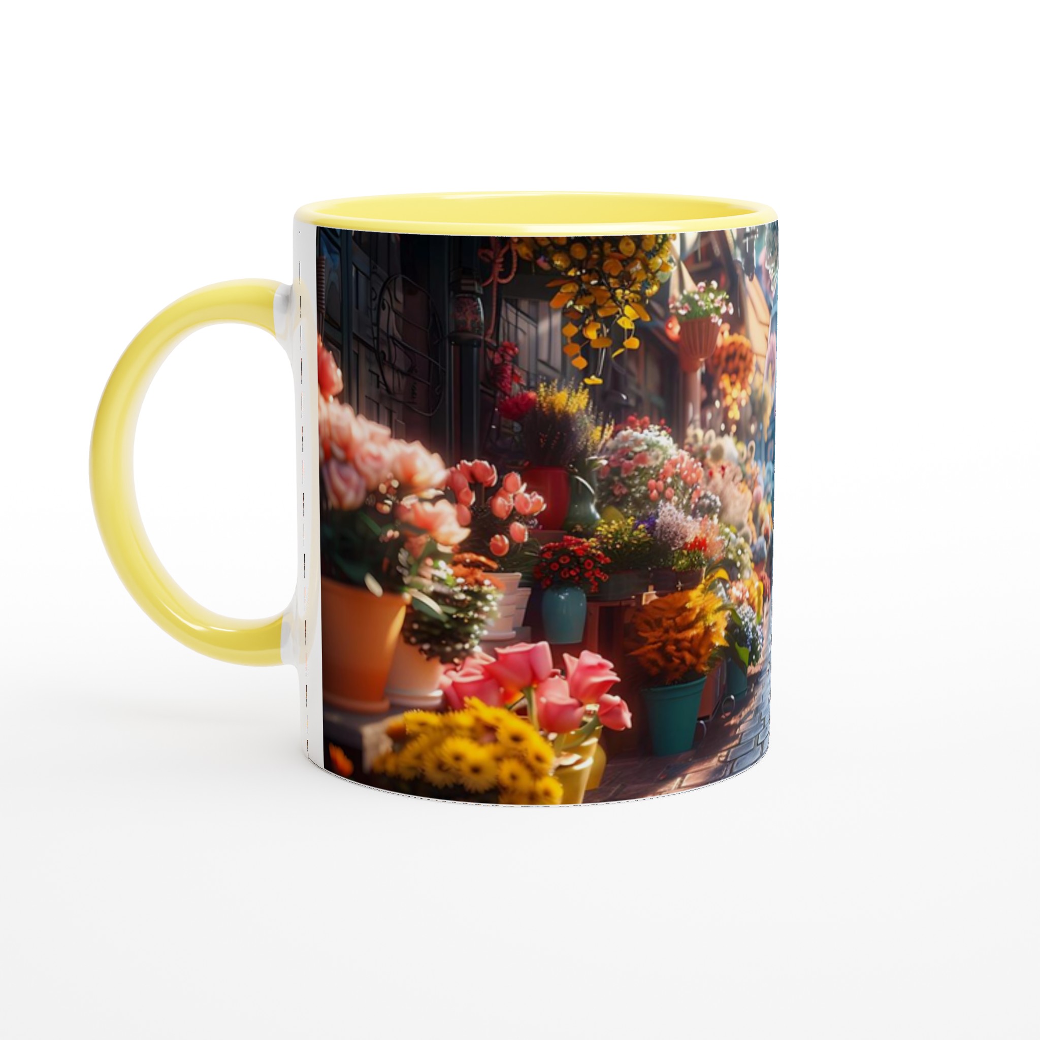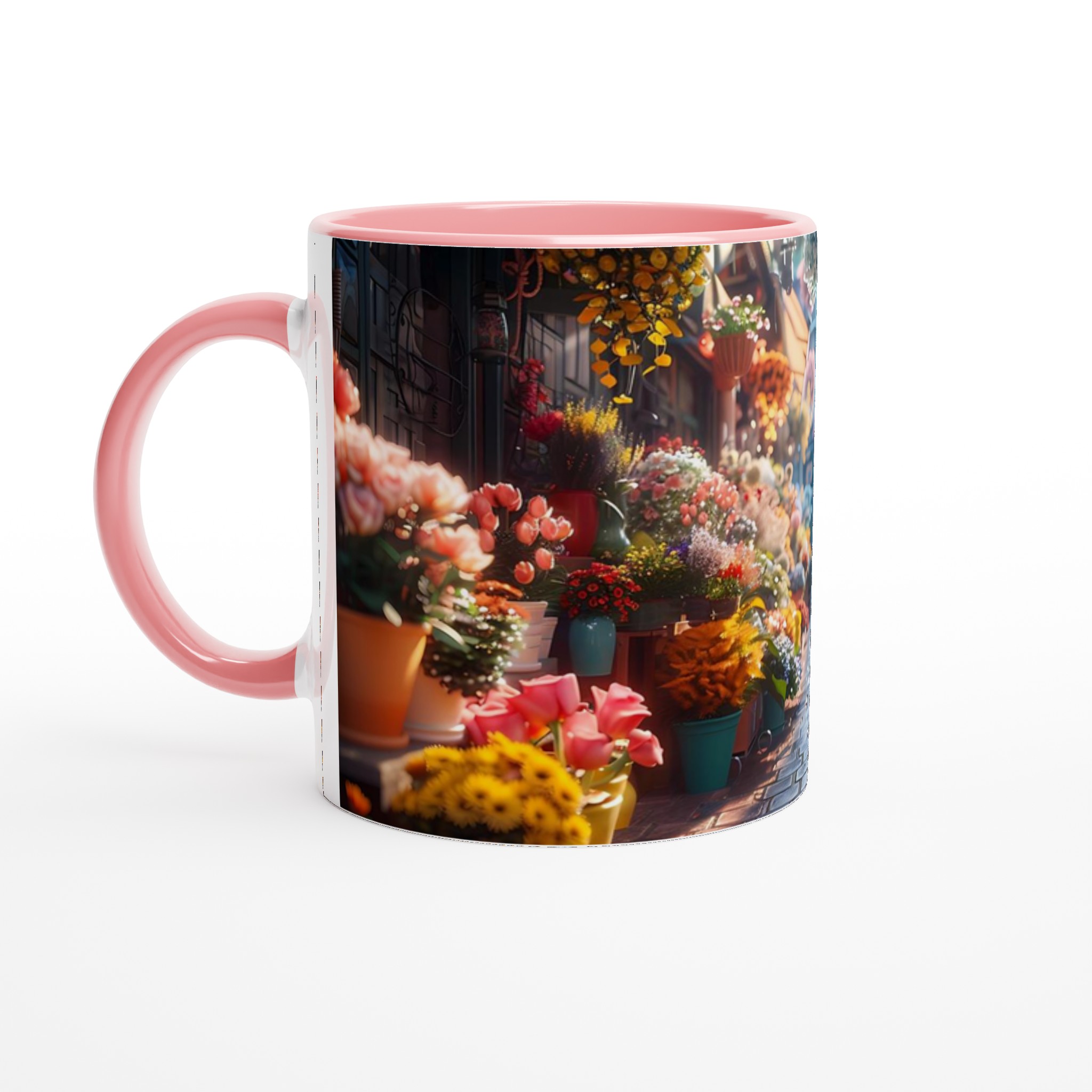 Föreställ dig en mysig blomstrande gränd, fylld med livfulla färger och en känsla av lugn – den känslan vill vi förmedla med vår Keramiska Mugg. Den här stilrena muggen blir snabbt en vardagsfavorit. Perfekt för morgonkaffet, kvällens varma choklad eller när du bara vill njuta av en kopp te. Den blanka ytan gör att trycken framhävs med klara och levande färger, som håller sig fina även efter många turer i mikron och diskmaskinen.