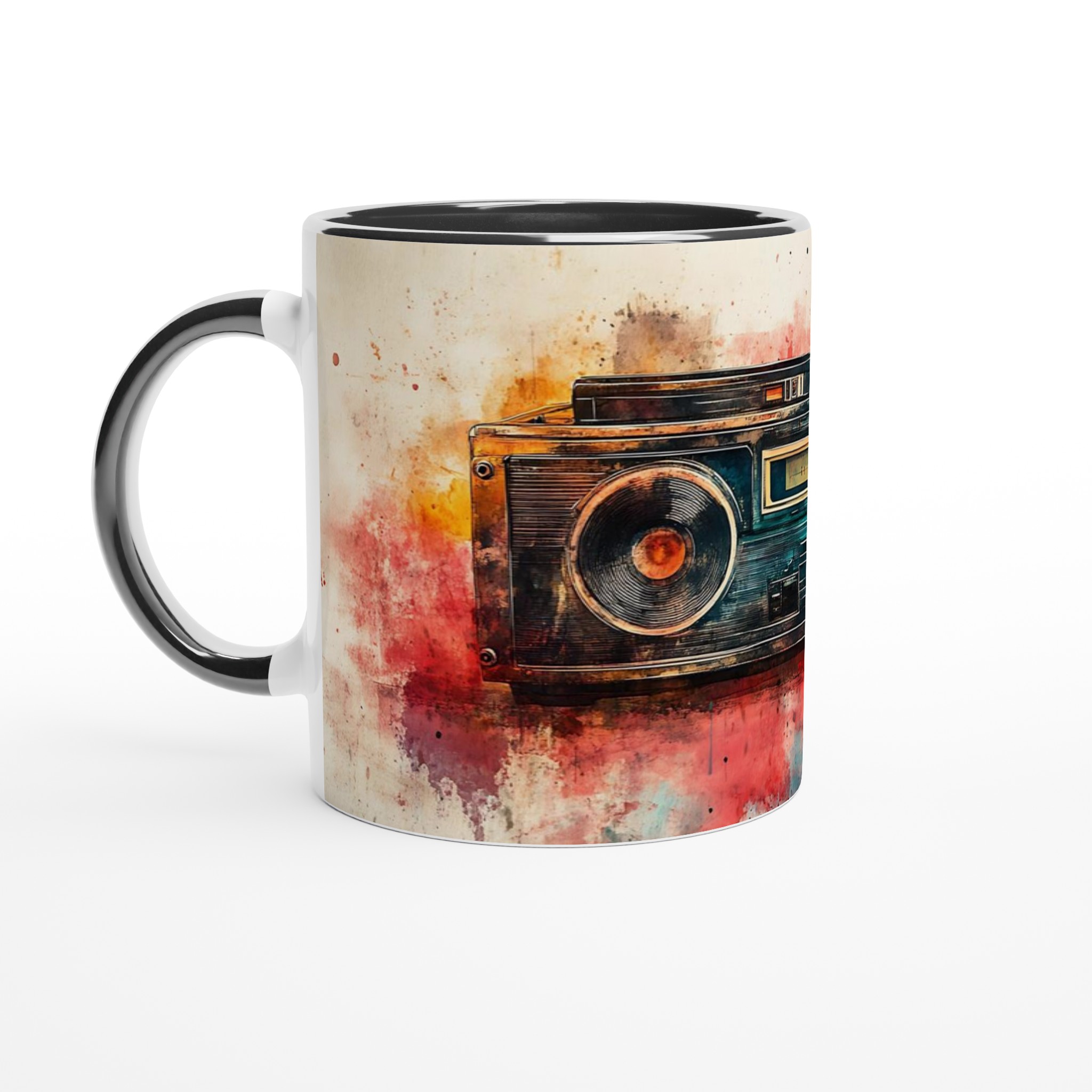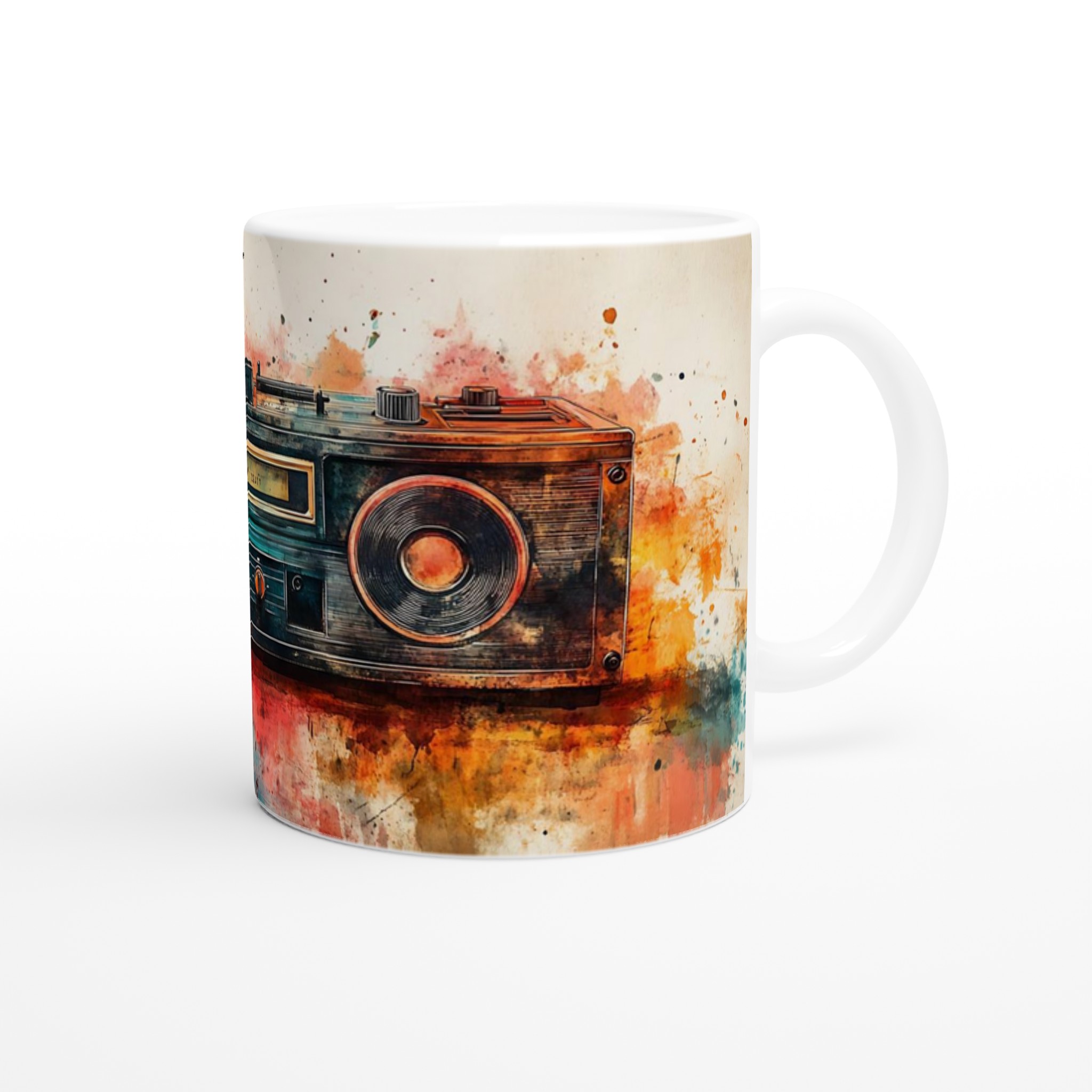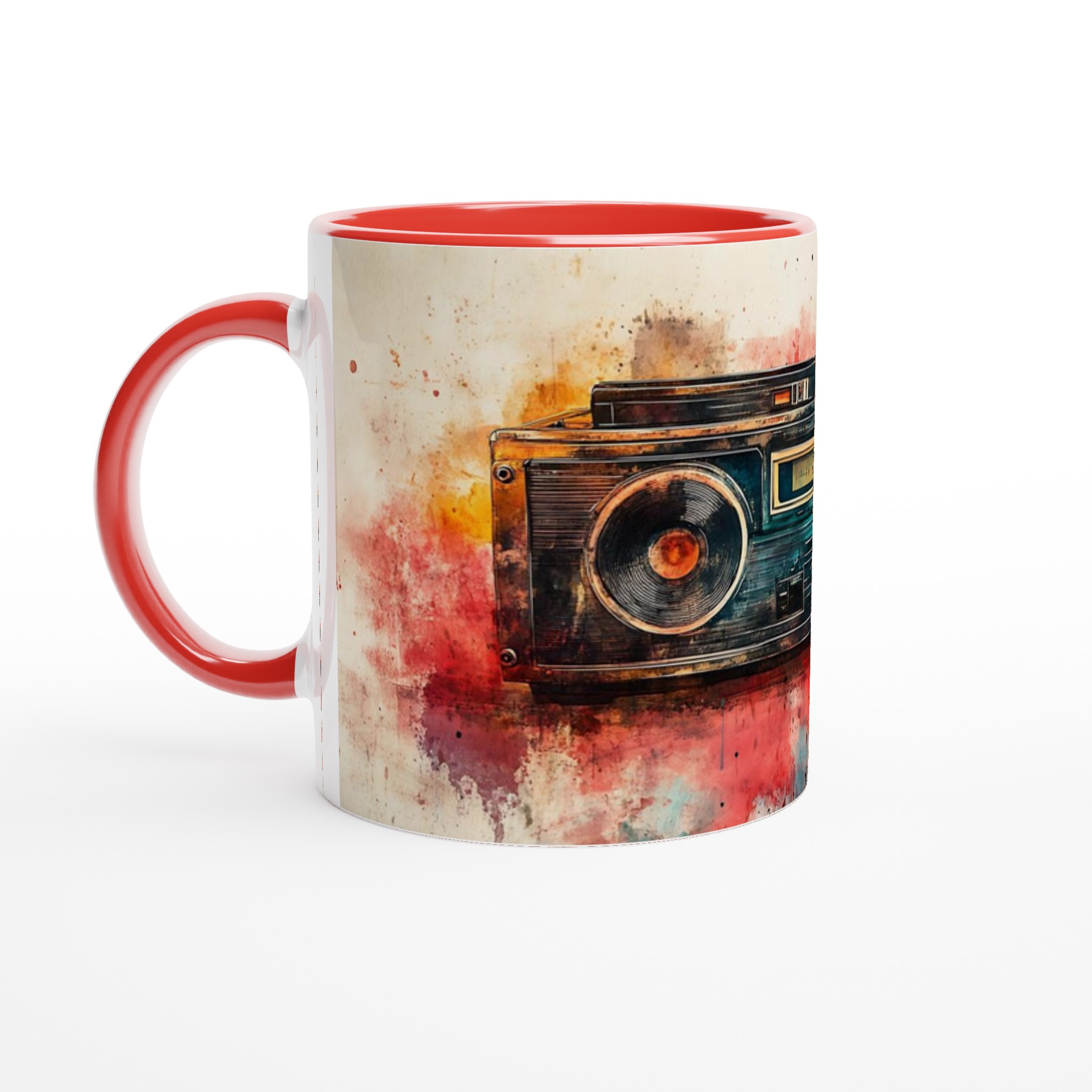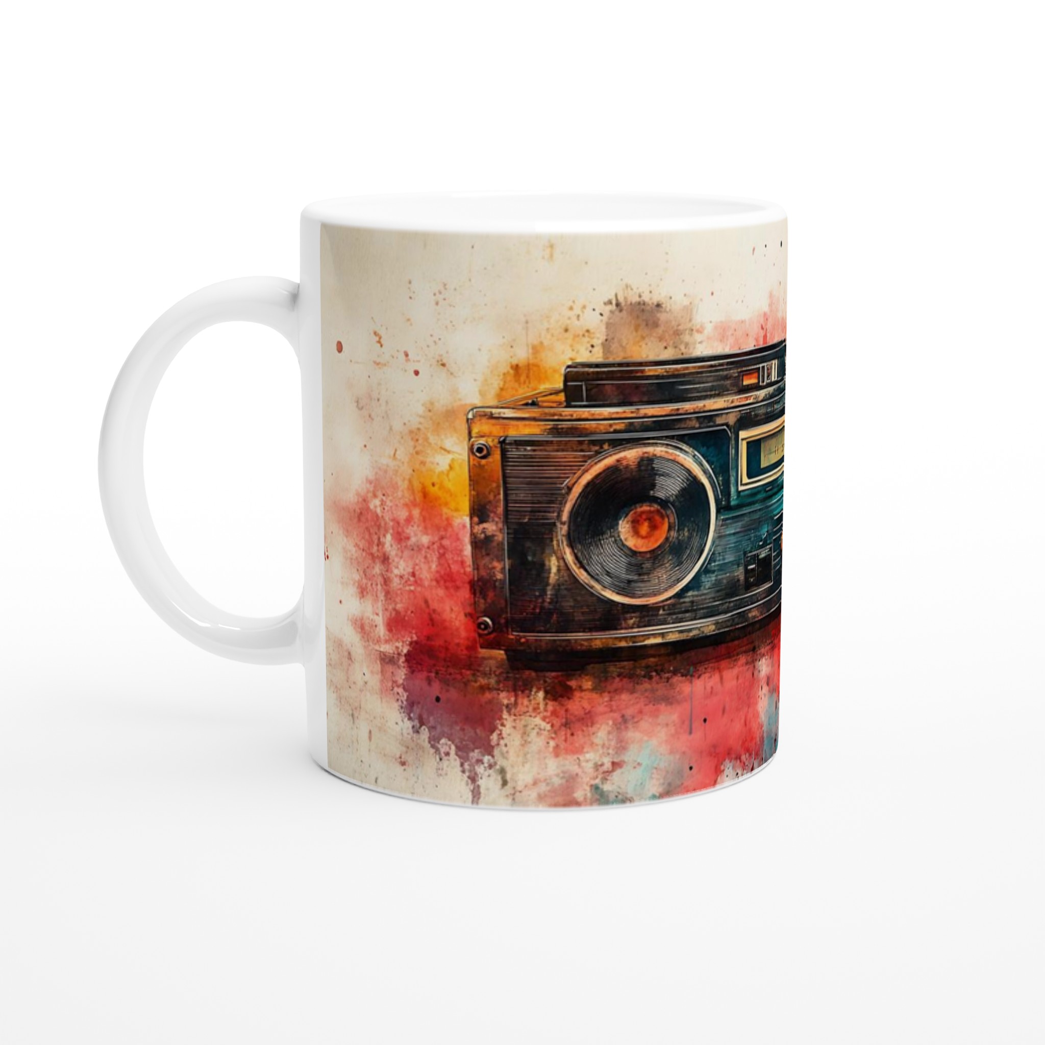 Väck dina sinnen med en touch av nostalgi! Denna unika keramiska mugg förvandlar din fikastund till en konstupplevelse, med ett levande akvarelltryck av en klassisk boombox. Färgsprakande nyanser av rött, orange, blått och brunt smälter samman och ger varje sip en retro-inspirerad, kreativ känsla. Det här blir snabbt en vardagsfavorit, perfekt för morgonkaffet, kvällens varma choklad eller när du bara vill njuta av en kopp te.