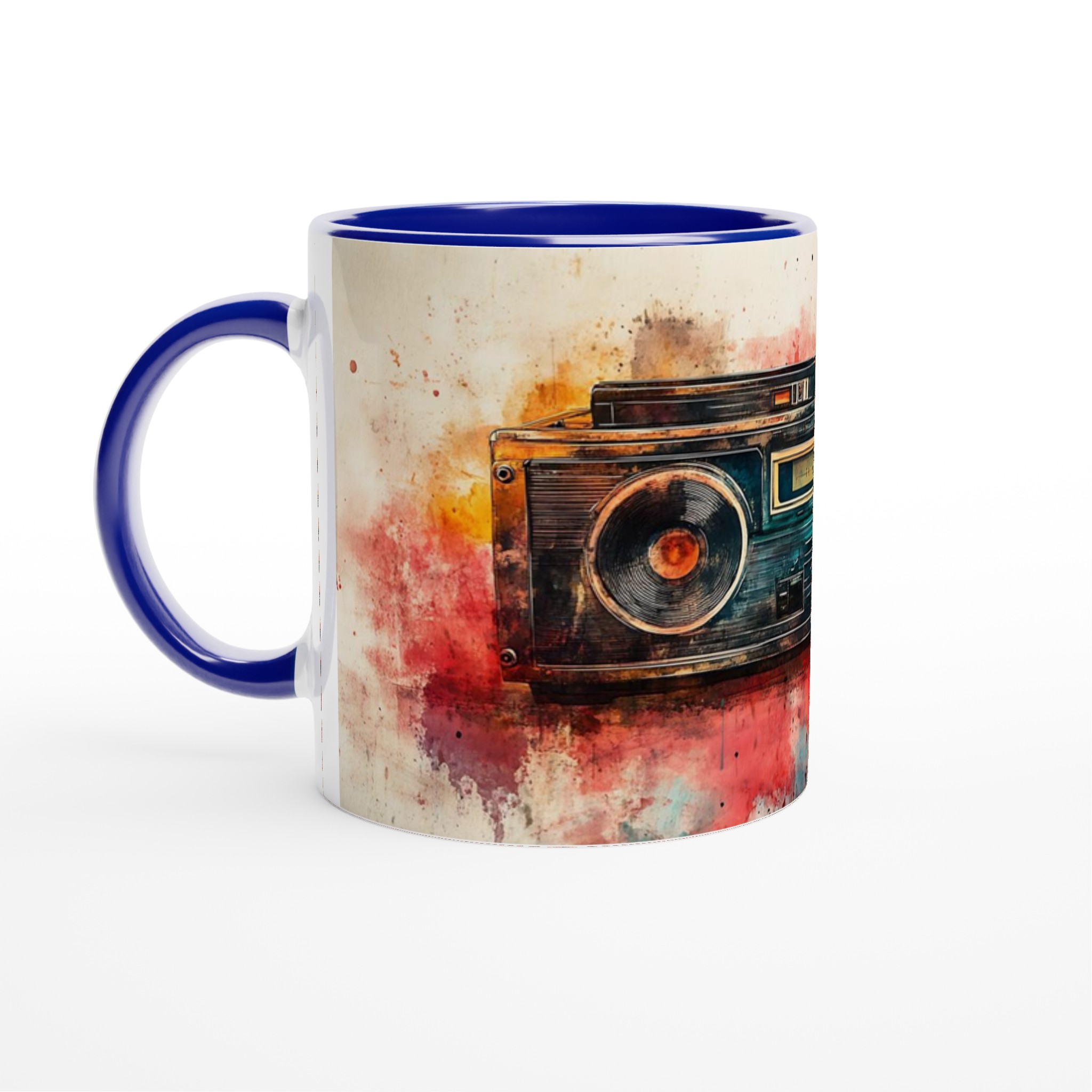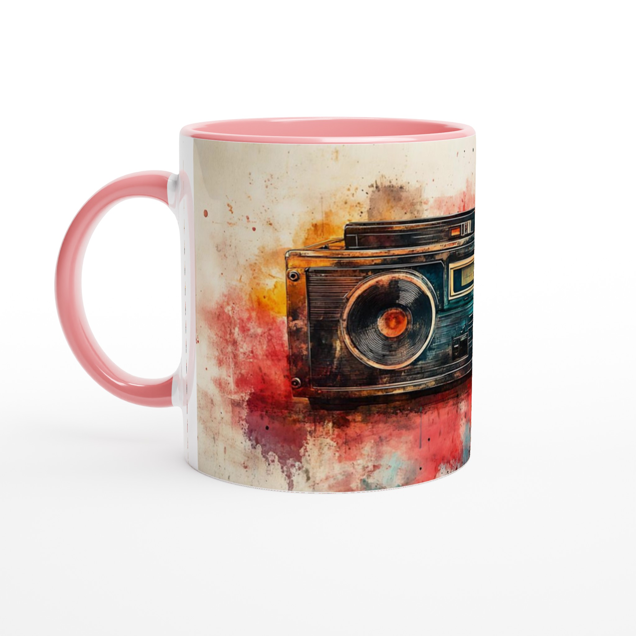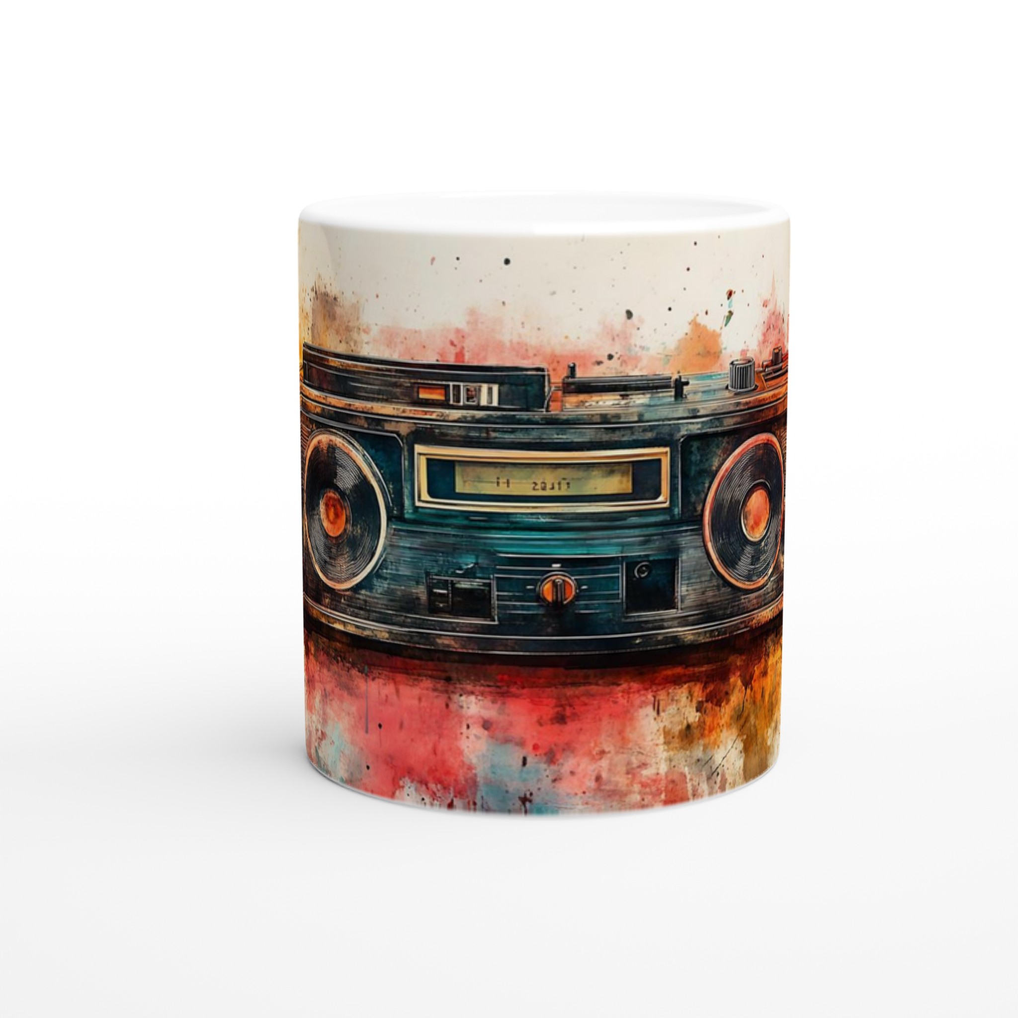 Väck dina sinnen med en touch av nostalgi! Denna unika keramiska mugg förvandlar din fikastund till en konstupplevelse, med ett levande akvarelltryck av en klassisk boombox. Färgsprakande nyanser av rött, orange, blått och brunt smälter samman och ger varje sip en retro-inspirerad, kreativ känsla. Det här blir snabbt en vardagsfavorit, perfekt för morgonkaffet, kvällens varma choklad eller när du bara vill njuta av en kopp te.