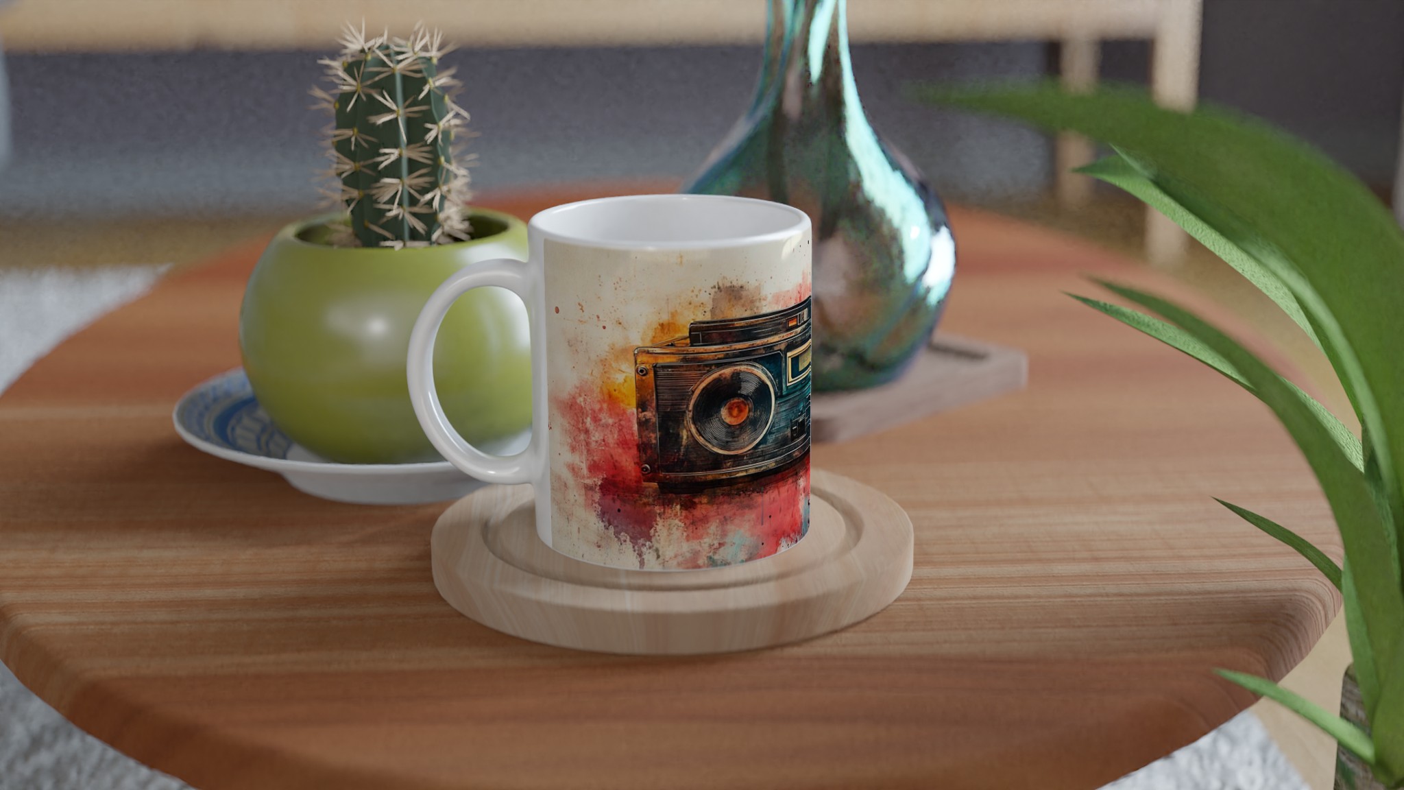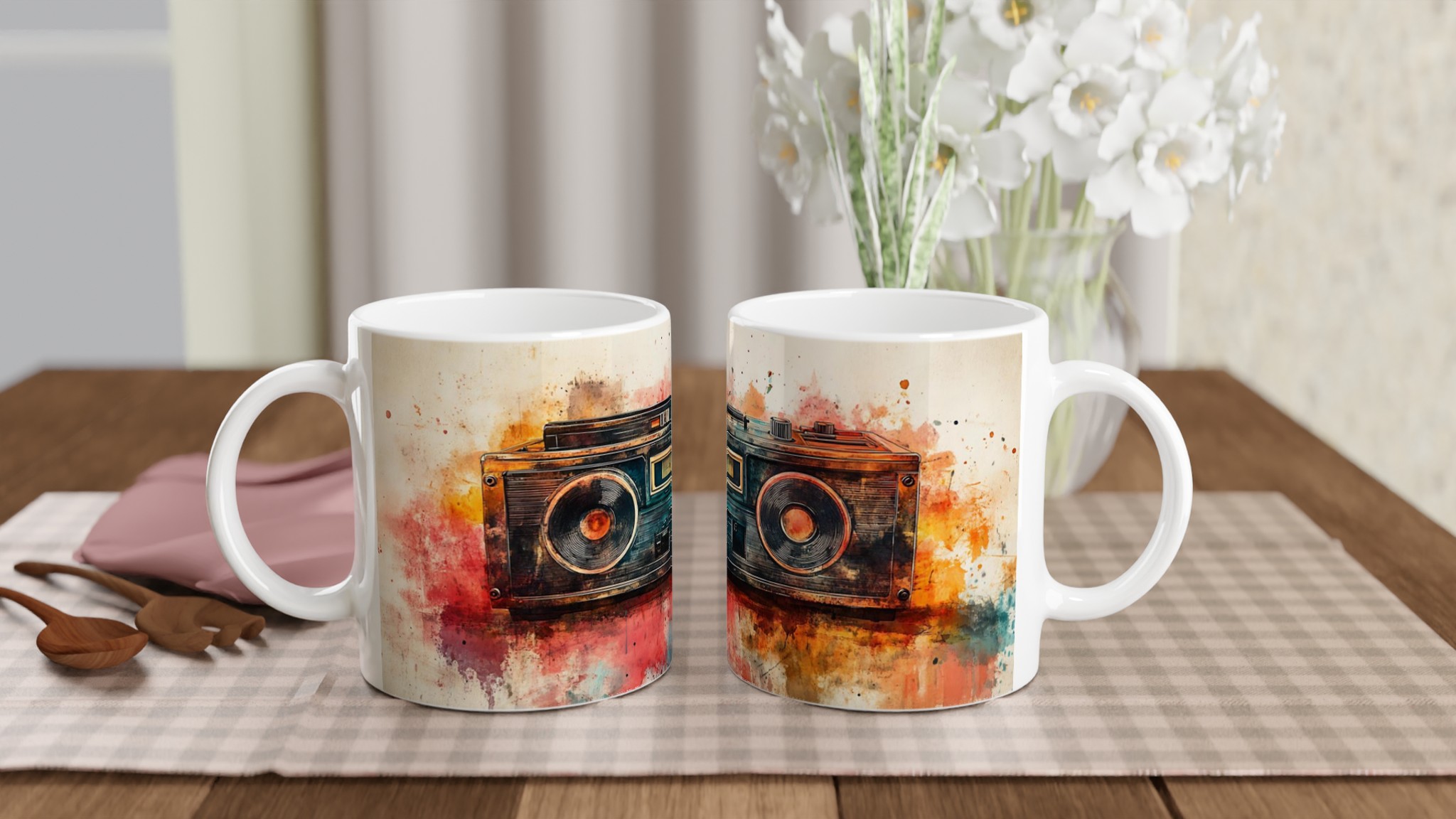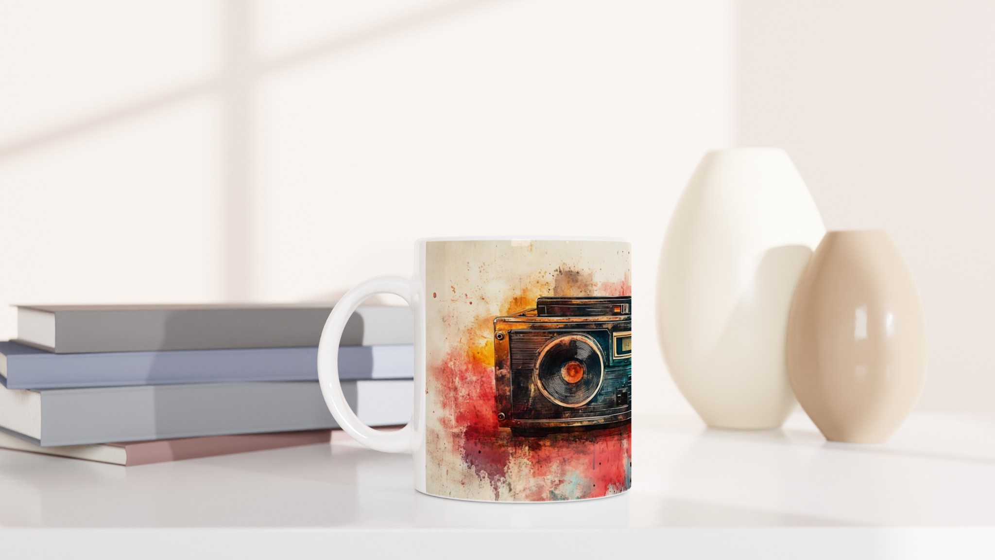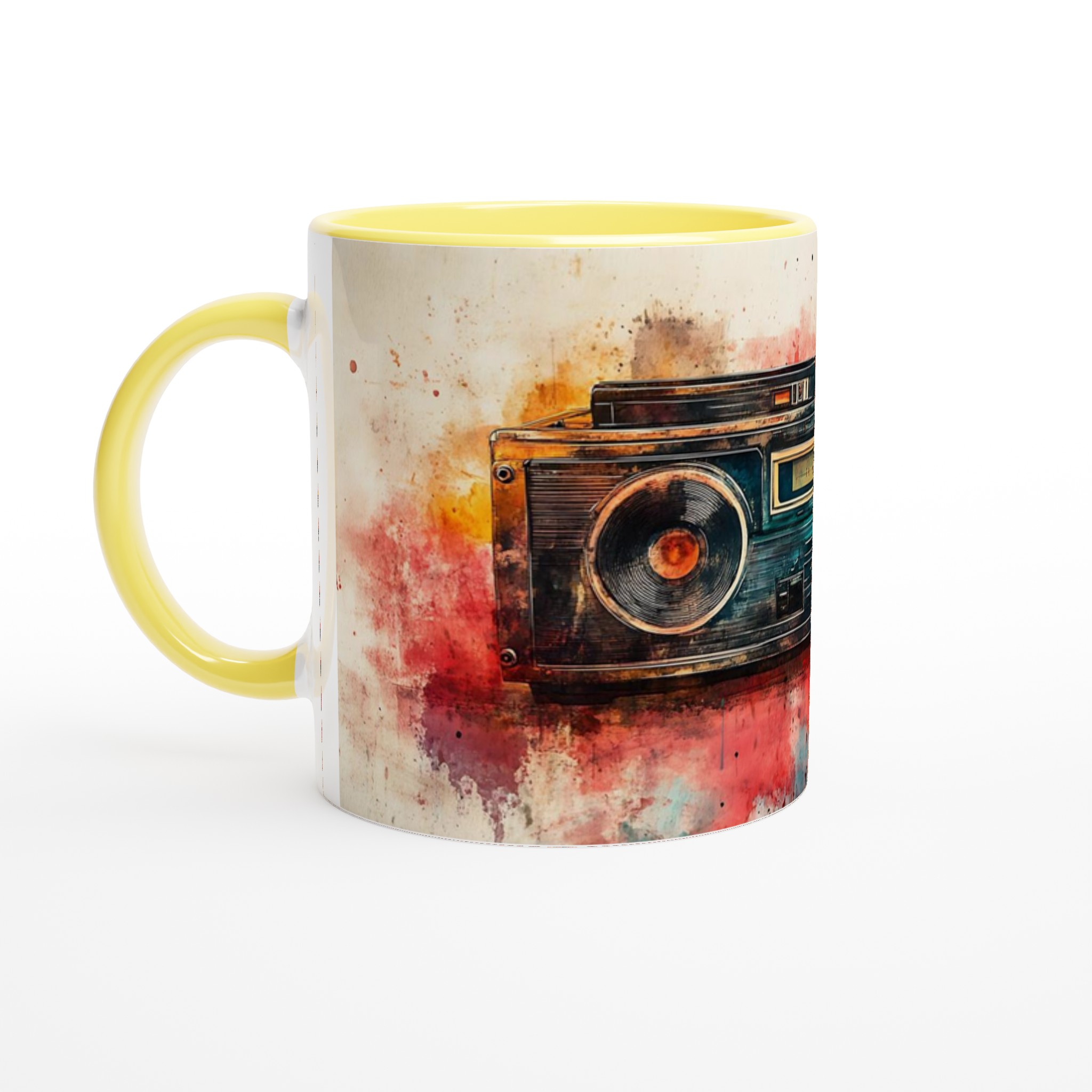 Väck dina sinnen med en touch av nostalgi! Denna unika keramiska mugg förvandlar din fikastund till en konstupplevelse, med ett levande akvarelltryck av en klassisk boombox. Färgsprakande nyanser av rött, orange, blått och brunt smälter samman och ger varje sip en retro-inspirerad, kreativ känsla. Det här blir snabbt en vardagsfavorit, perfekt för morgonkaffet, kvällens varma choklad eller när du bara vill njuta av en kopp te.