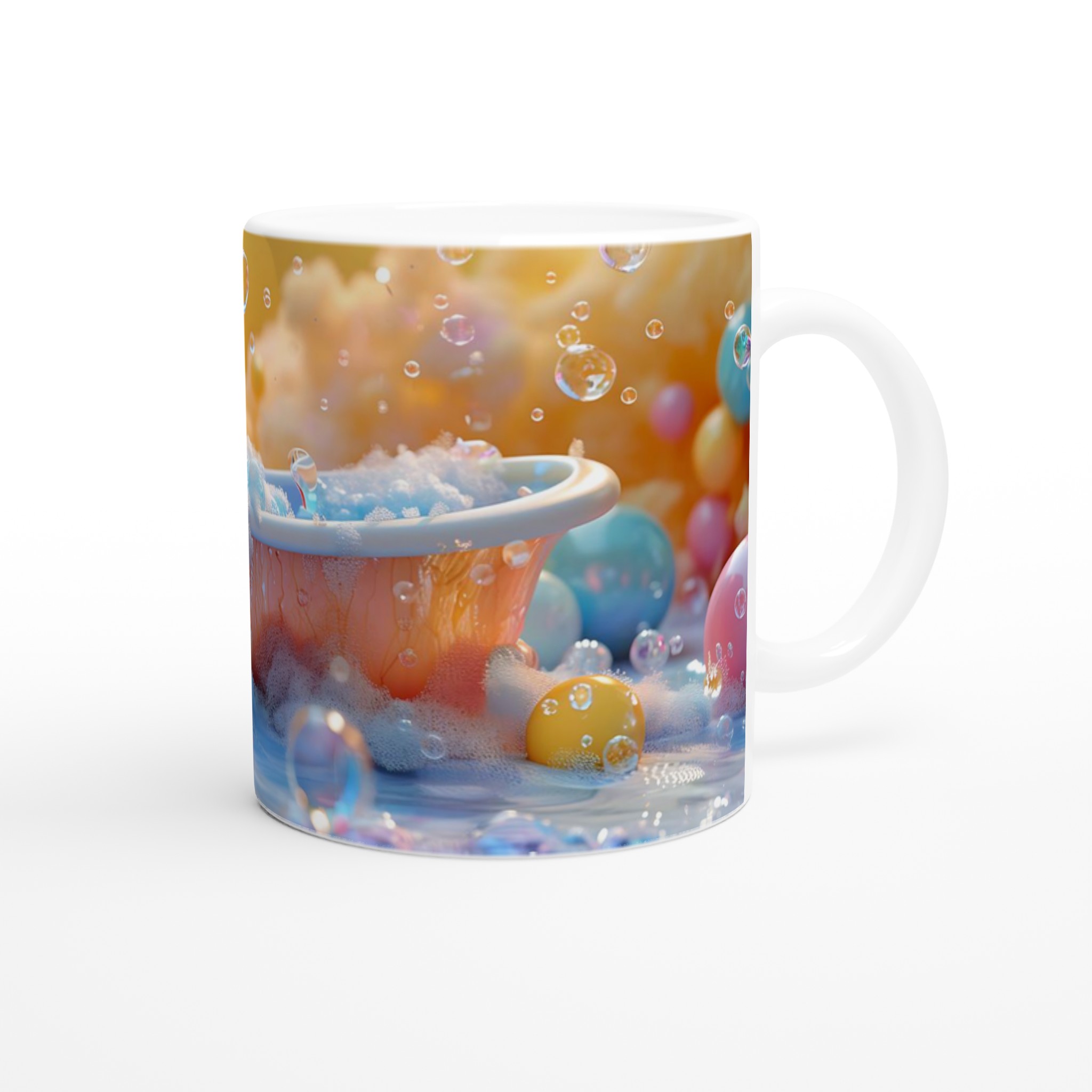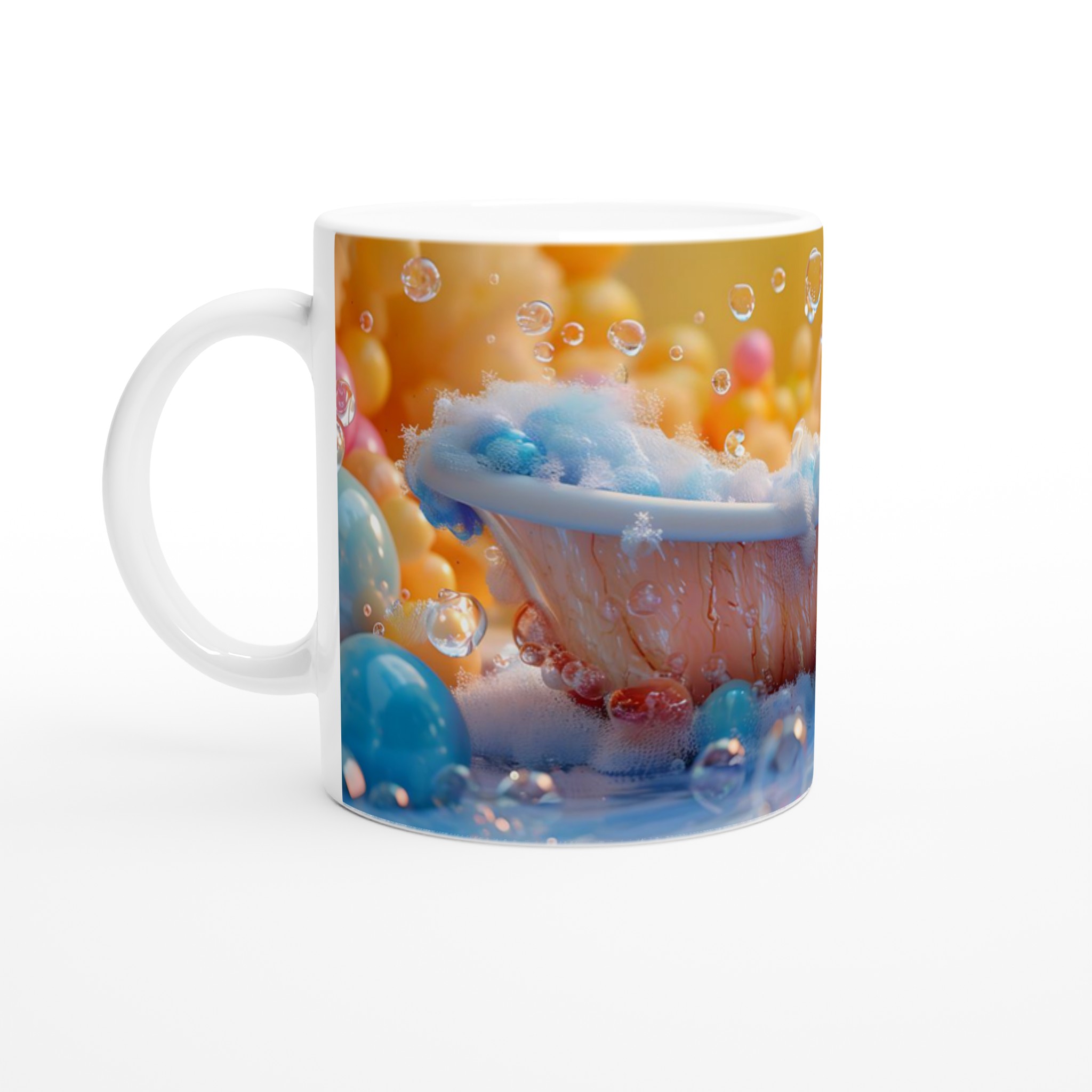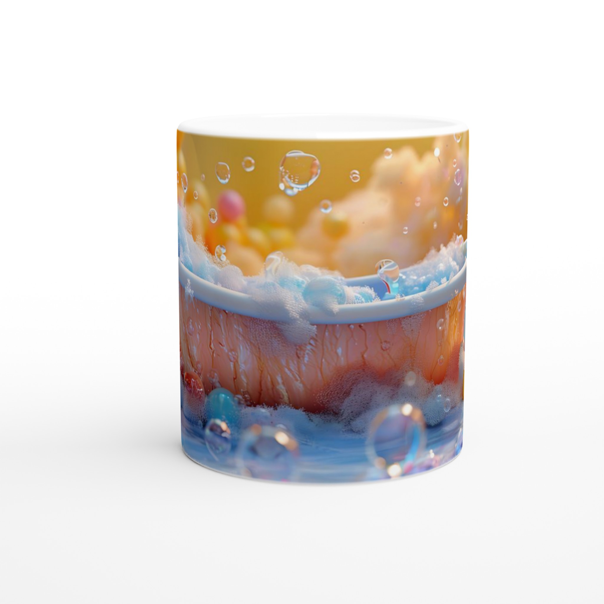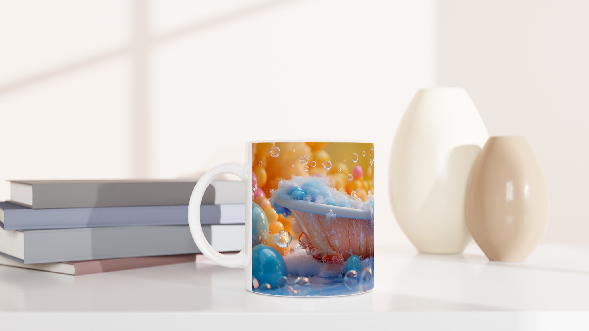 Föreställ dig en mysig stund med denna charmiga keramiska mugg, som fångar den lekfulla och avkopplande känslan av ett bubbelbad. Den här stilrena muggen blir snabbt en vardagsfavorit, perfekt för morgonkaffet, kvällens varma choklad eller när du bara vill njuta av en kopp te. Med sitt unika, drömska bubbelbad-inspirerade tryck i glada pastellfärger, framhävs bilden med klara och levande nyanser mot den blanka ytan. Den håller sig fin även efter många turer i mikron och diskmaskinen, vilket gör den lika praktisk som den är vacker.