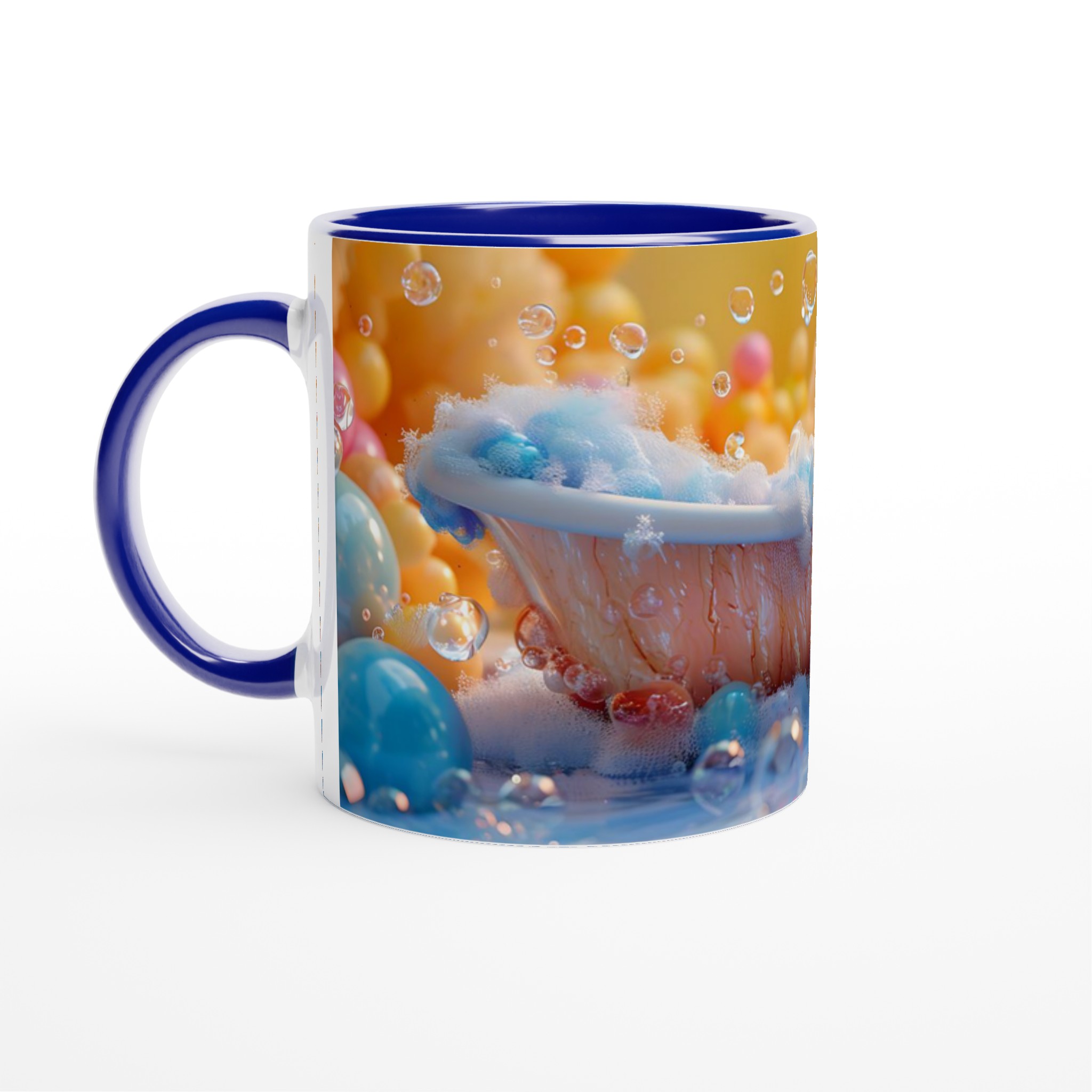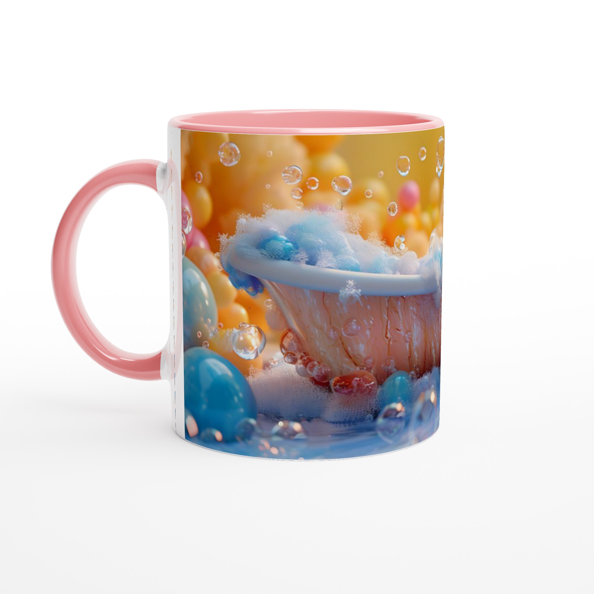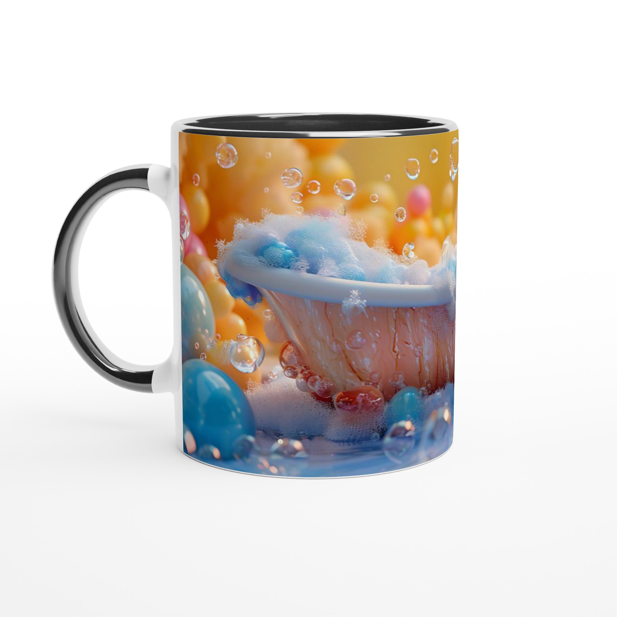 Föreställ dig en mysig stund med denna charmiga keramiska mugg, som fångar den lekfulla och avkopplande känslan av ett bubbelbad. Den här stilrena muggen blir snabbt en vardagsfavorit, perfekt för morgonkaffet, kvällens varma choklad eller när du bara vill njuta av en kopp te. Med sitt unika, drömska bubbelbad-inspirerade tryck i glada pastellfärger, framhävs bilden med klara och levande nyanser mot den blanka ytan. Den håller sig fin även efter många turer i mikron och diskmaskinen, vilket gör den lika praktisk som den är vacker.