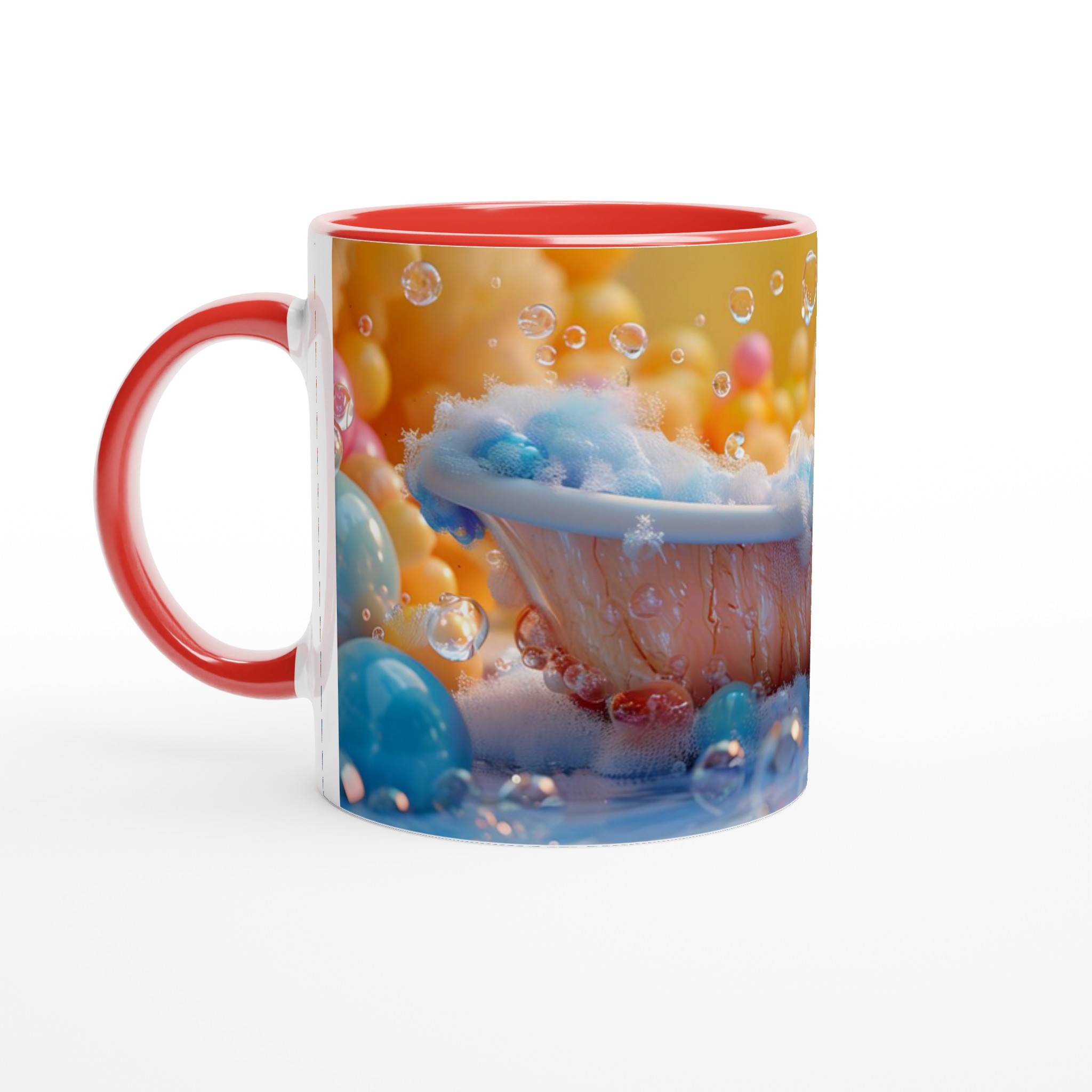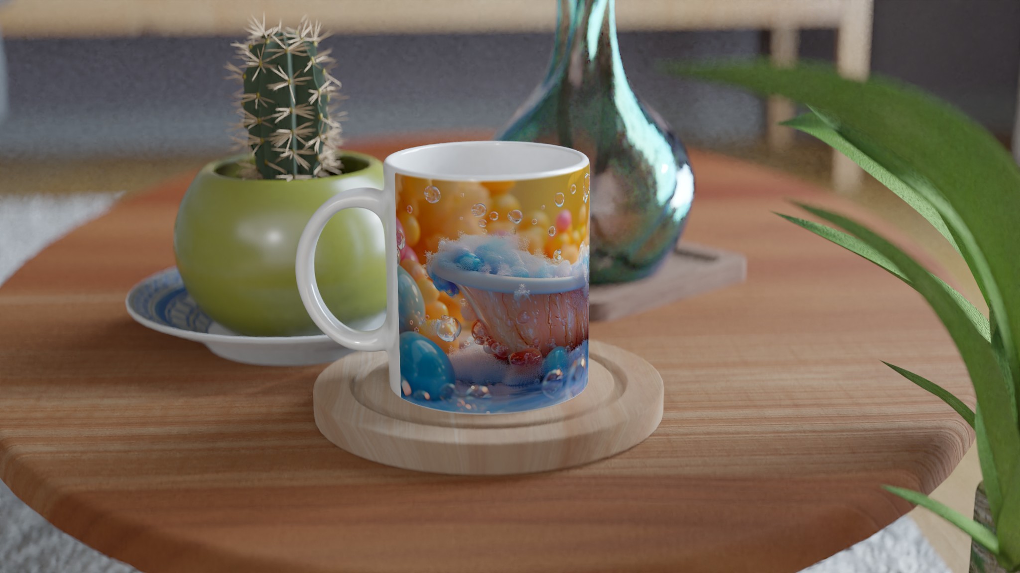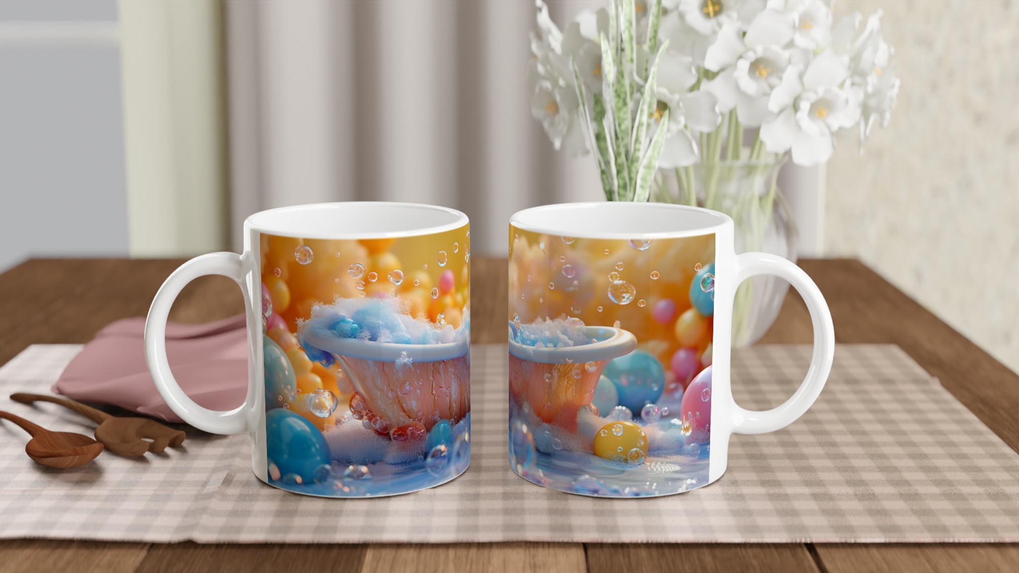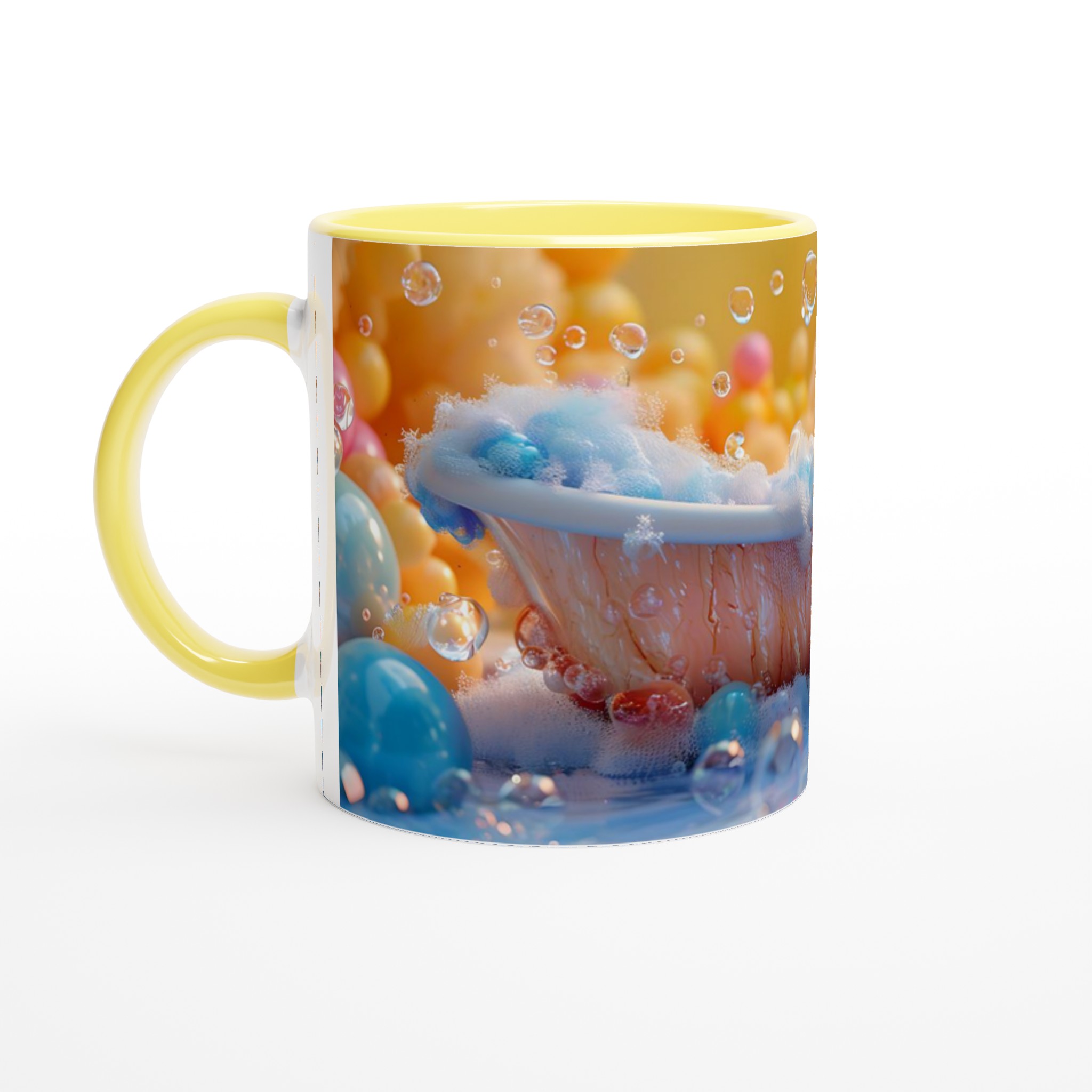 Föreställ dig en mysig stund med denna charmiga keramiska mugg, som fångar den lekfulla och avkopplande känslan av ett bubbelbad. Den här stilrena muggen blir snabbt en vardagsfavorit, perfekt för morgonkaffet, kvällens varma choklad eller när du bara vill njuta av en kopp te. Med sitt unika, drömska bubbelbad-inspirerade tryck i glada pastellfärger, framhävs bilden med klara och levande nyanser mot den blanka ytan. Den håller sig fin även efter många turer i mikron och diskmaskinen, vilket gör den lika praktisk som den är vacker.