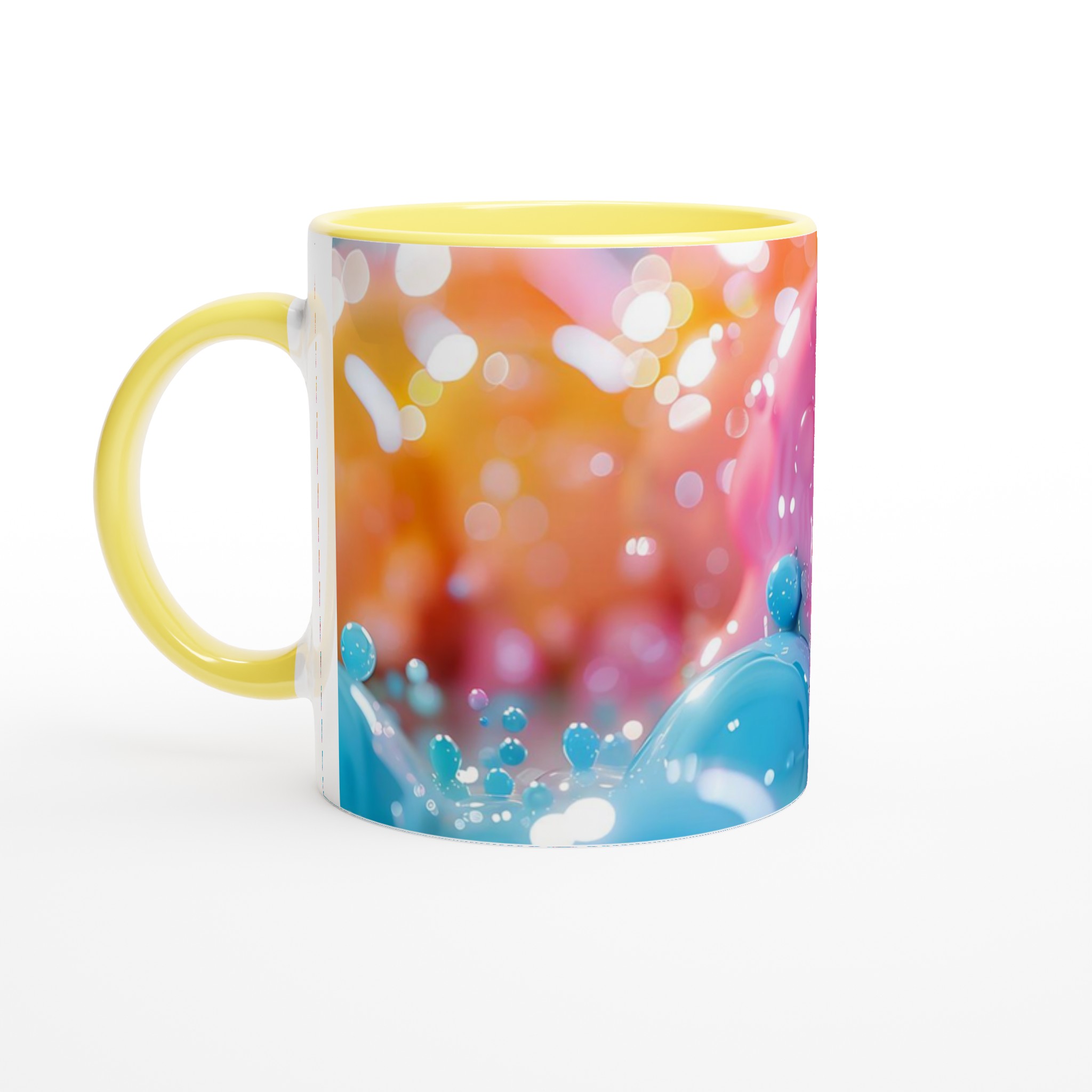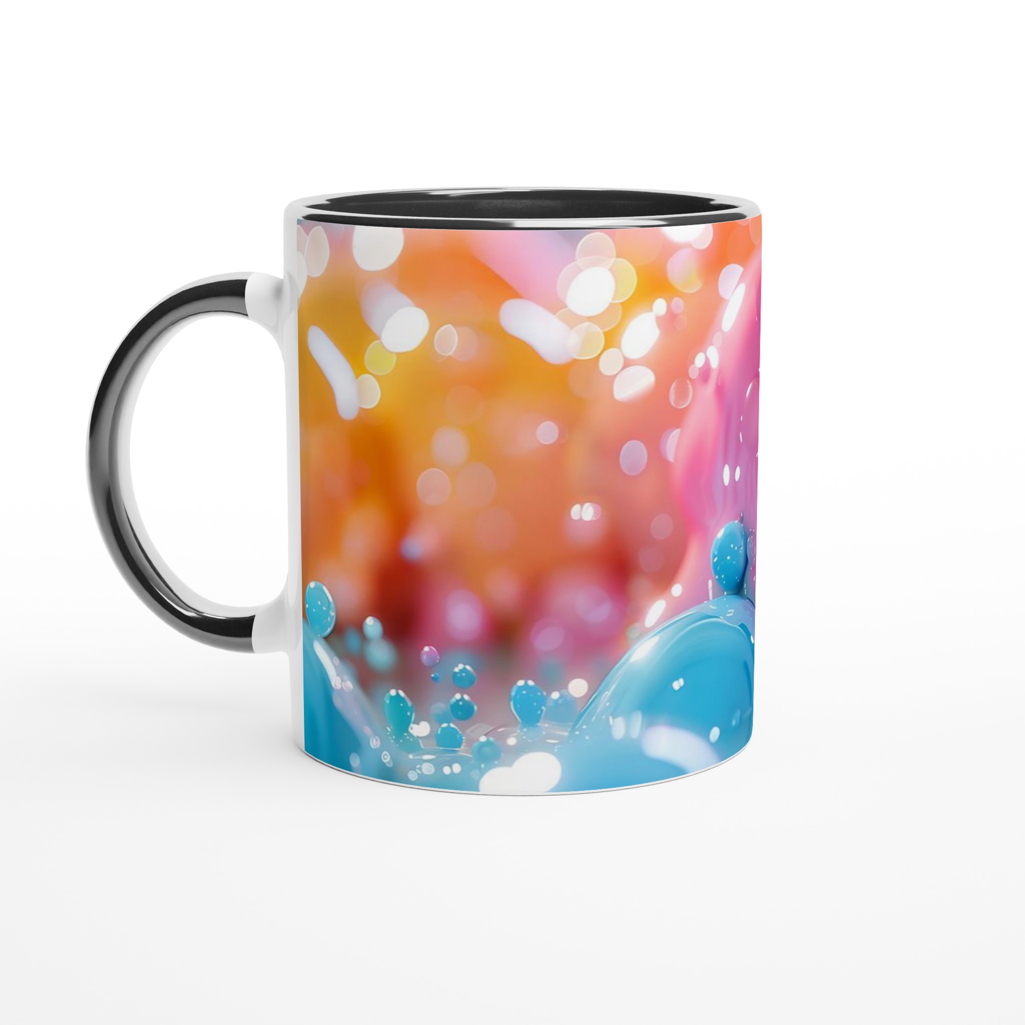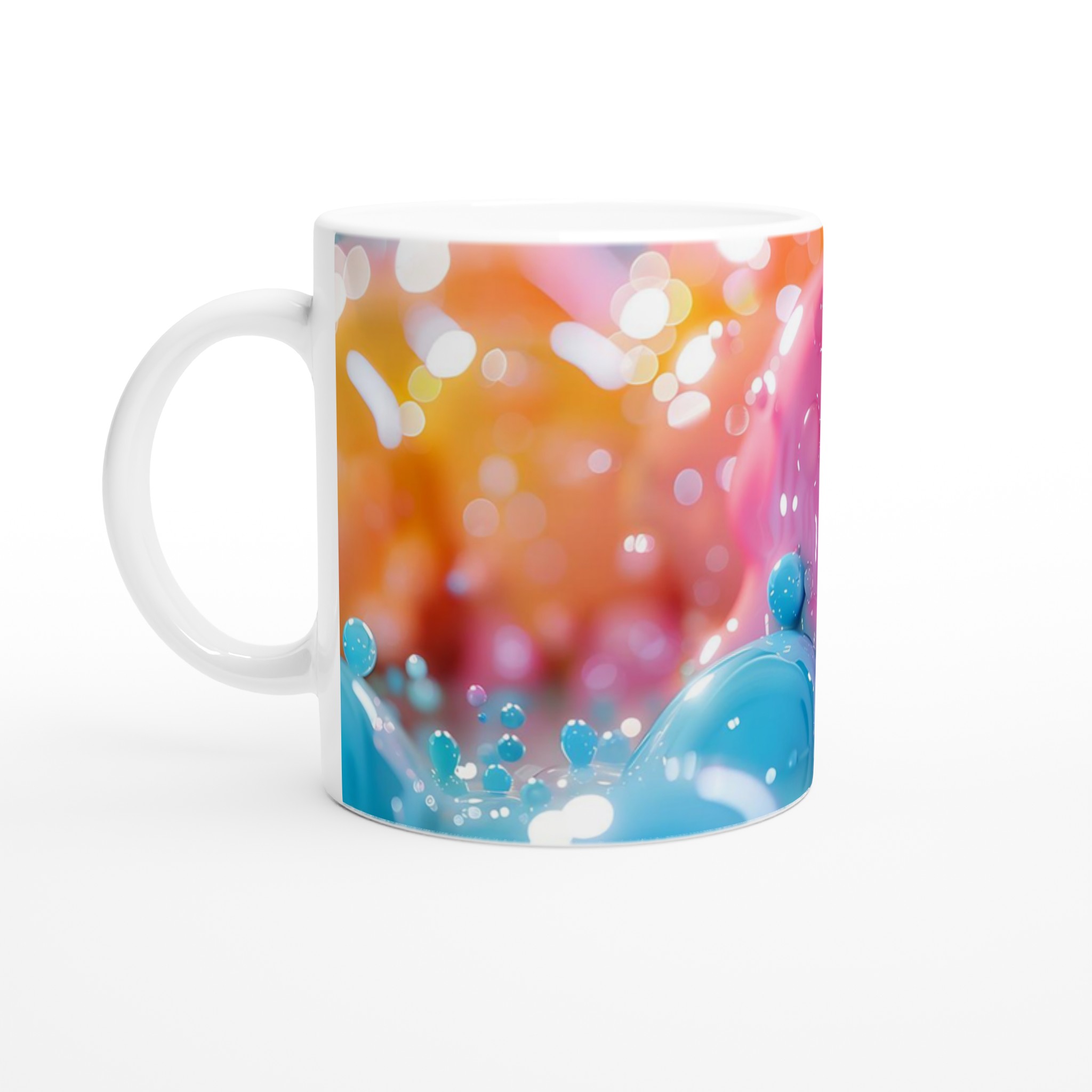Denna förtrollande keramiska mugg, inspirerad av en lekfull värld av glänsande bubblor och mjuka pastelltoner, blir snabbt en vardagsfavorit. Perfekt för morgonkaffet, kvällens varma choklad eller när du bara vill njuta av en kopp te. Den blanka vita ytan gör att trycken framhävs med klara och levande färger, som håller sig fina även efter många turer i mikron och diskmaskinen.