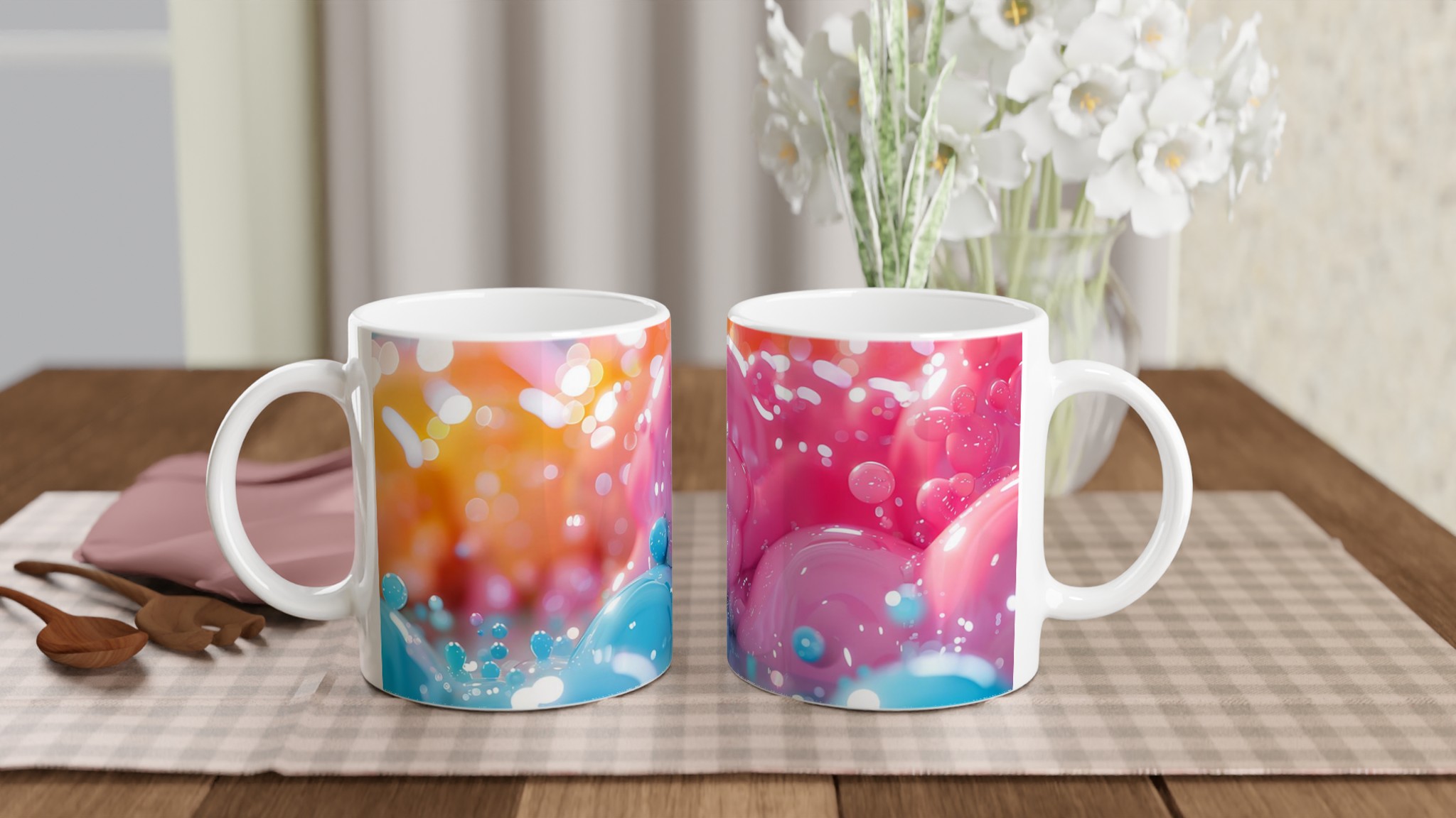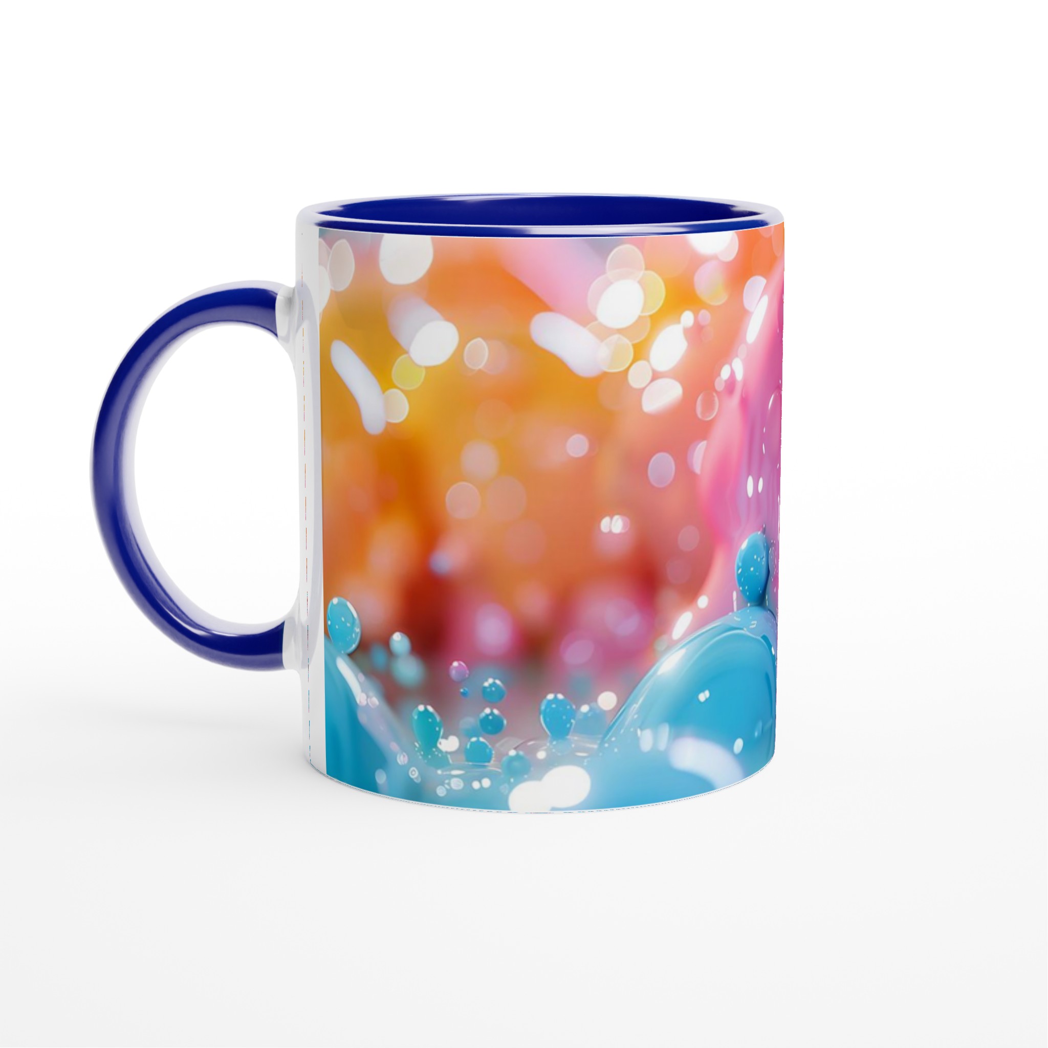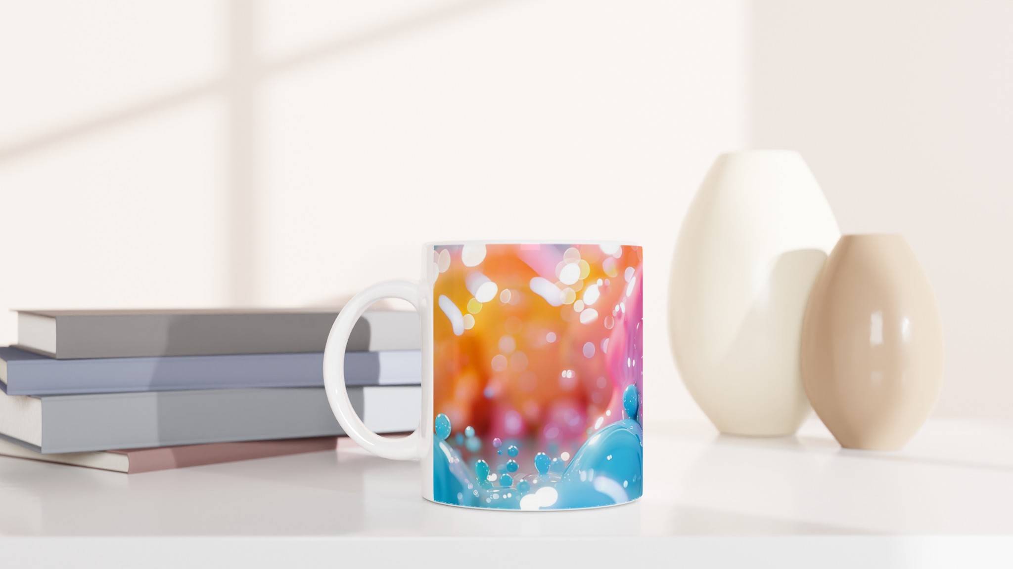 Denna förtrollande keramiska mugg, inspirerad av en lekfull värld av glänsande bubblor och mjuka pastelltoner, blir snabbt en vardagsfavorit. Perfekt för morgonkaffet, kvällens varma choklad eller när du bara vill njuta av en kopp te. Den blanka vita ytan gör att trycken framhävs med klara och levande färger, som håller sig fina även efter många turer i mikron och diskmaskinen.