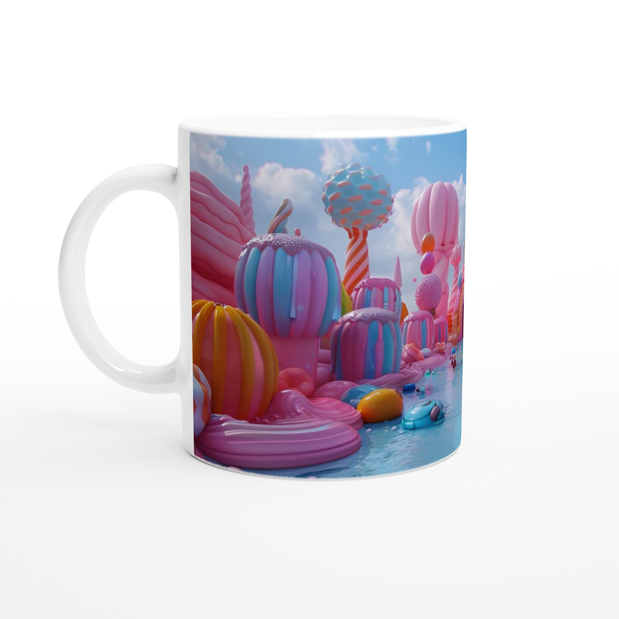 Inspirerad av en söt och fantasifull godislandskap, där pastellfärger möter lekfulla former, förvandlar denna mugg varje dryck till en liten flykt. Den blanka vita ytan ger ett skarpt och levande tryck som verkligen sticker ut, oavsett om det är en personlig design, ett roligt citat eller en present till någon du tycker om.