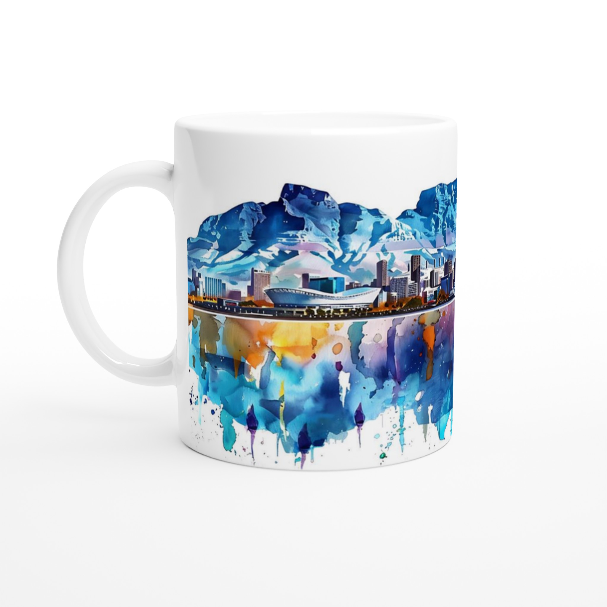 Cape Town Akvarell: 11oz Keramisk Mugg – Konstnärlig Siluett med Pulserande Akvarellreflektioner