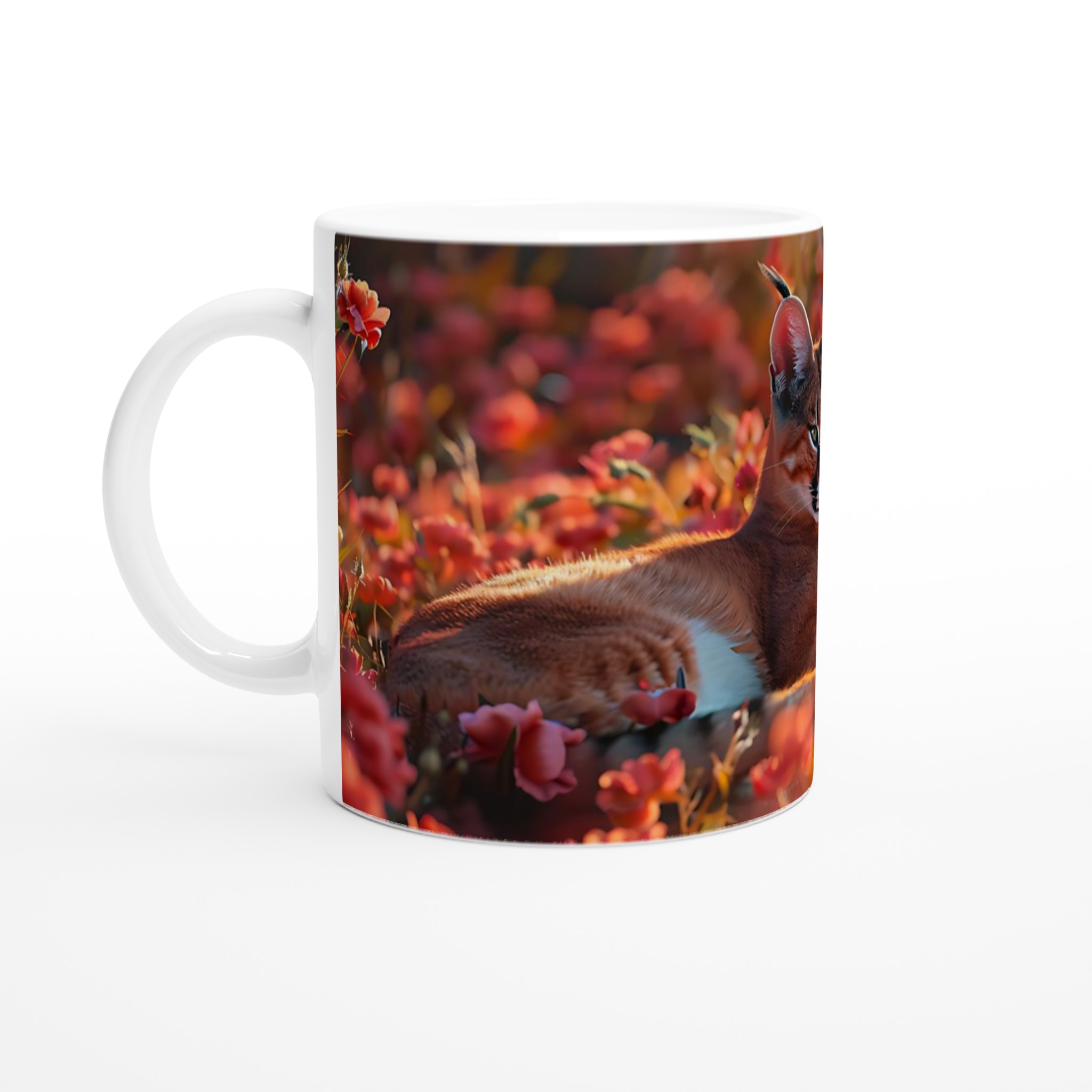 Inspirerad av den majestätiska ökenlonxens lugna skönhet i ett hav av solkyssta blommor, fångar denna mugg en känsla av mystik och elegans. Den blanka vita ytan ger ett skarpt och levande tryck som verkligen sticker ut, oavsett om det är en personlig design, ett roligt citat eller en present till någon du tycker om.