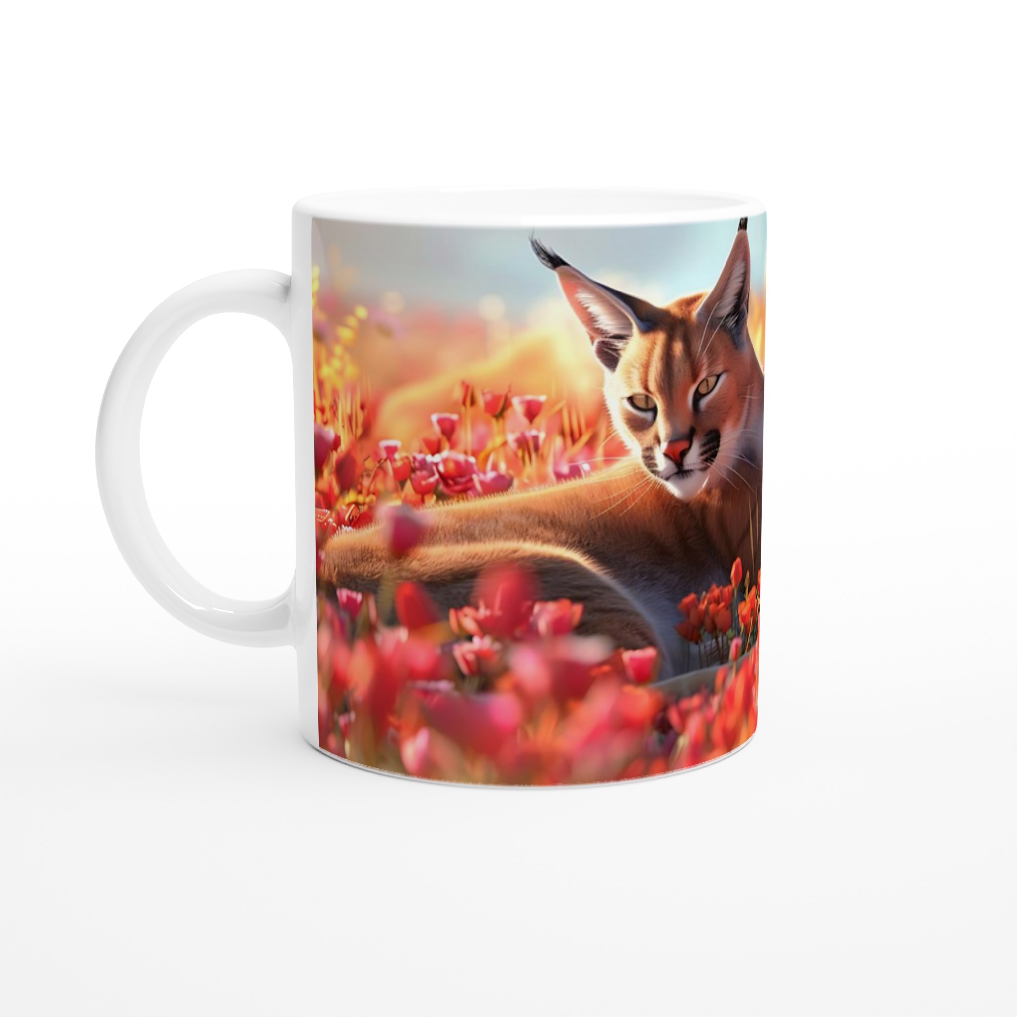 Inspirerad av den mystiska skönheten hos en karakal i gryningen, omgiven av ett hav av blommor, fångar denna mugg essensen av vildmarkens lugn. Den blanka vita ytan ger ett skarpt och levande tryck som verkligen sticker ut, oavsett om det är en personlig design, ett roligt citat eller en present till någon du tycker om.