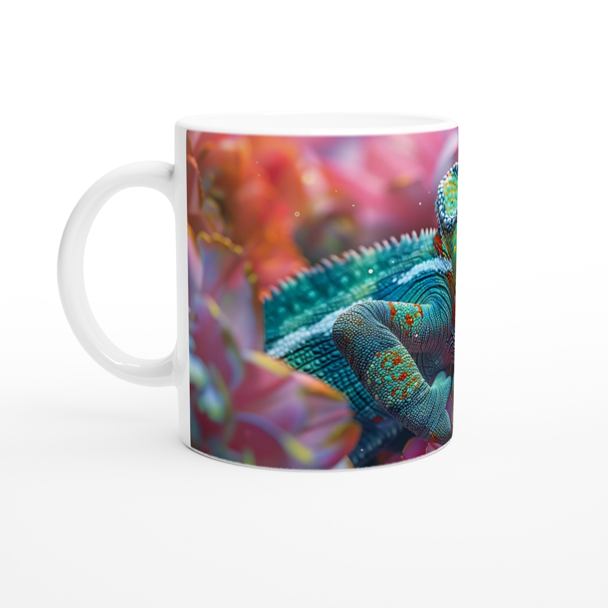 Inspirerad av kameleontens fantastiska färgskala och naturens livfulla palett, förvandlar vår premium keramikmugg varje dryck till en upplevelse. Den blanka ytan ger ett skarpt och levande tryck som verkligen sticker ut, perfekt för att visa upp en personlig design, ett roligt citat eller som en omtänksam present till någon du tycker om.