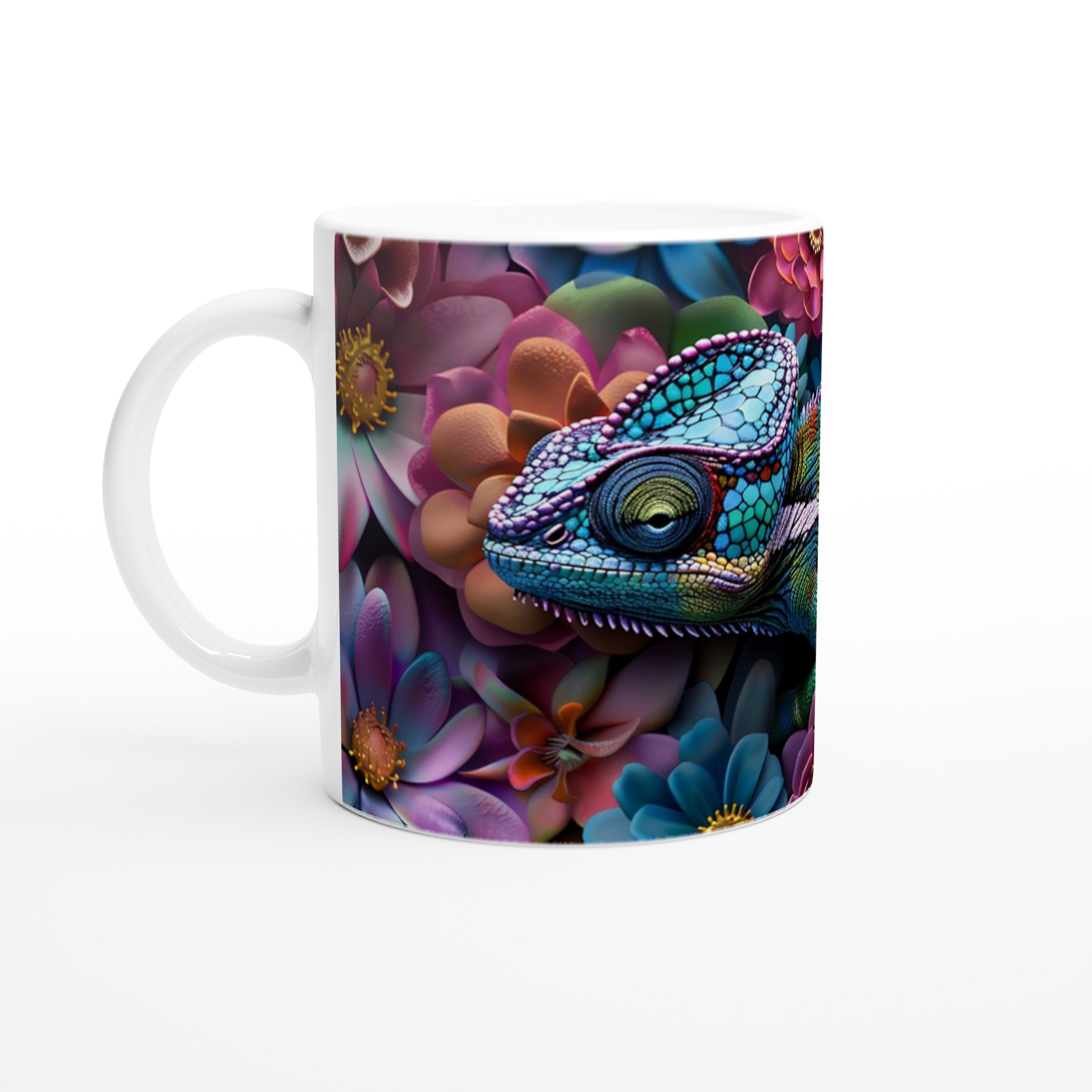 Inspirerad av kameleontens fantastiska färgspel och blommornas livfullhet, erbjuder denna mugg en explosion av färger som förvandlar din dryckesupplevelse. Den blanka vita ytan ger ett skarpt och levande tryck som verkligen sticker ut, oavsett om det är en personlig design, ett roligt citat eller en present till någon du tycker om. Men varför stanna vid vitt? Skapa din egen färgexplosion med vår Chameleon Bloom-kollektion!