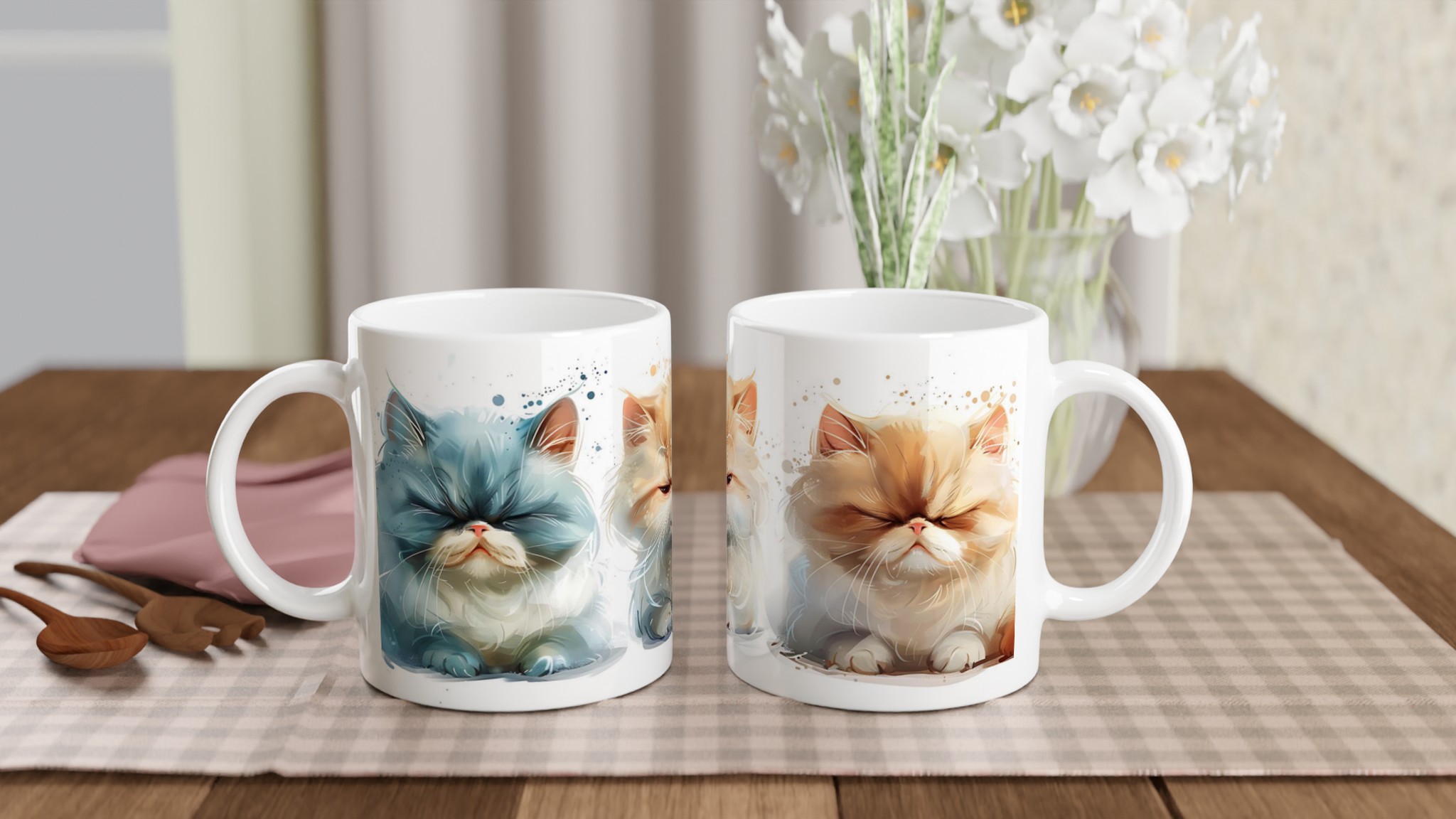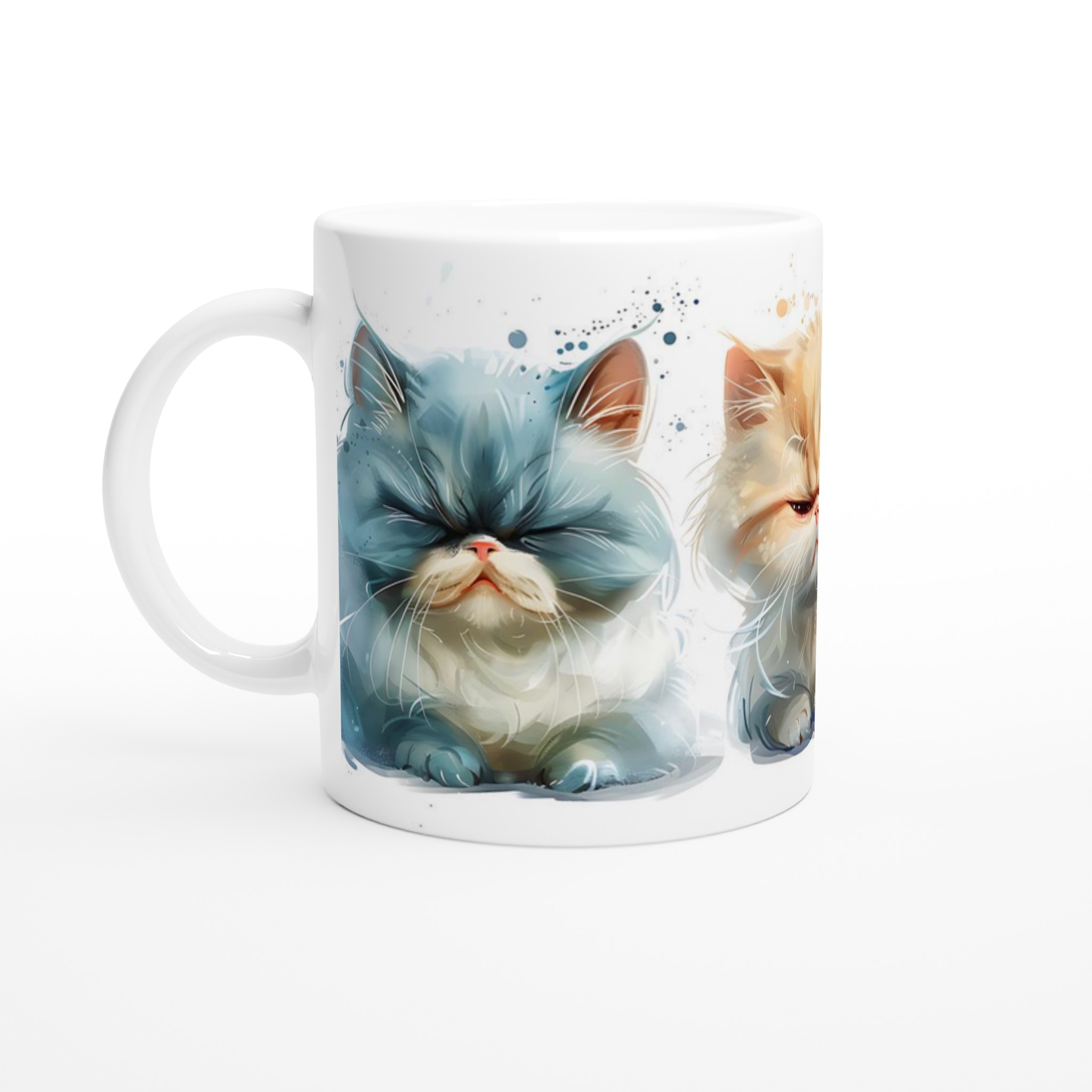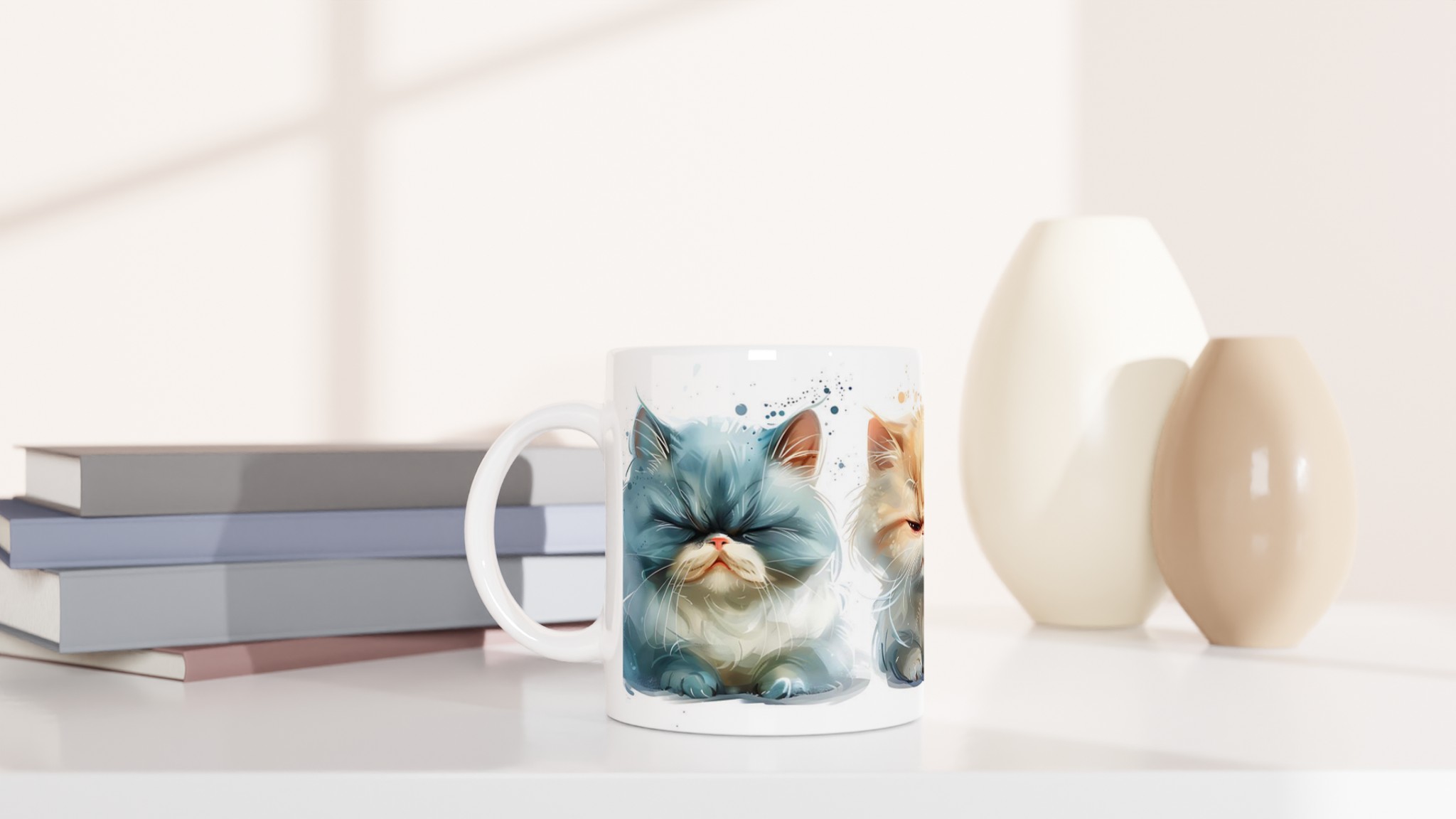 Lyft din fikastund med denna bedårande keramiska mugg, prydd med ljuvliga, akvarell-inspirerade kattporträtt. Varje katt utstrålar sin egen unika personlighet, från den lekfulla blå till den gosiga krämfärgade, alla med en charm som fångar ögat. Denna mugg blir snabbt en vardagsfavorit. Perfekt för morgonkaffet, kvällens varma choklad eller när du bara vill njuta av en kopp te. Den blanka vita ytan gör att trycken framhävs med klara och levande färger, som håller sig fina även efter många turer i mikron och diskmaskinen.