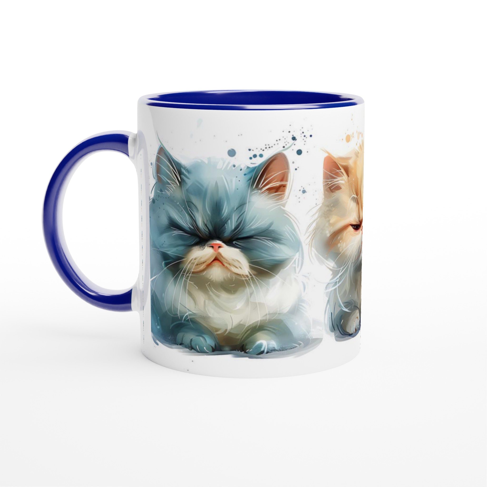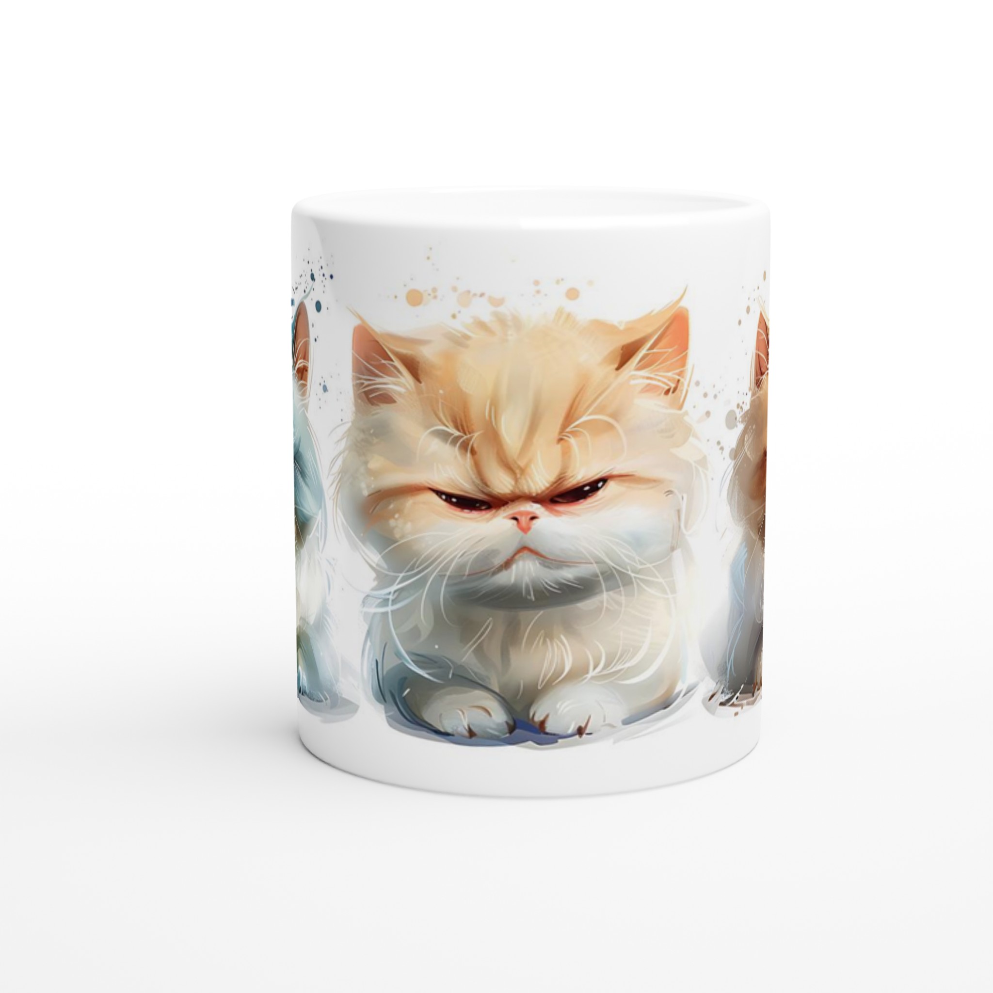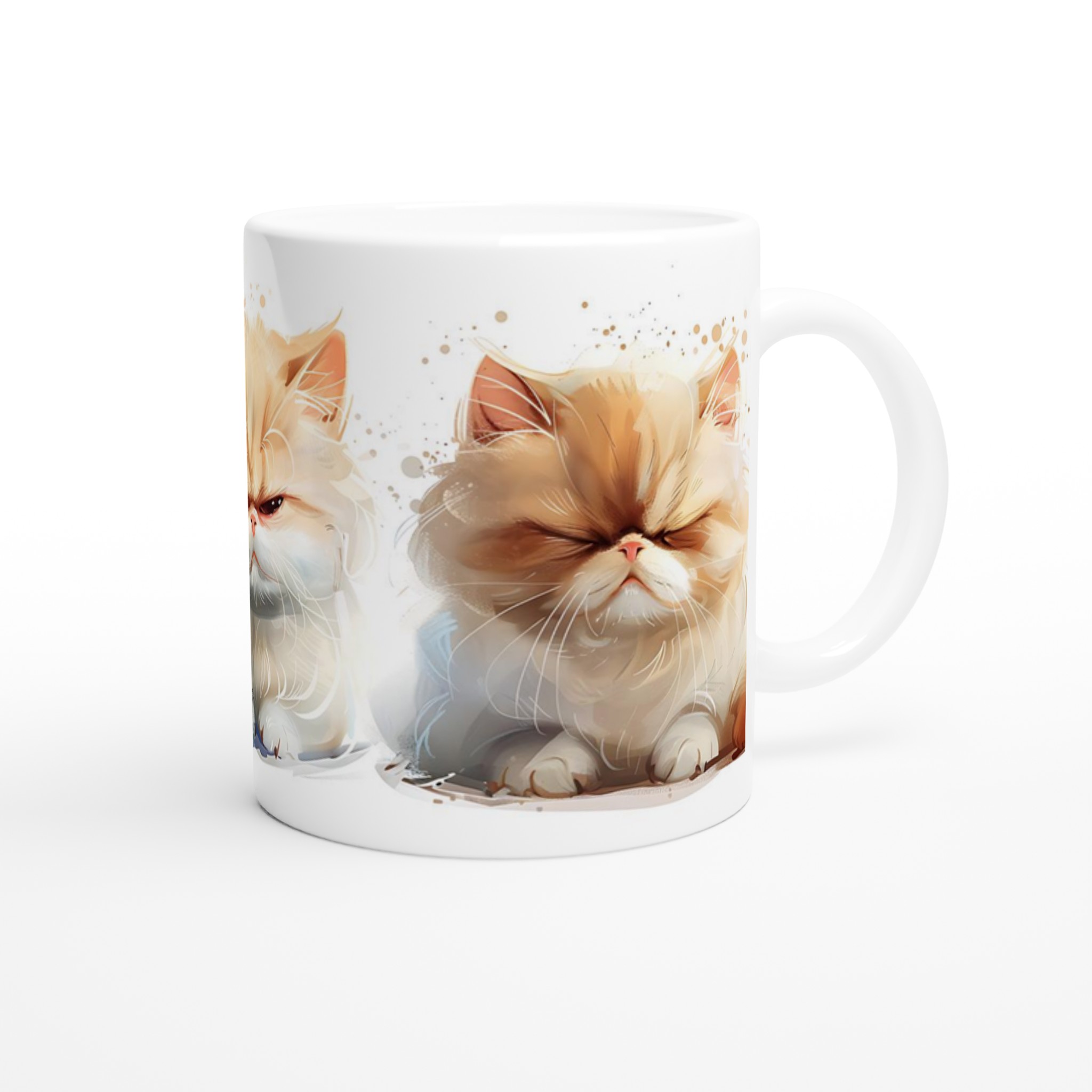 Lyft din fikastund med denna bedårande keramiska mugg, prydd med ljuvliga, akvarell-inspirerade kattporträtt. Varje katt utstrålar sin egen unika personlighet, från den lekfulla blå till den gosiga krämfärgade, alla med en charm som fångar ögat. Denna mugg blir snabbt en vardagsfavorit. Perfekt för morgonkaffet, kvällens varma choklad eller när du bara vill njuta av en kopp te. Den blanka vita ytan gör att trycken framhävs med klara och levande färger, som håller sig fina även efter många turer i mikron och diskmaskinen.