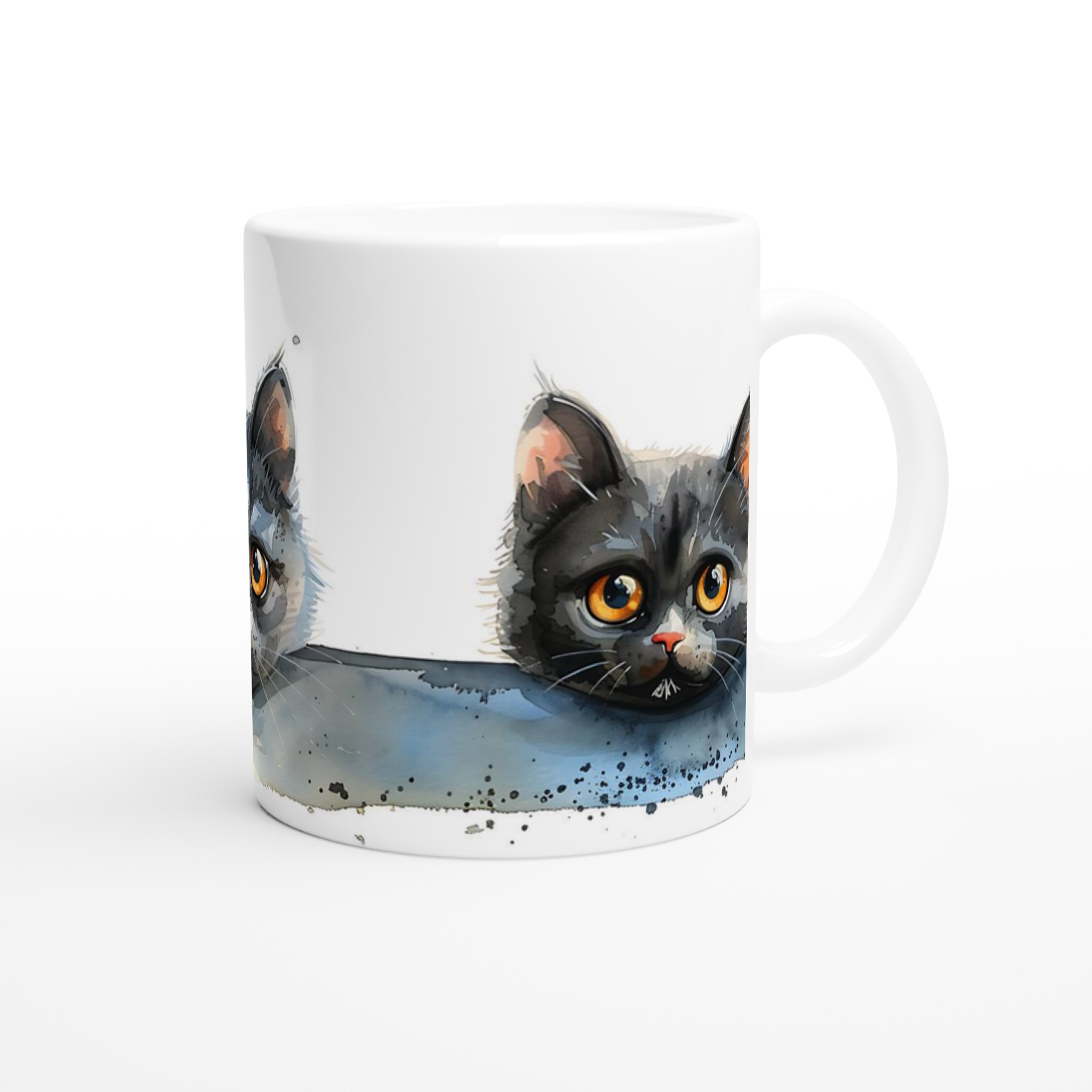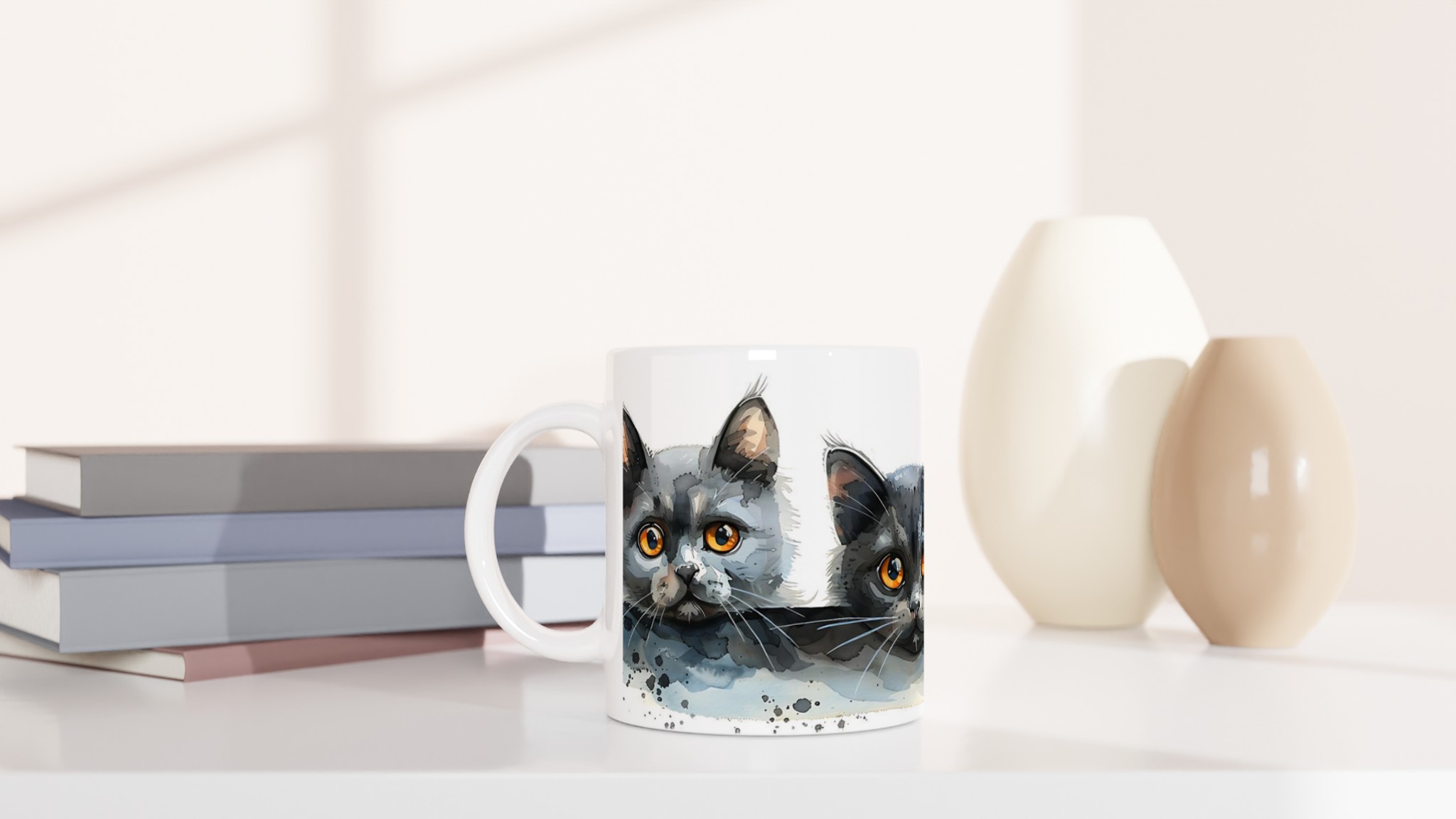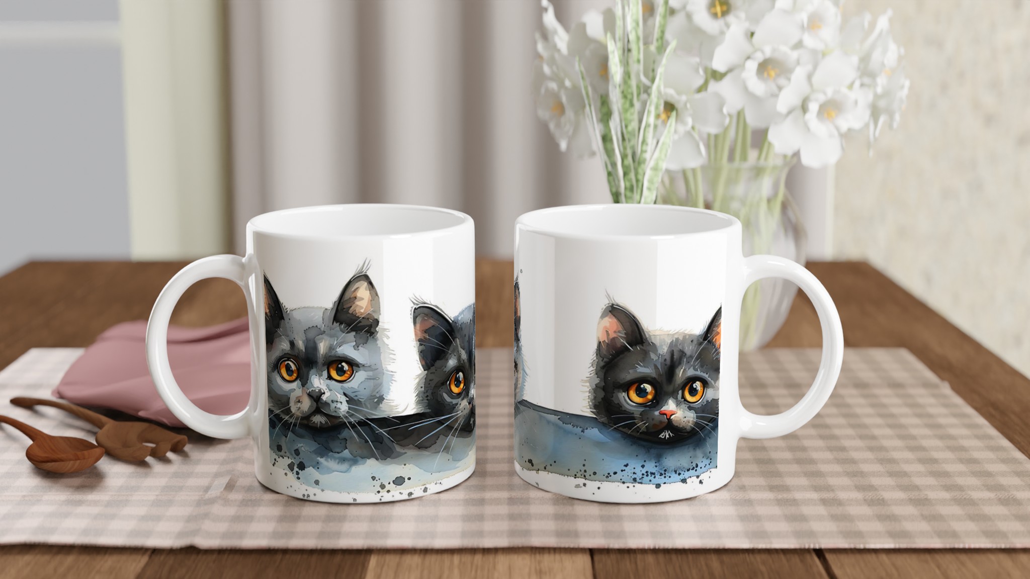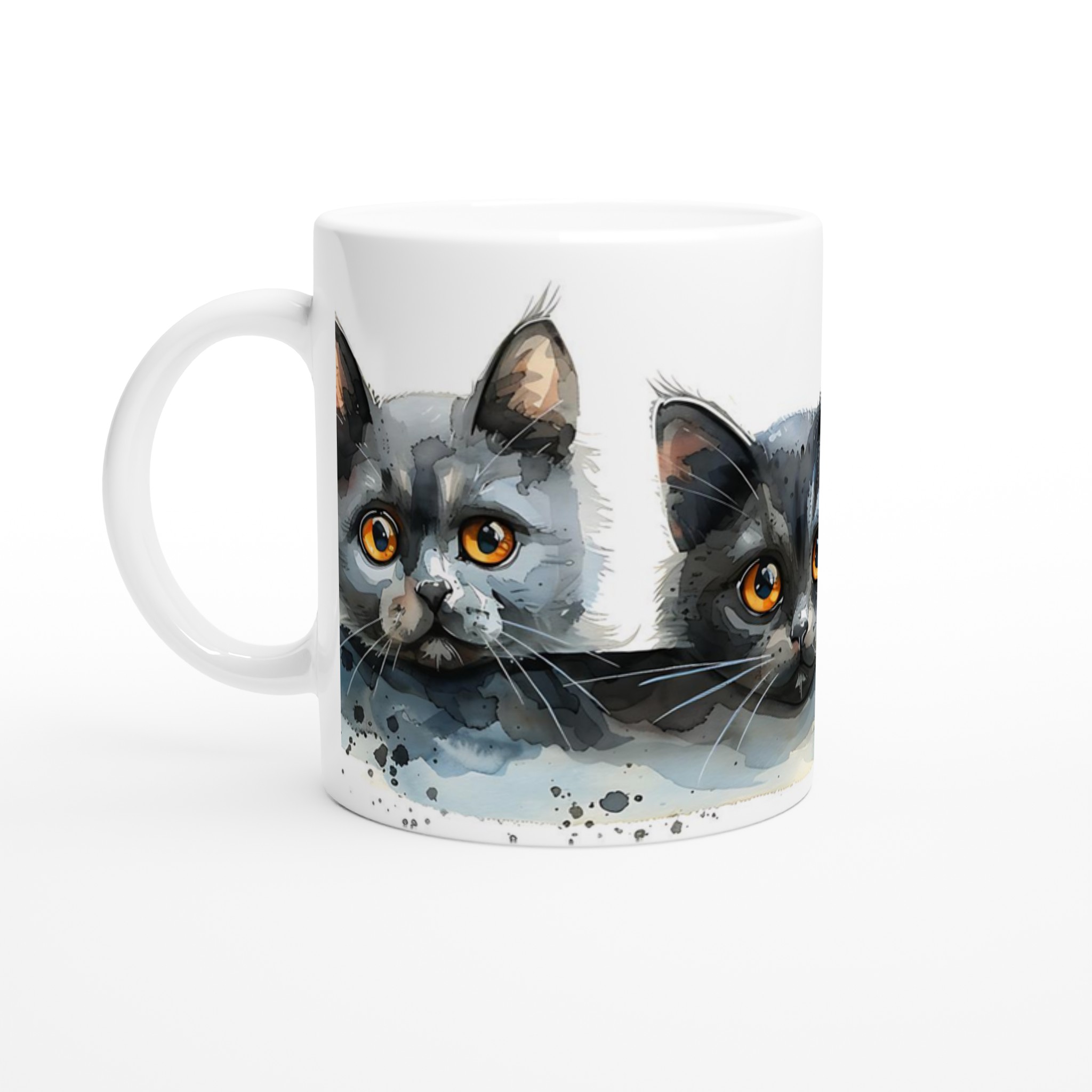Förgyll varje fika med denna oemotståndliga keramiska mugg, prydd med tre bedårande kattungar i en mjuk akvarellstil. Deras nyfikna blickar och de varma, orangea ögonen mot den gråsvarta pälsen skapar en hjärtevärmande design som garanterat sprider glädje. Den här stilrena muggen blir snabbt en vardagsfavorit – perfekt för morgonkaffet, kvällens varma choklad, eller när du bara vill njuta av en kopp te i gott sällskap.