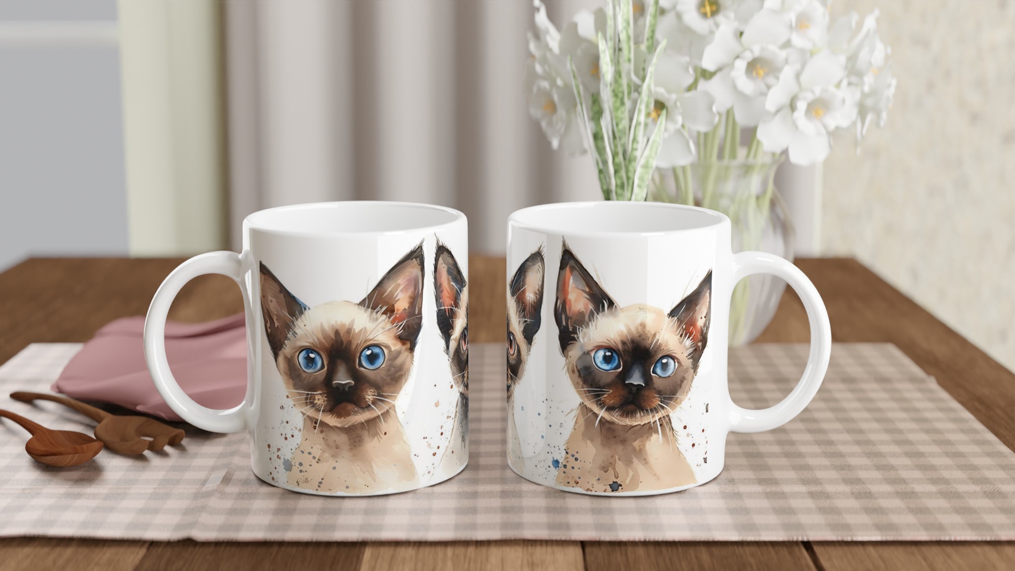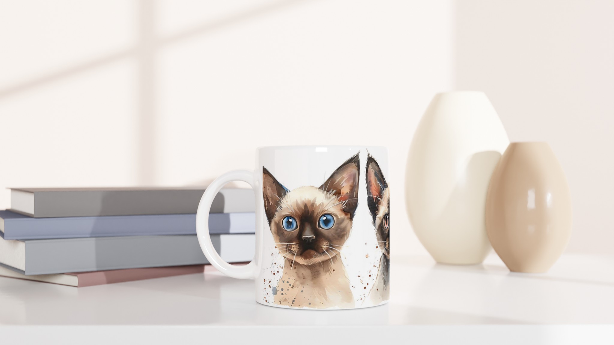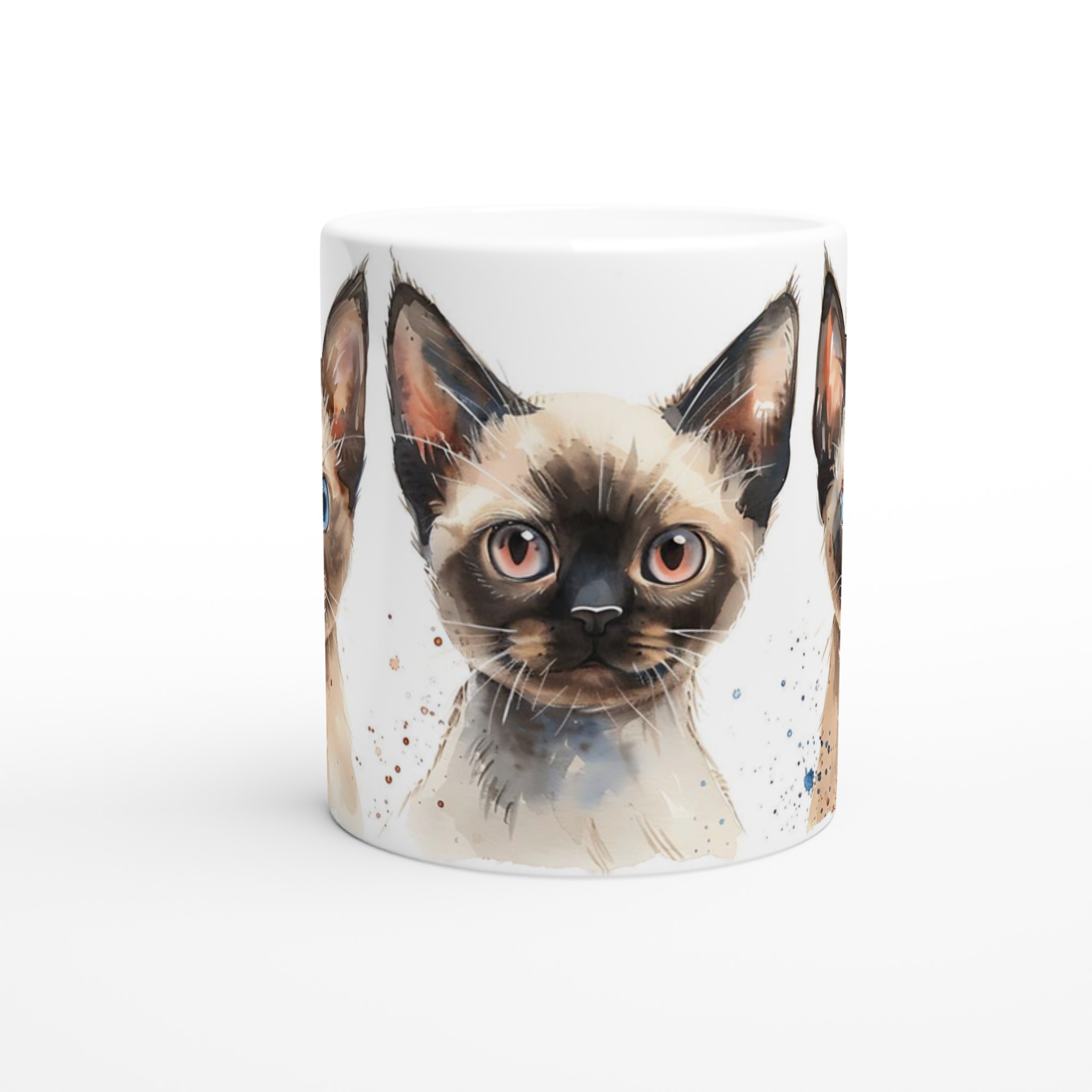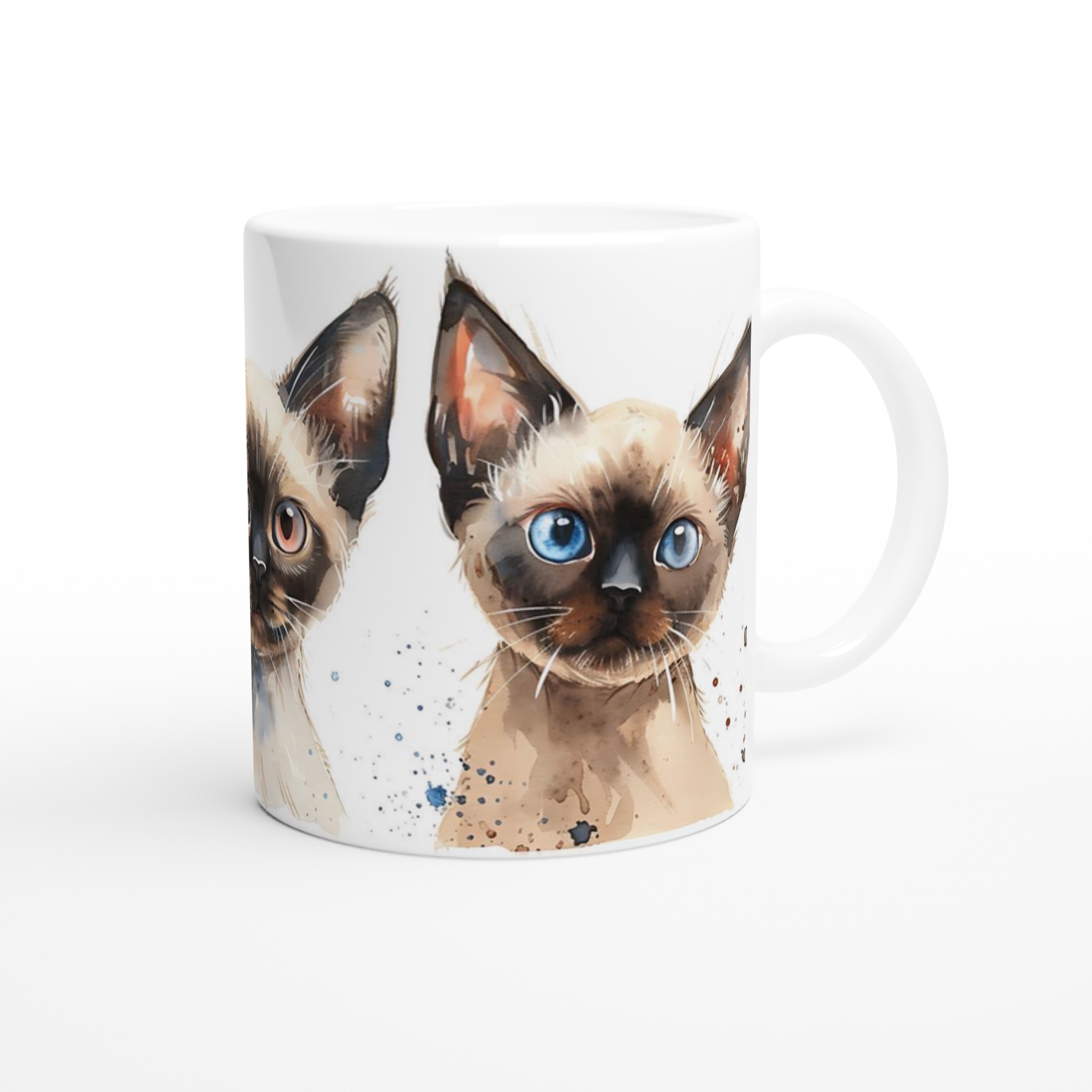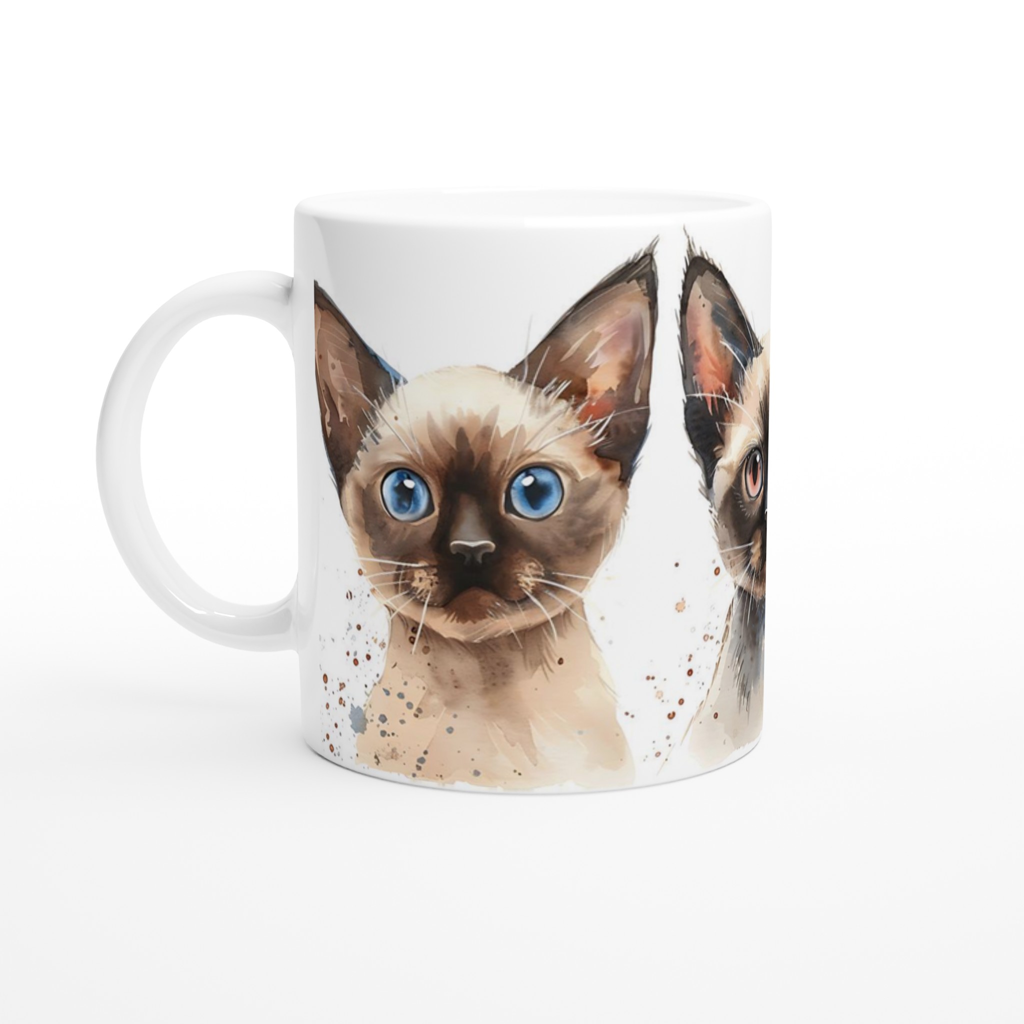 Fånga charmen hos dessa förtrollande siameskatter med vår unika keramiska mugg. Varje mugg pryds av en vackert målad akvarell av en siameskatt, med uttrycksfulla ögon som verkligen kommer till liv. Denna mugg är mer än bara en dryckesbehållare – den är ett litet konstverk som förgyller varje paus.
