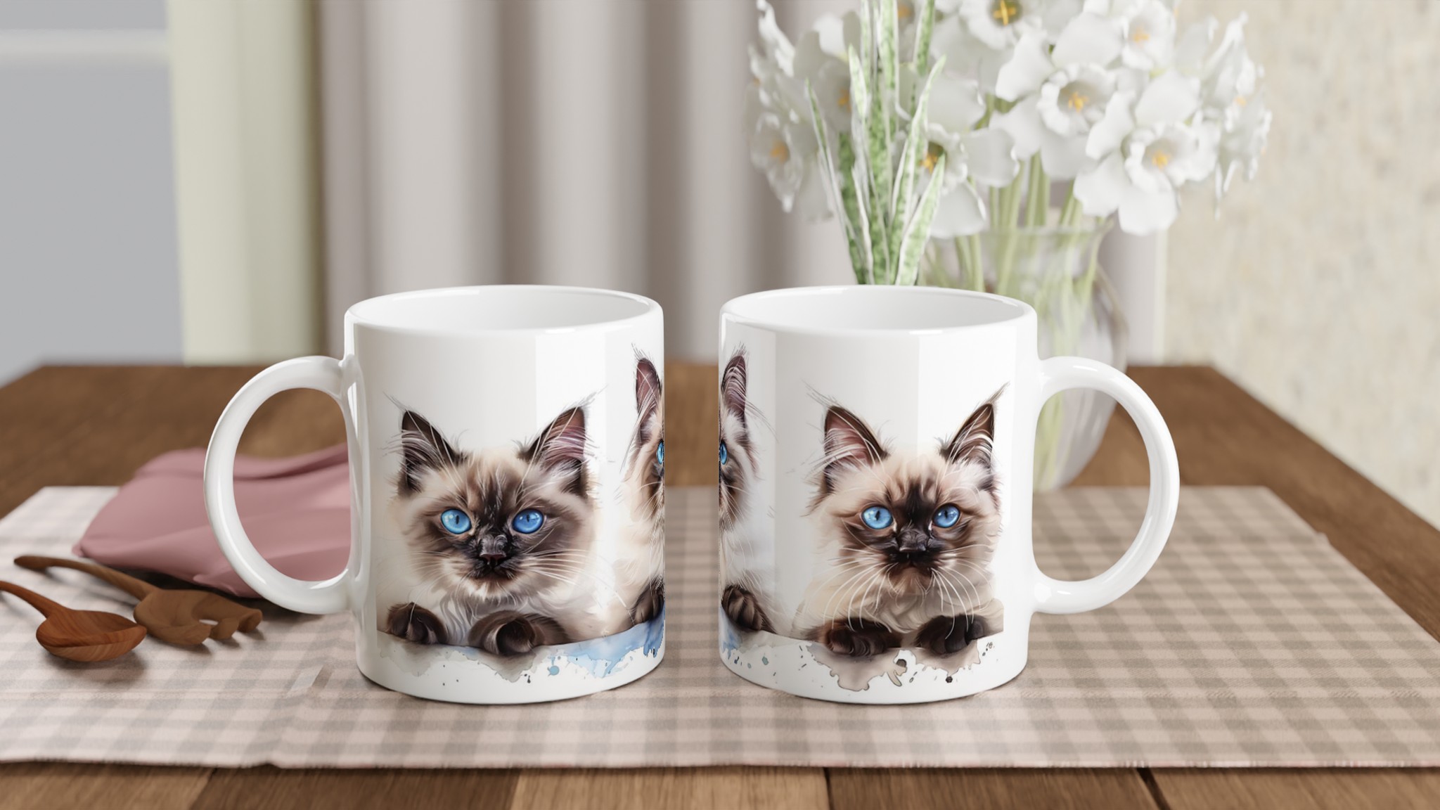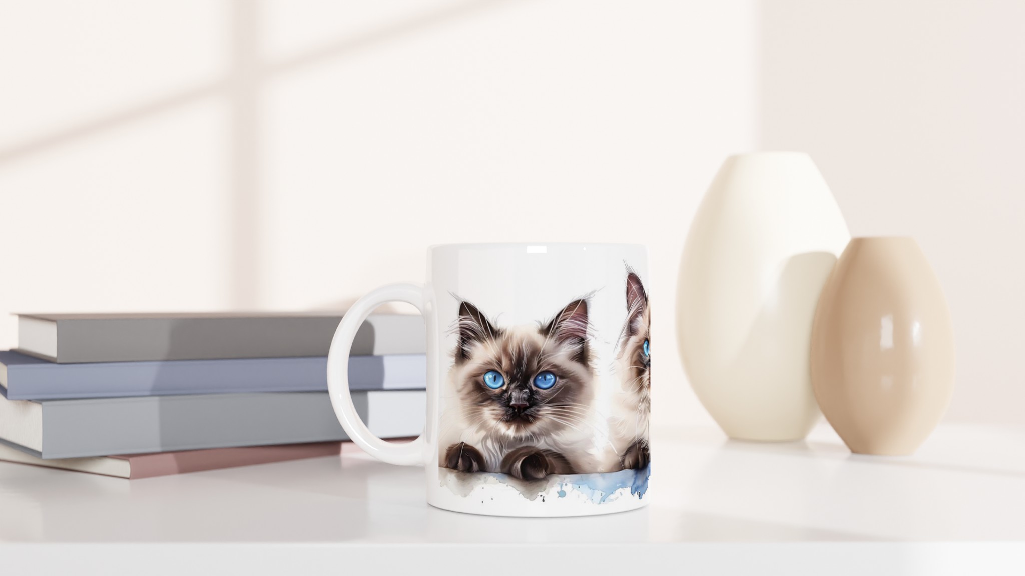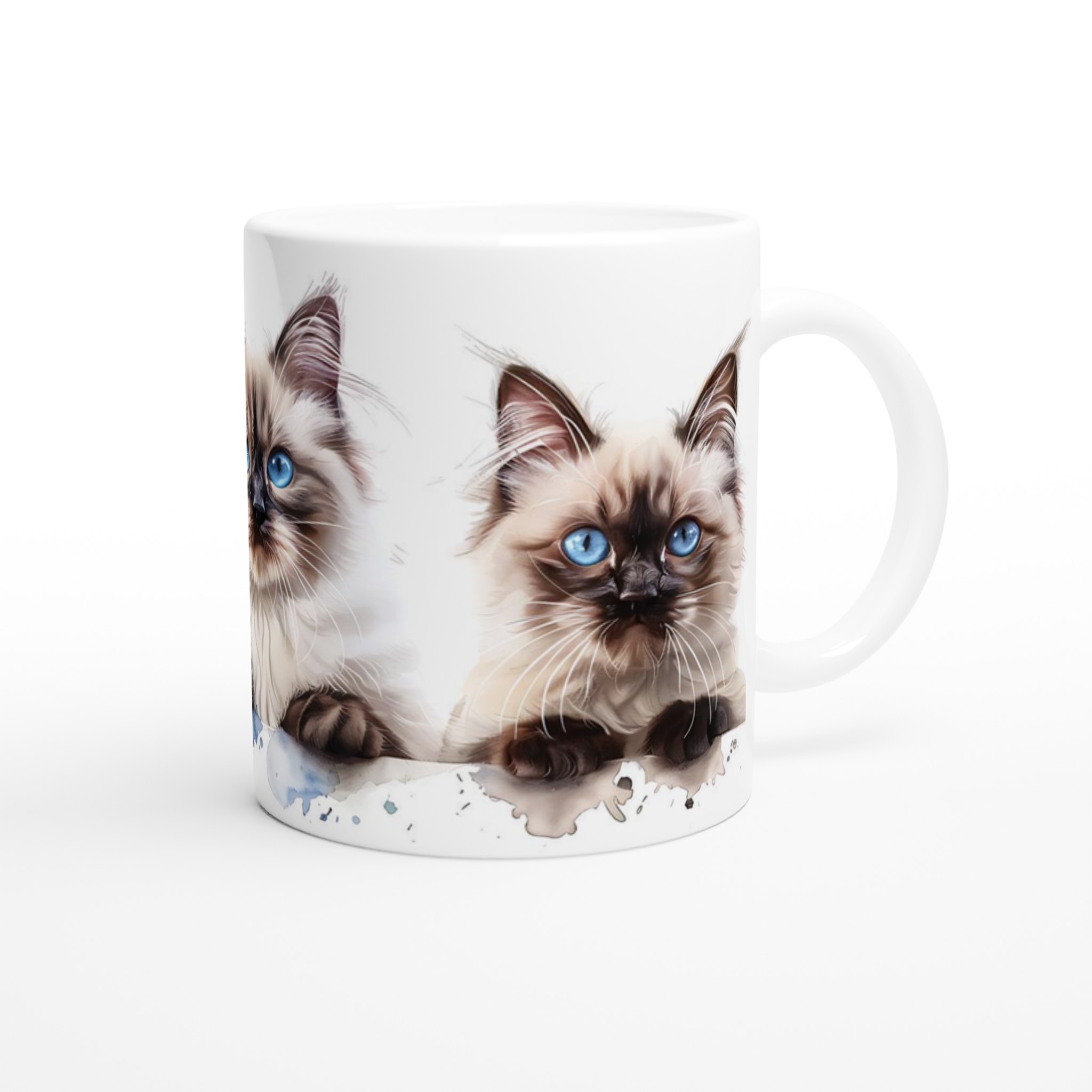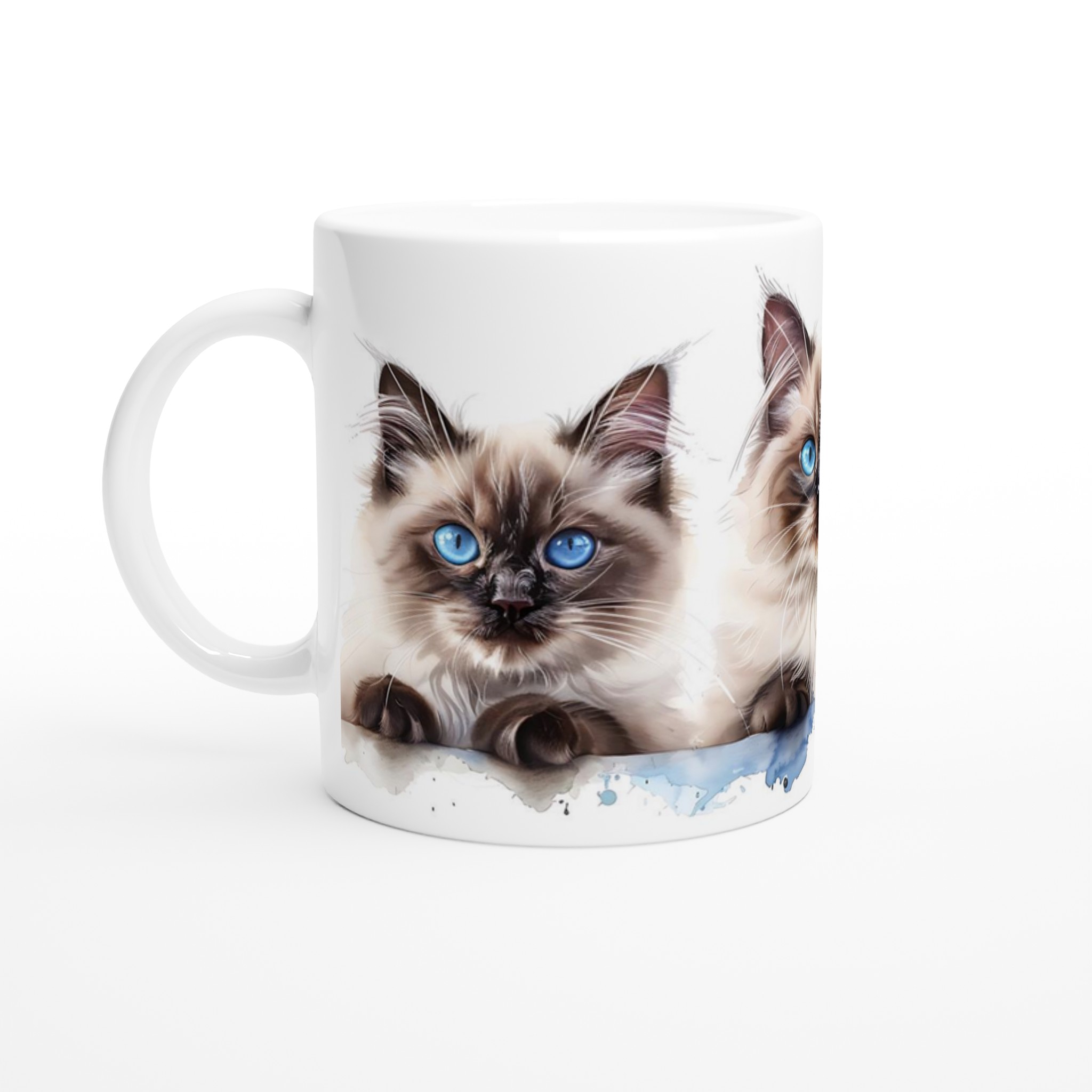 Fånga den oemotståndliga charmen med våra lurviga vänner varje gång du tar en klunk! Denna stilrena keramiska mugg, prydd med en förtrollande illustration av tre blåögda kattungar i akvarellstil, blir snabbt en vardagsfavorit. Perfekt för morgonkaffet, kvällens varma choklad eller när du bara vill njuta av en kopp te. De lekfulla kattungarna och den subtila akvarellen ger en konstnärlig touch som livar upp varje dryck. Den blanka vita ytan gör att trycken framhävs med klara och levande färger, som håller sig fina även efter många turer i mikron och diskmaskinen.