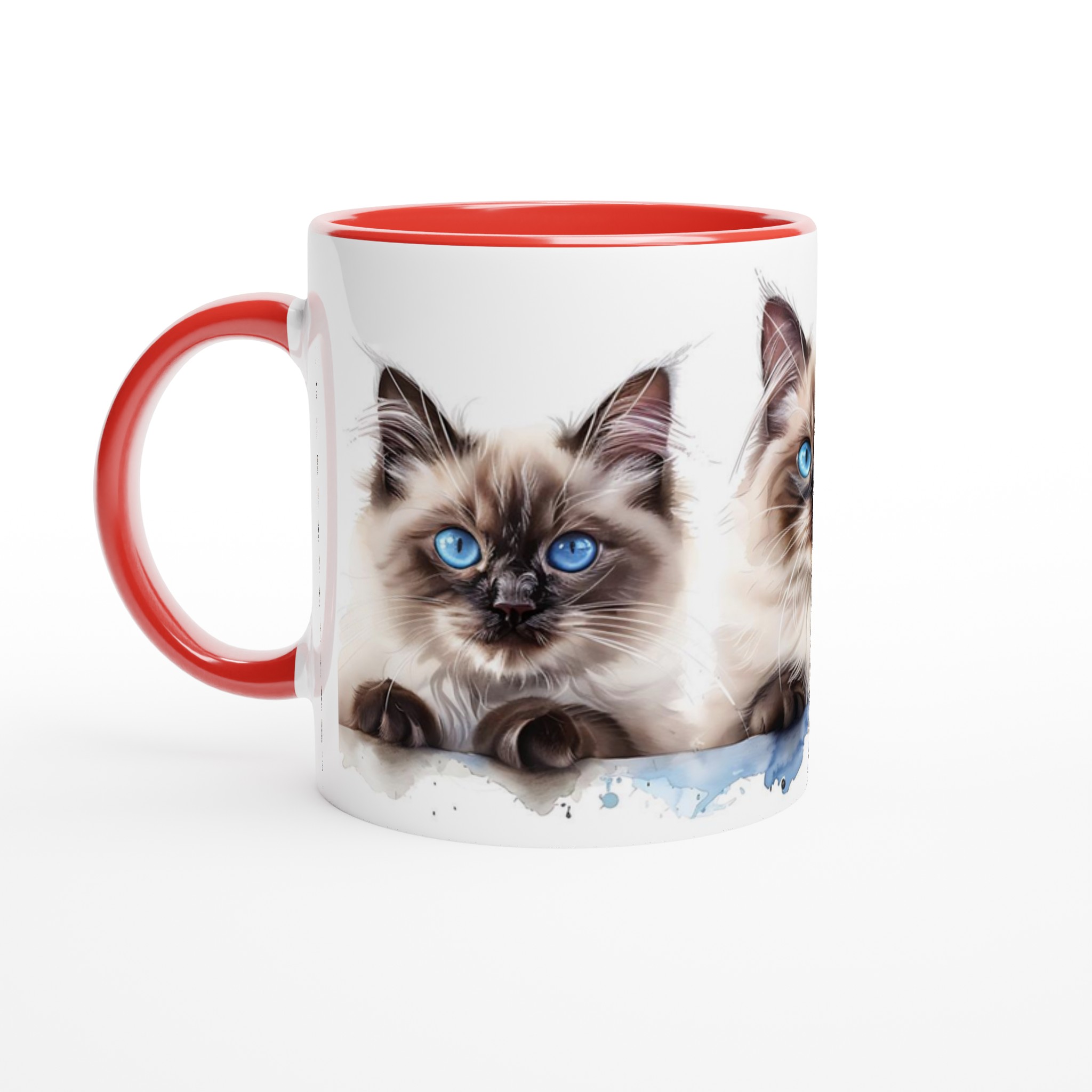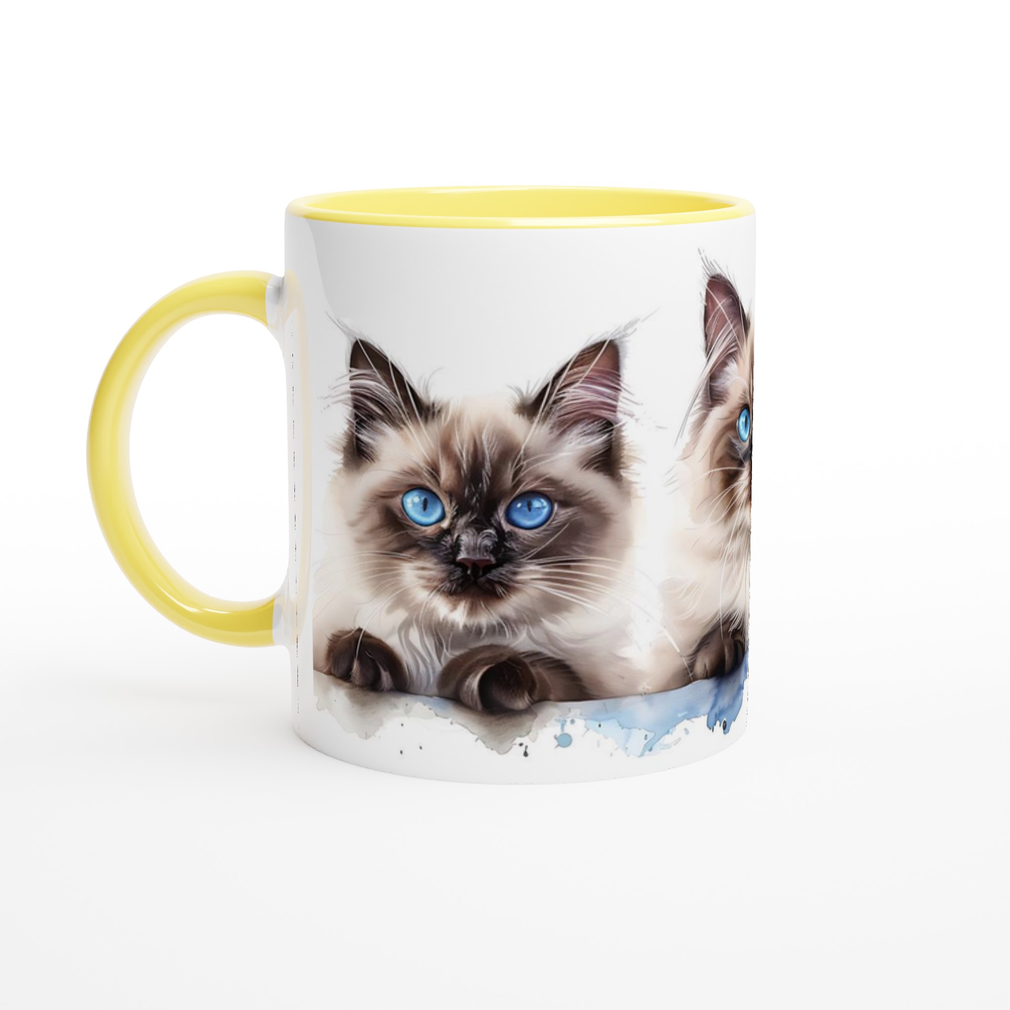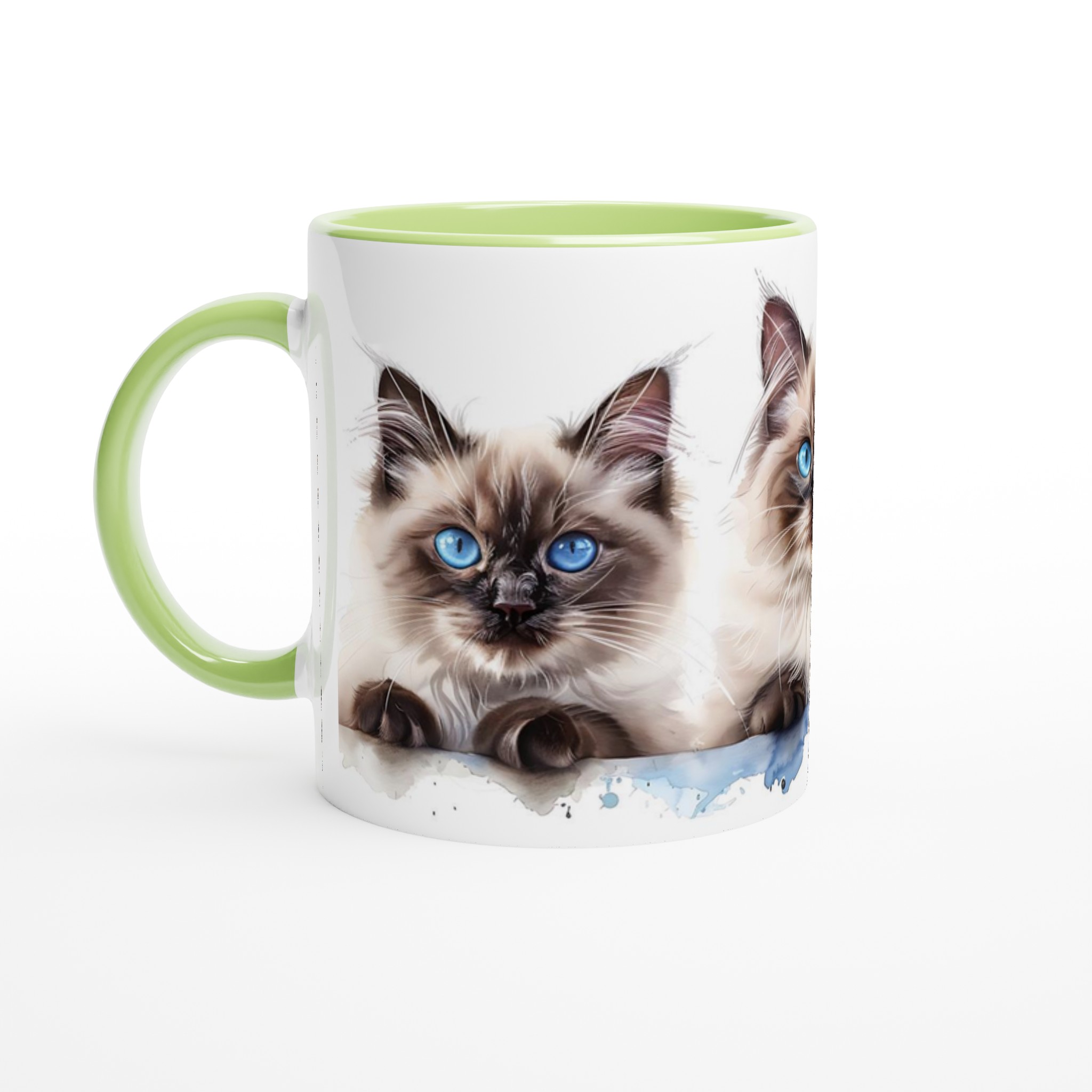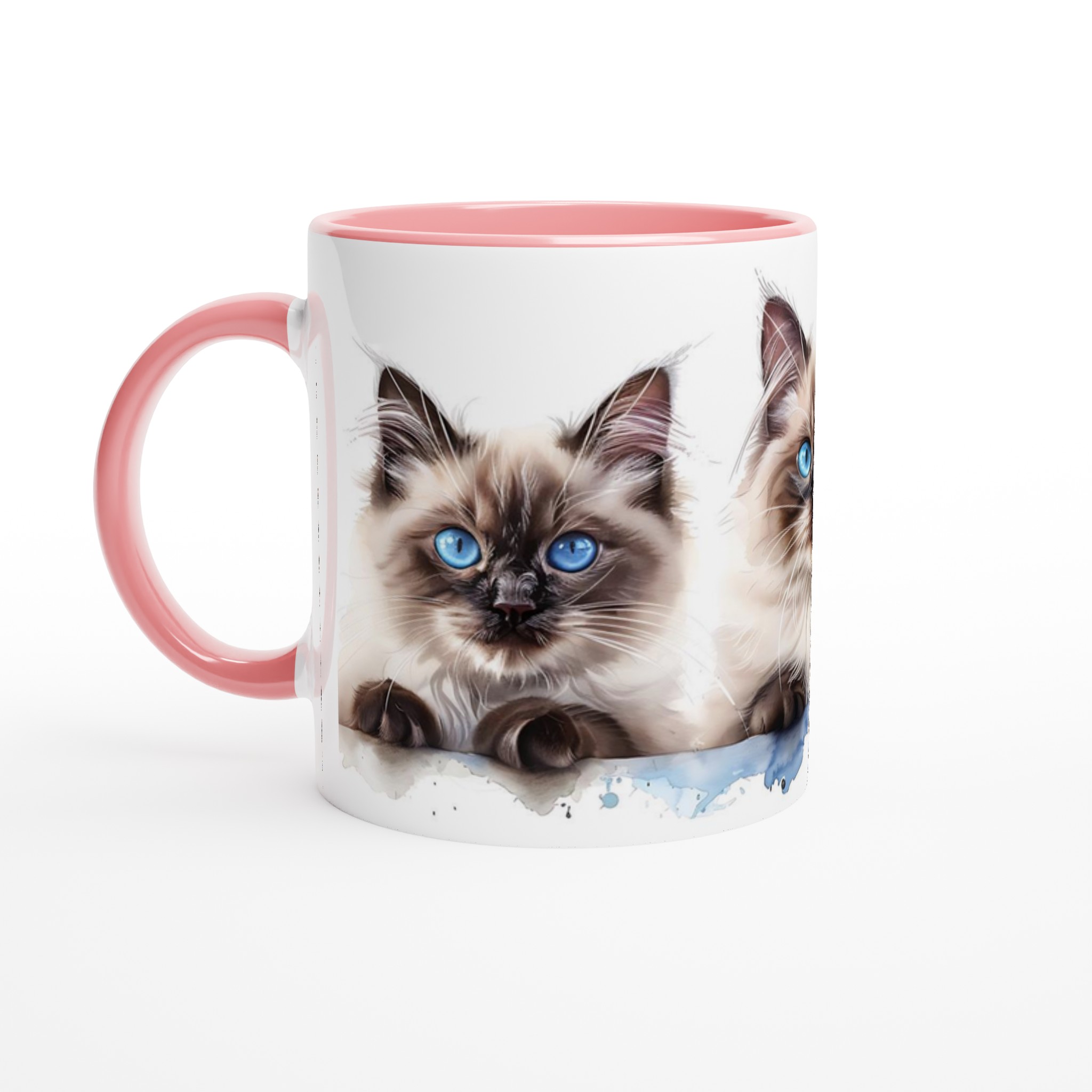 Fånga den oemotståndliga charmen med våra lurviga vänner varje gång du tar en klunk! Denna stilrena keramiska mugg, prydd med en förtrollande illustration av tre blåögda kattungar i akvarellstil, blir snabbt en vardagsfavorit. Perfekt för morgonkaffet, kvällens varma choklad eller när du bara vill njuta av en kopp te. De lekfulla kattungarna och den subtila akvarellen ger en konstnärlig touch som livar upp varje dryck. Den blanka vita ytan gör att trycken framhävs med klara och levande färger, som håller sig fina även efter många turer i mikron och diskmaskinen.