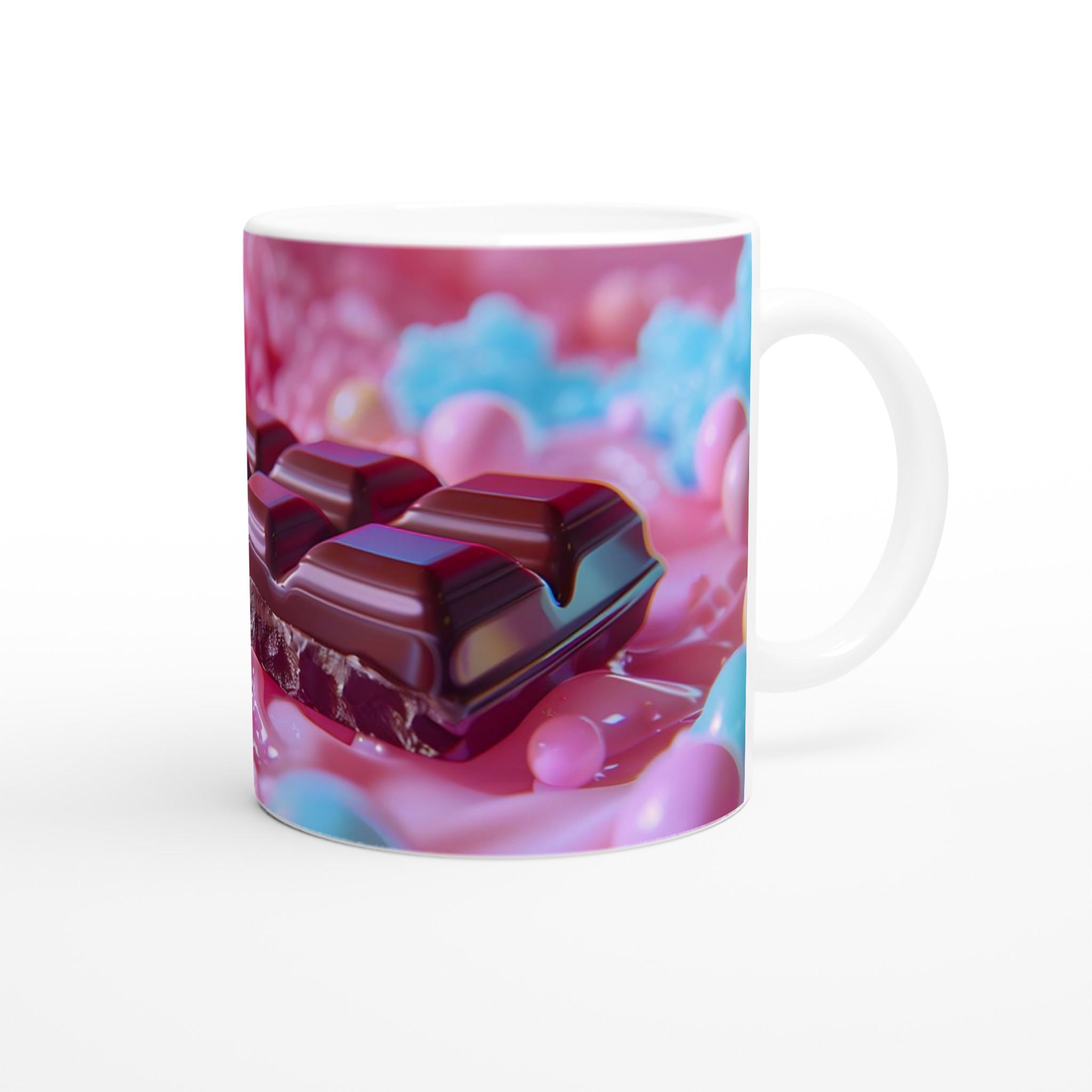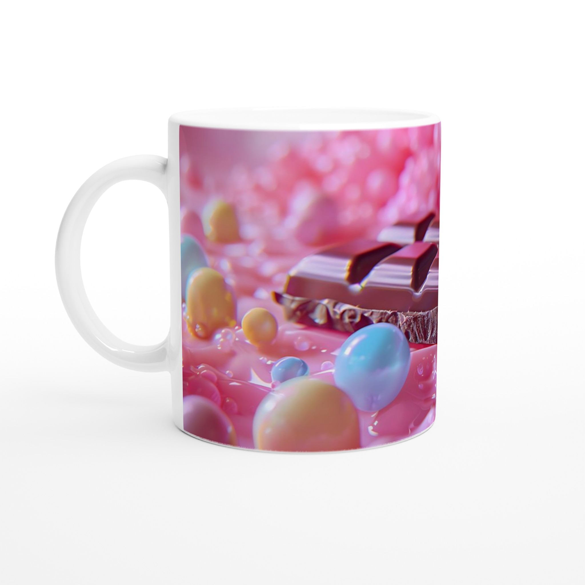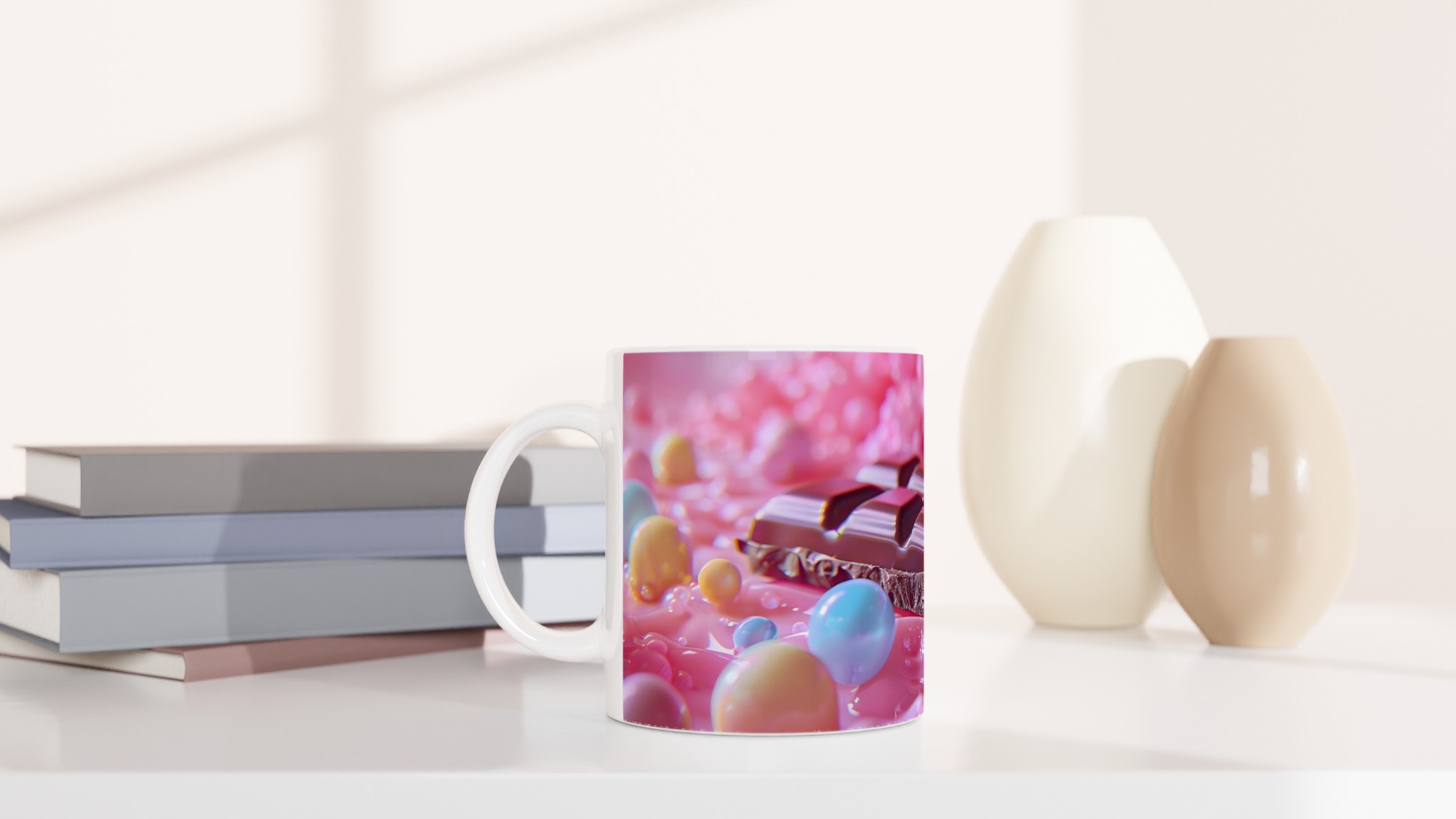 Låt varje fikastund bli en chokladdröm med denna lekfulla keramiska mugg! Inspirerad av söta godsaker och mjuka pasteller, blir denna mugg snabbt en vardagsfavorit. Perfekt för ditt morgonkaffe, kvällens varma choklad som på bilden, eller när du bara vill njuta av en kopp te i en mugg som sprider glädje. Den blanka ytan framhäver tryck med klara och levande färger, som håller sig fina även efter många turer i mikron och diskmaskinen.