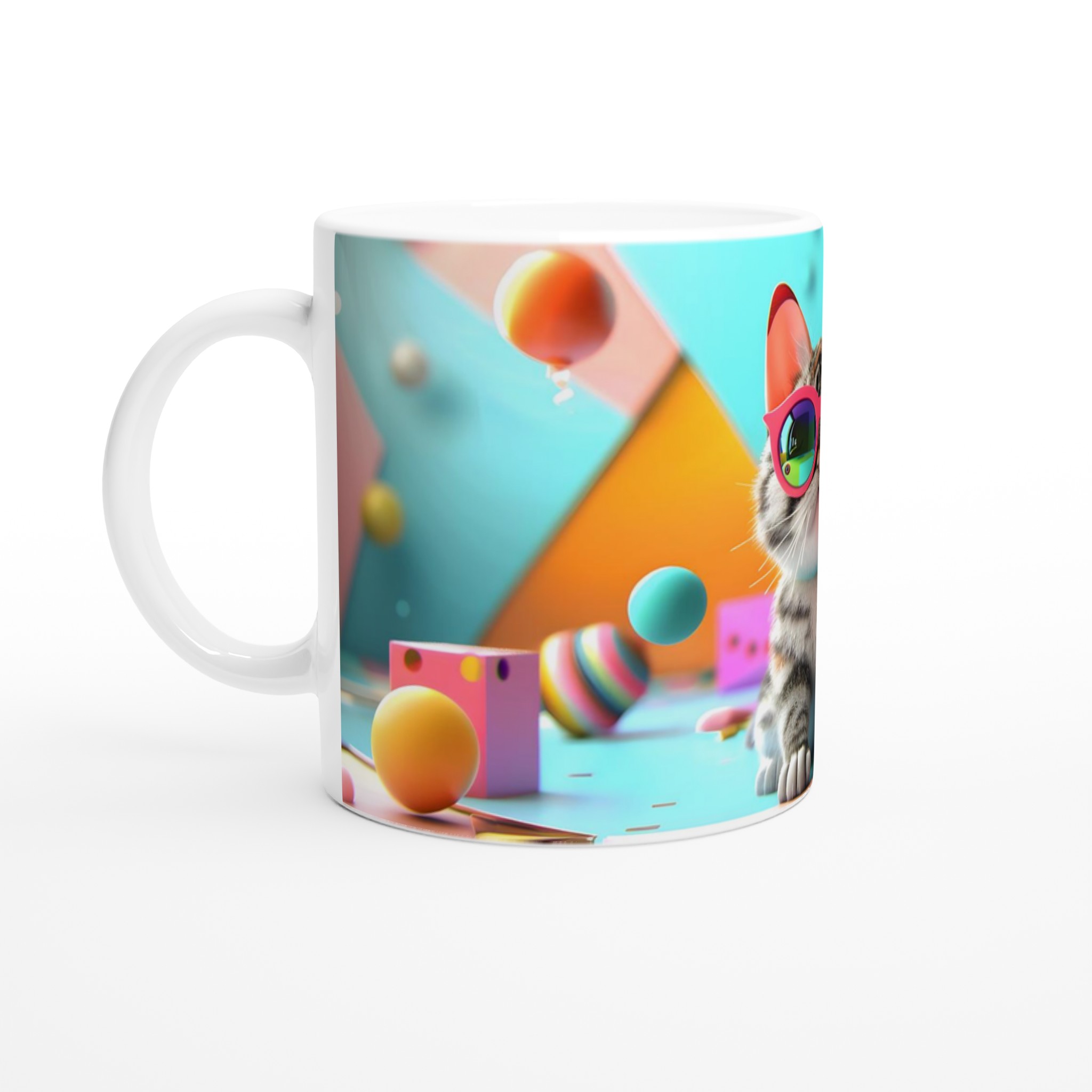 Fånga den lekfulla och trendiga känslan med vår keramiska mugg med en katt iklädd coola solglasögon, omgiven av livfulla, pastellfärgade geometriska former! Denna stilrena och vackra keramikmugg är perfekt för alla dagens stunder – morgonkaffet, en värmande kopp te eller en härlig varm choklad. Designen, med sin djärva palett och lekfulla motiv, gör varje sipp till en fest och sprider glädje med sin unika charm.