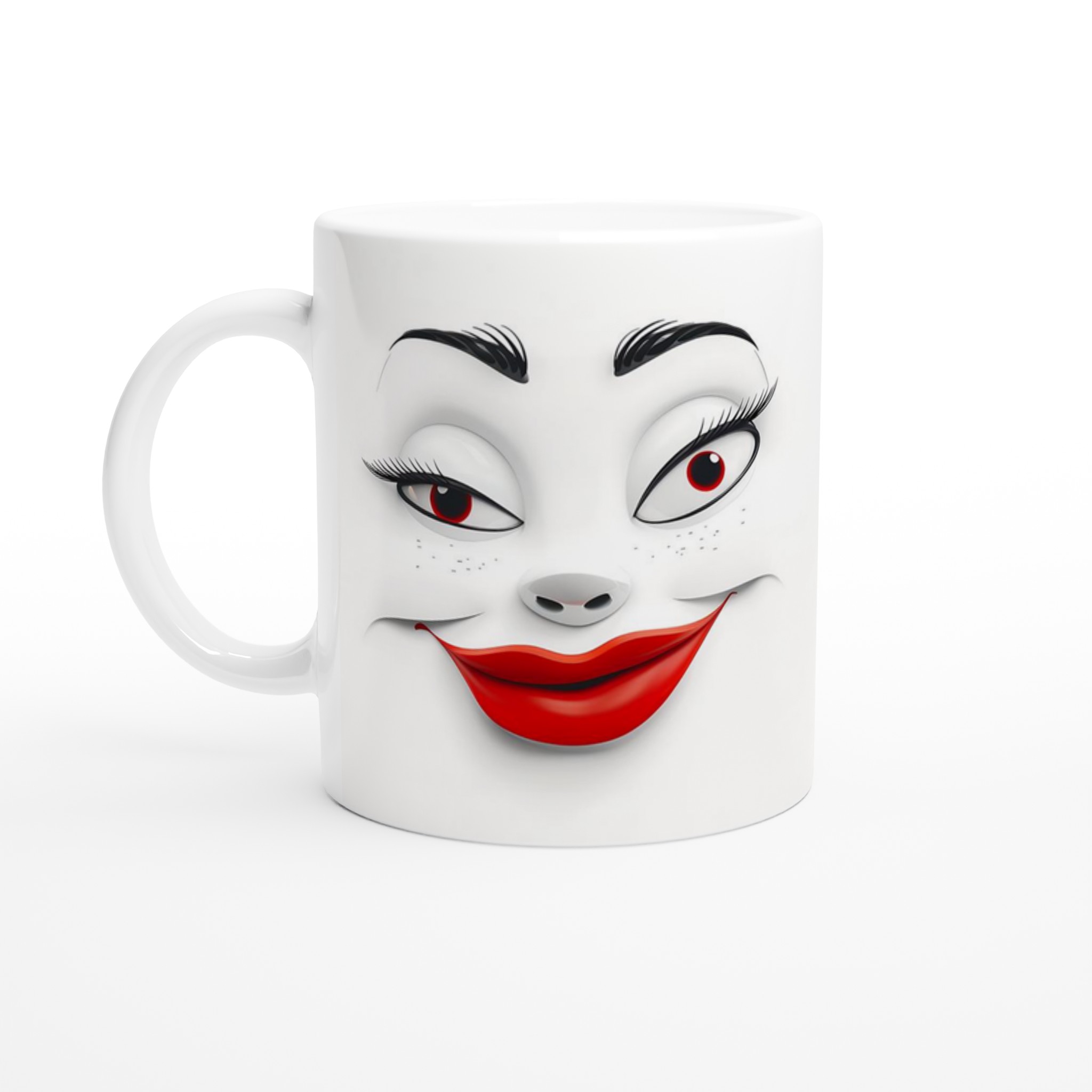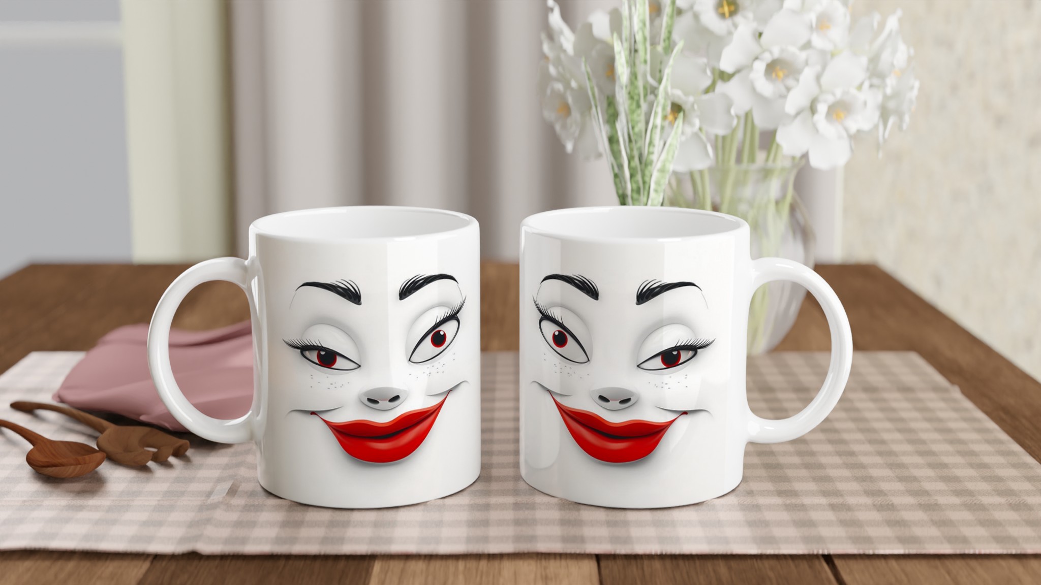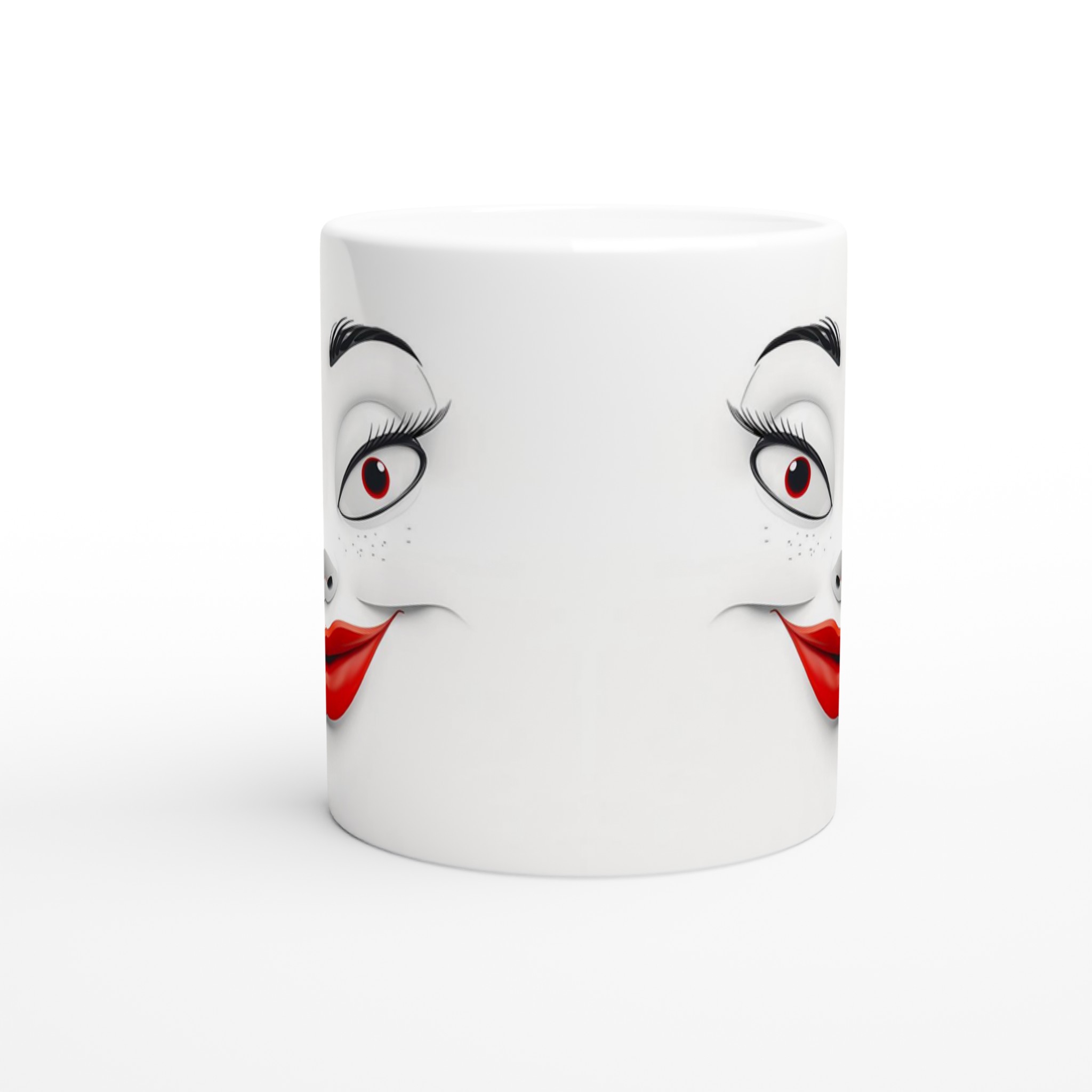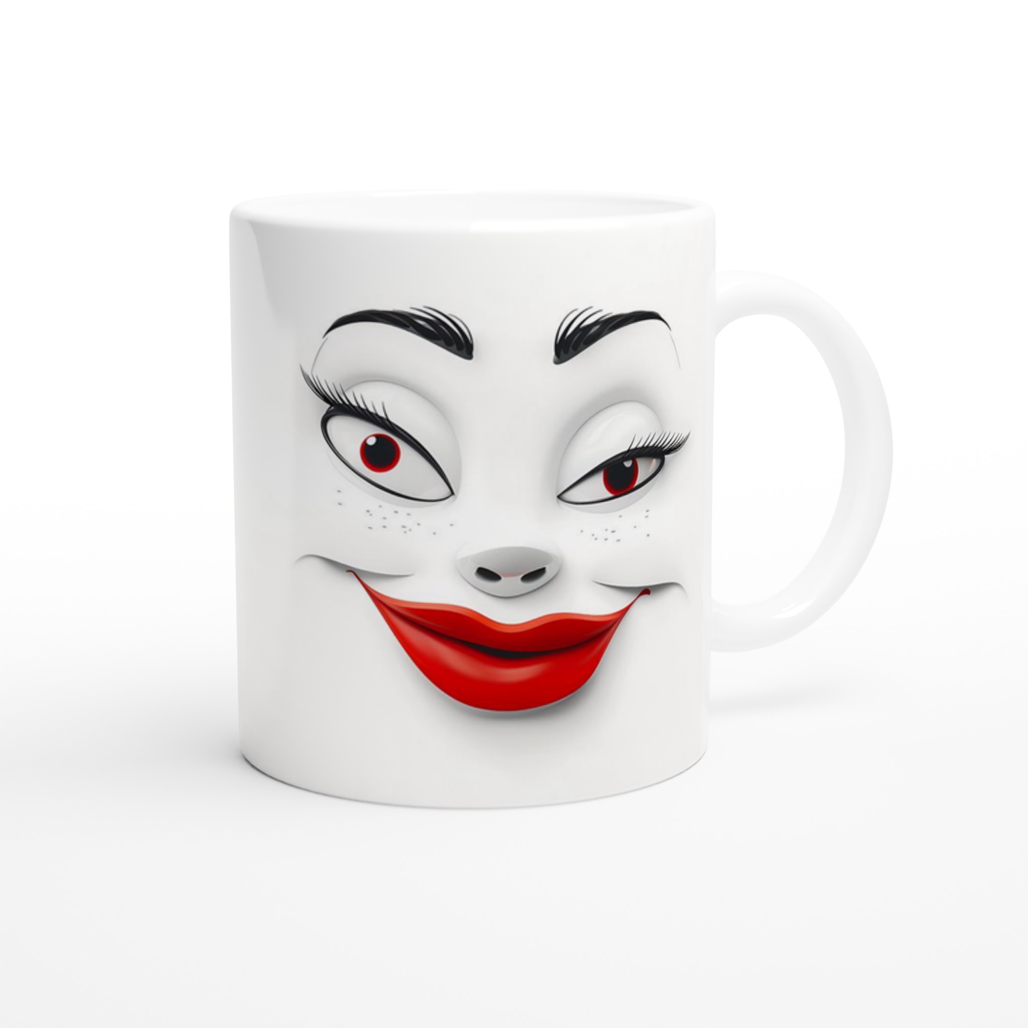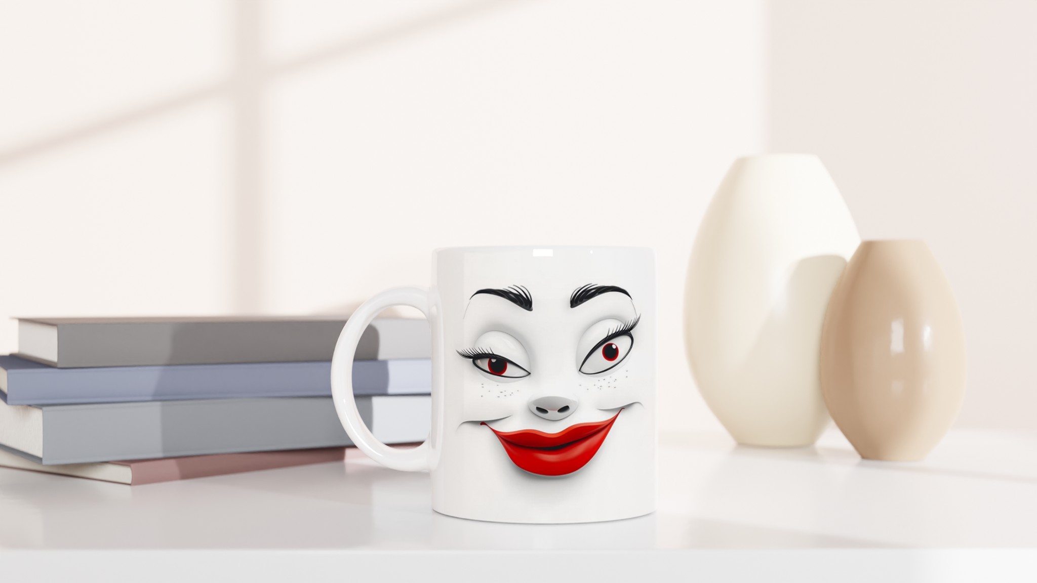 Inspirerad av den lekfulla, uttrycksfulla designen med ögon som fångar blicken och läppar i djärvt rött, blir denna mugg en konversationsstartare. Den blanka vita ytan ger ett skarpt och levande tryck som verkligen sticker ut, oavsett om det är en personlig design, ett roligt citat eller en present till någon du tycker om.