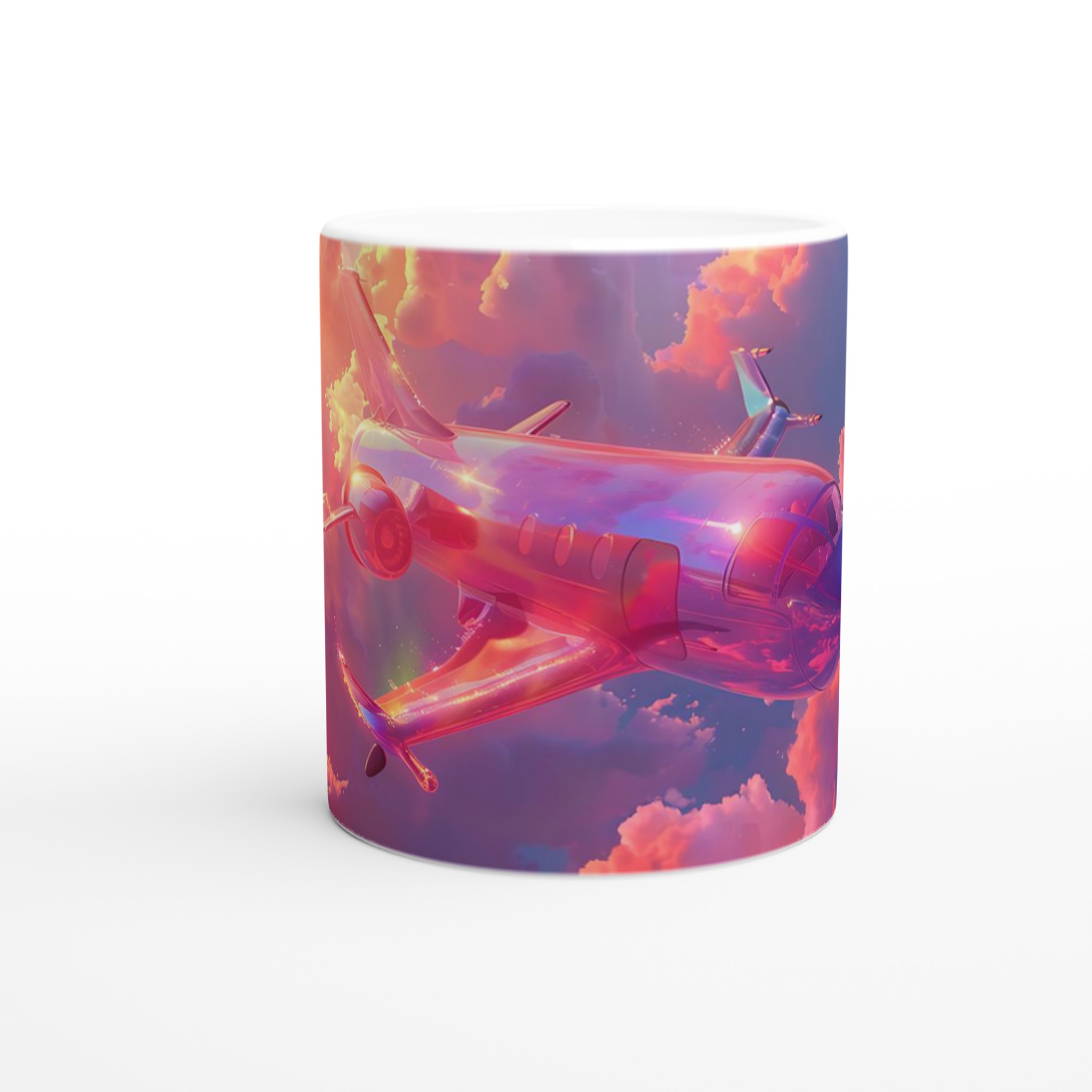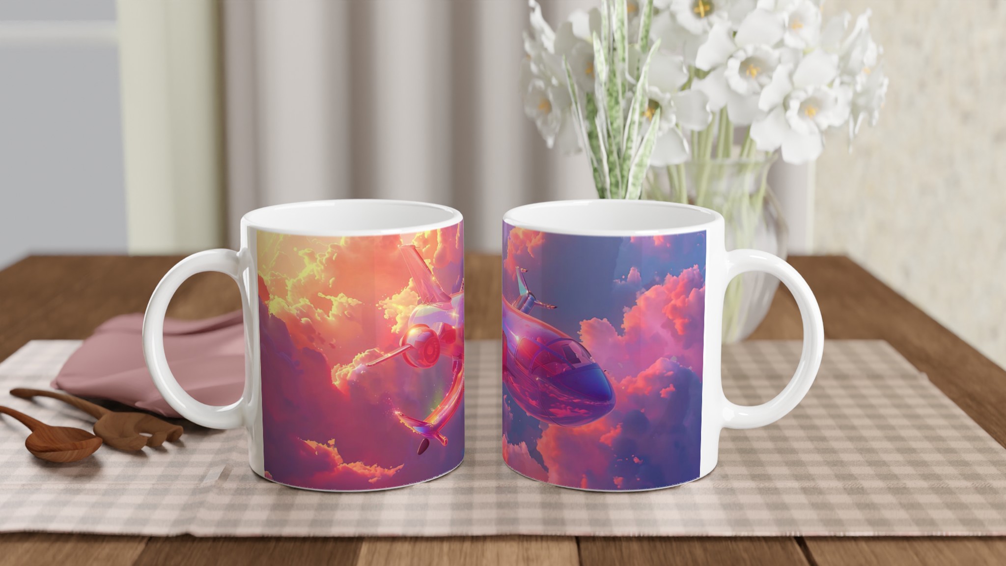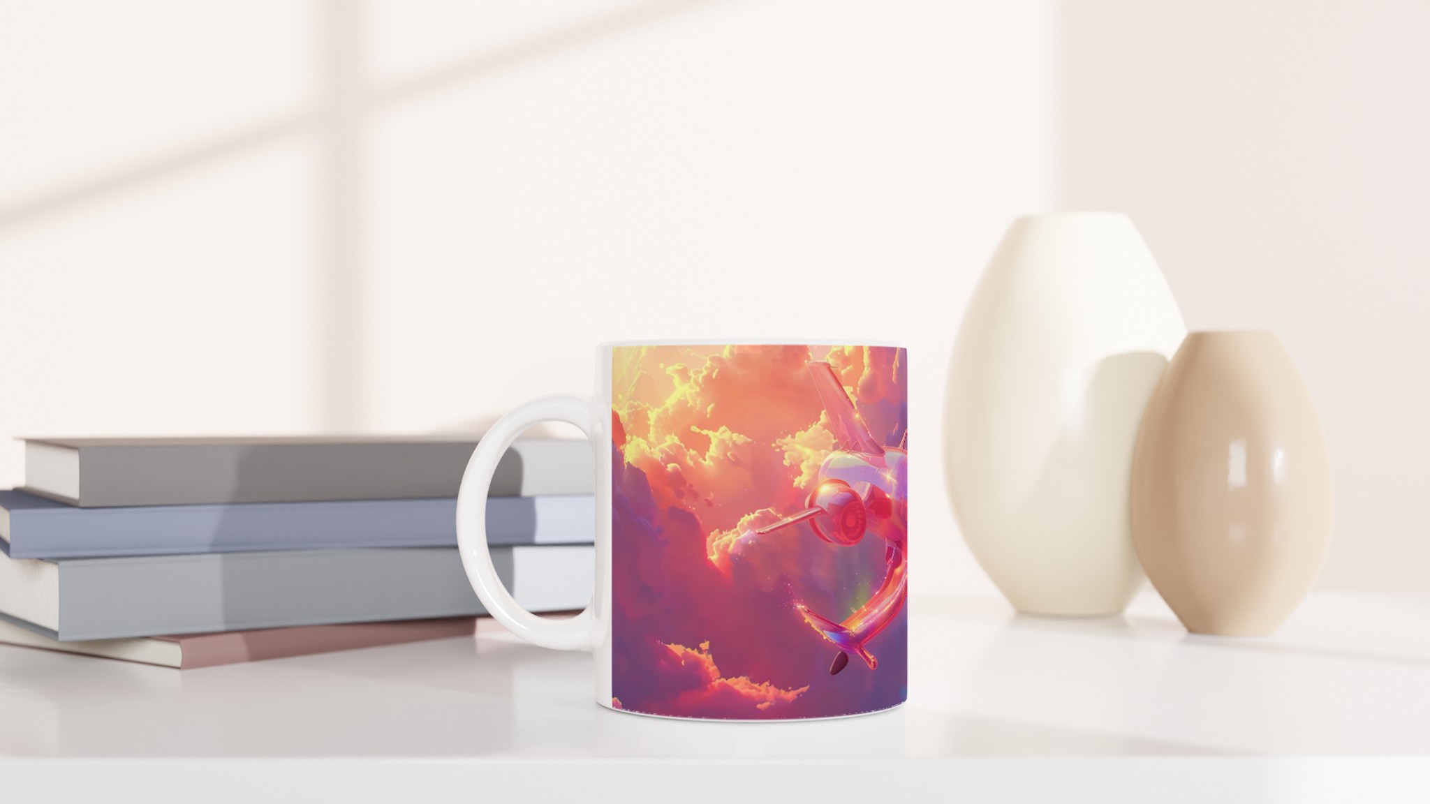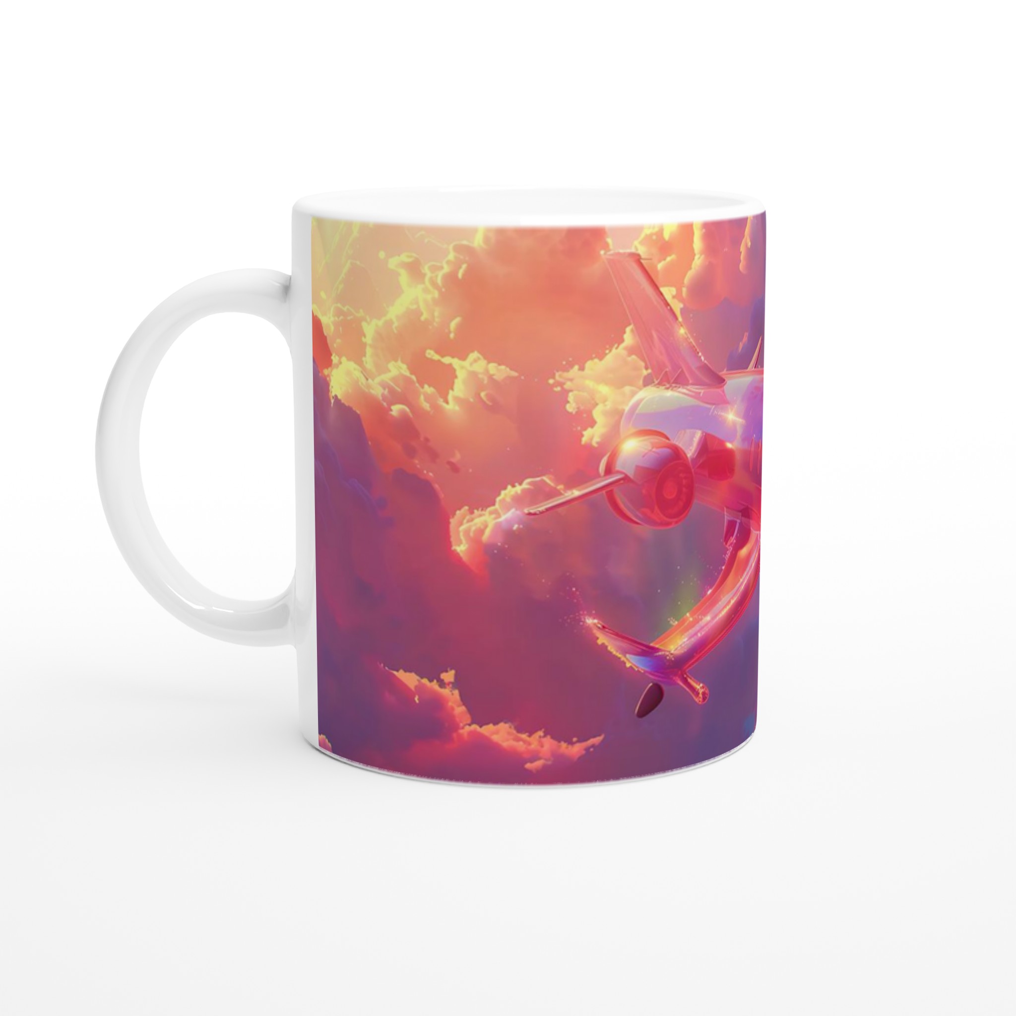 Föreställ dig att sväva bland molnen under en magisk skymningshimmel varje gång du tar en klunk. Denna inspirerande keramikmugg fångar den eteriska skönheten hos en solnedgångsflygning med dess drömska palett av rosa, lila och guld. Det är den perfekta muggen för att väcka din inre dagdrömmare och ge en touch av äventyr till din morgonkaffe, en värmande kopp te eller en härlig varm choklad.