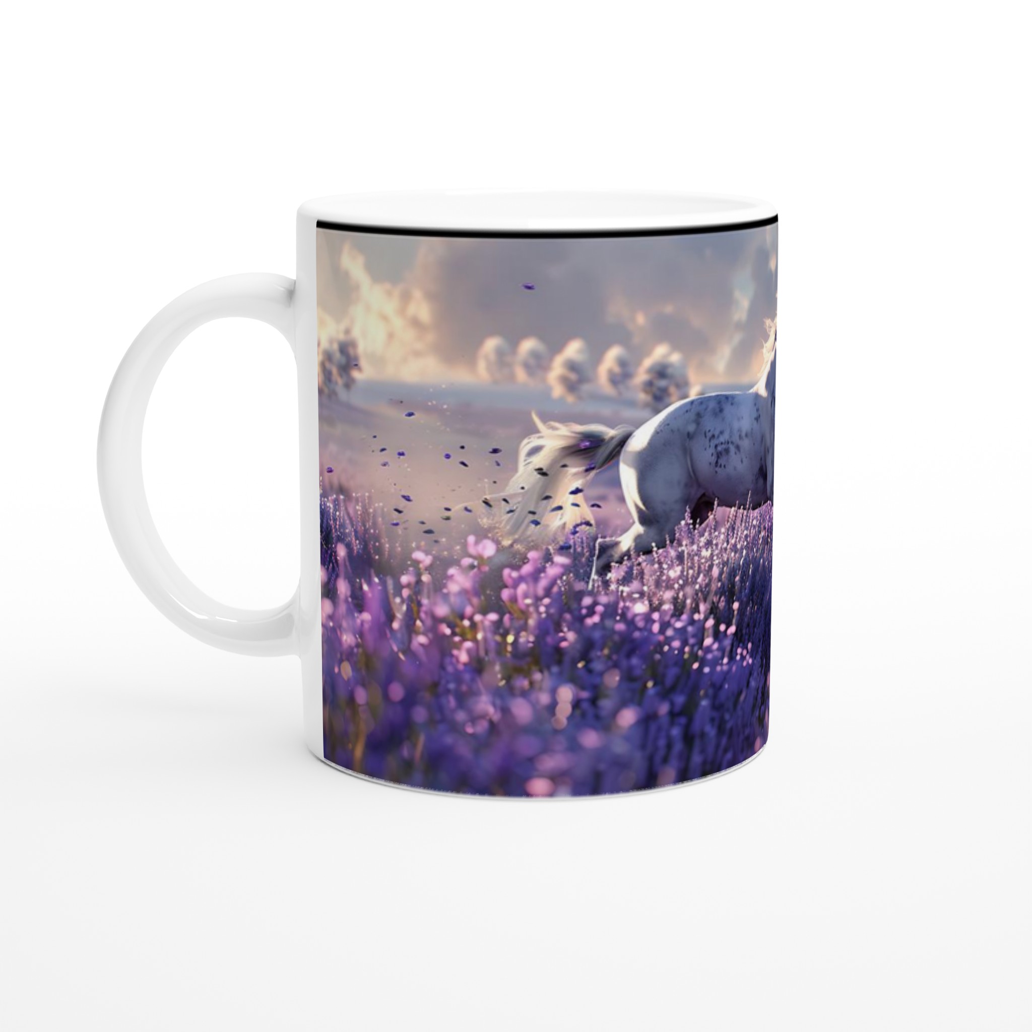 Inspirerad av den magiska synen av en graciös häst som galopperar genom ett fält av blomstrande lavendel, fångar denna mugg en känsla av lugn och eterisk skönhet. Den blanka vita ytan ger ett skarpt och levande tryck som verkligen sticker ut, oavsett om det är en personlig design, ett roligt citat eller en present till någon du tycker om.