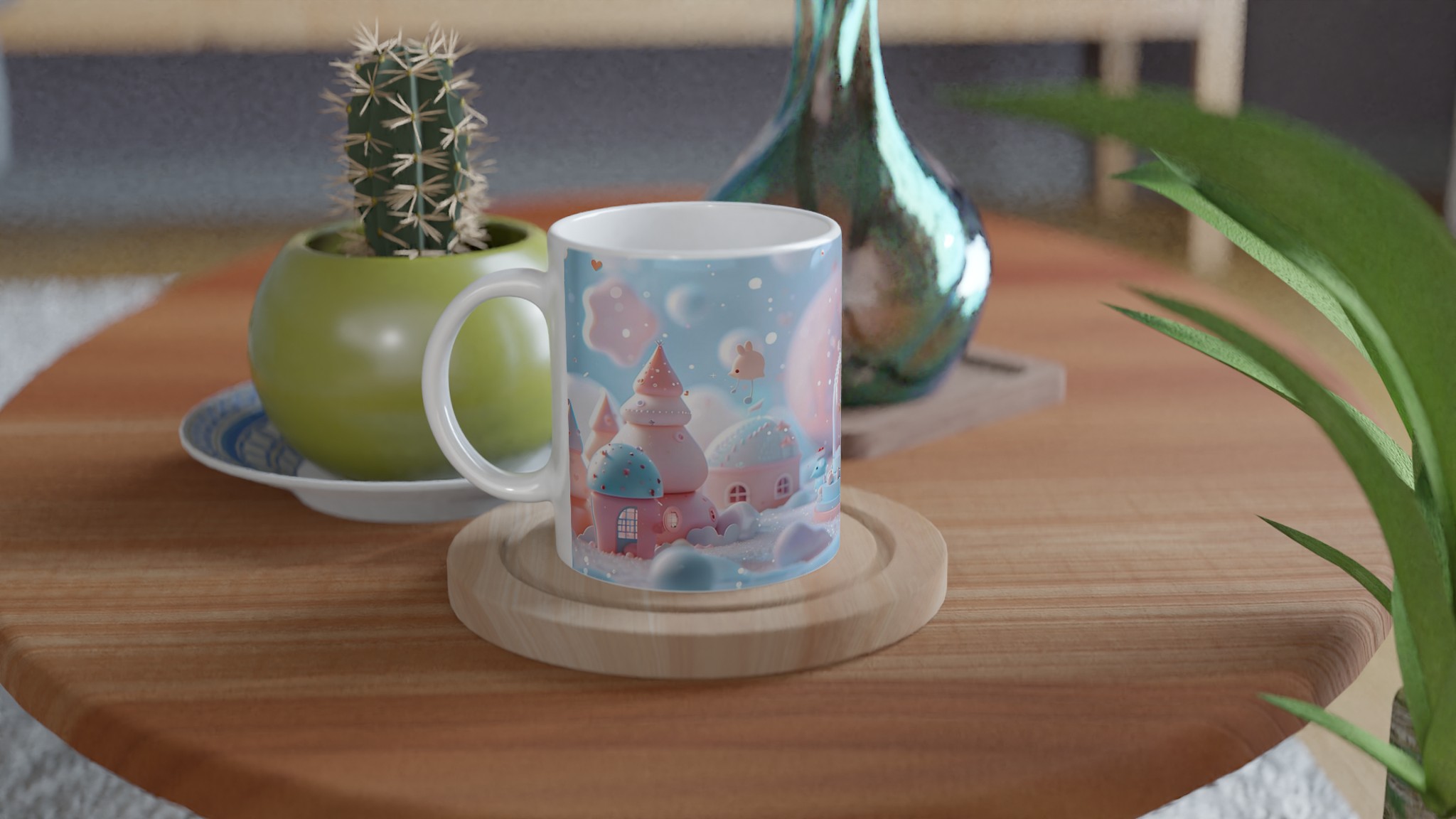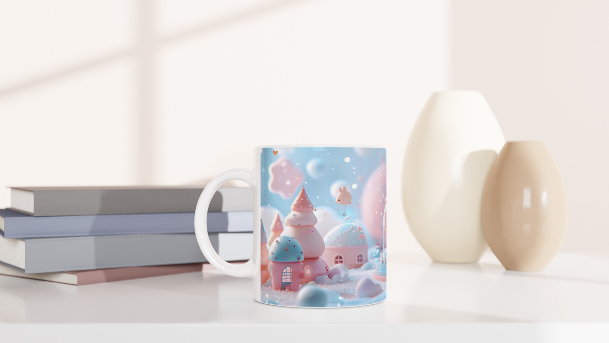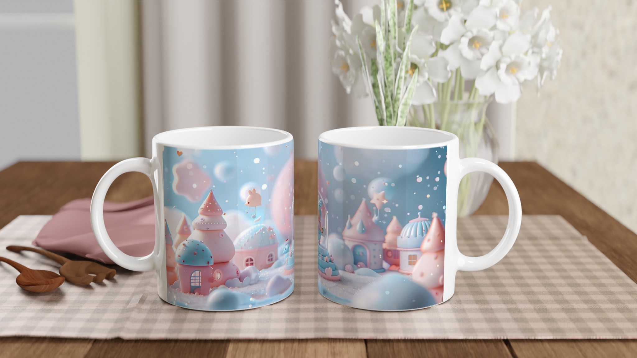 Fånga magin från en sockersöt vintervärld varje gång du tar en klunk! Denna bedårande keramiska mugg är prydd med en fantasifull scen i ljuva pastellfärger – tänk dig rosa, ljusblått och vitt som smälter samman i en drömlik skapelse. Perfekt för morgonkaffet, kvällens varma choklad eller när du bara vill njuta av en kopp te. Den blanka ytan framhäver trycket med klara och levande färger, som håller sig fina även efter många turer i mikron och diskmaskinen.