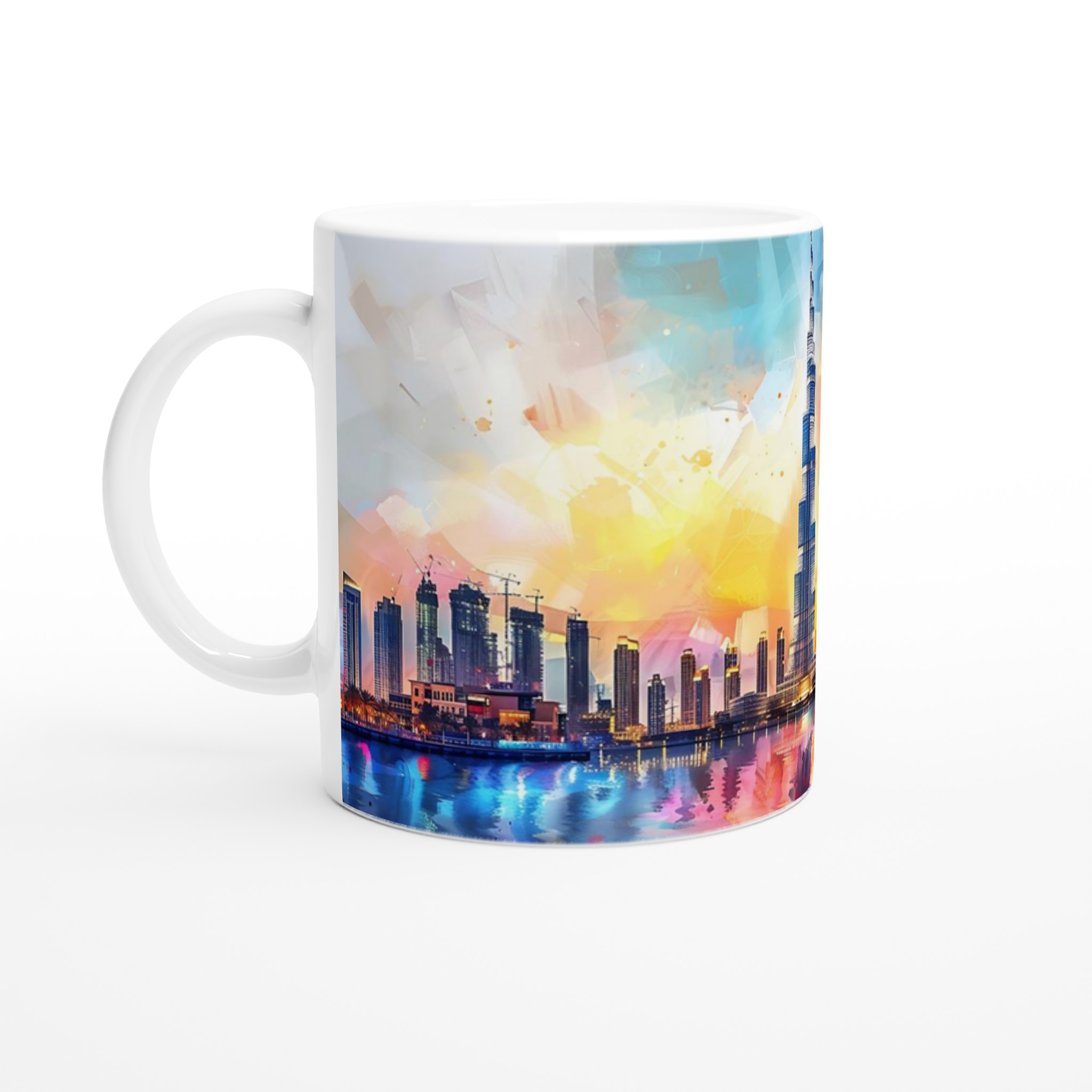 Lyft varje kaffestund med vår premium keramikmugg – stilren, hållbar och skapad för att låta ditt motiv glänsa. Denna fantastiska mugg har ett dynamiskt konstverk av Dubais ikoniska skyline, fångat i en explosion av akvarellfärger som spänner från solnedgångens varma gula och orange till den djupa blå och rosa himlen. Den abstrakta stilen med stänk och drömska nyanser ger varje klunk en känsla av storslagenhet och konstnärlig inspiration.