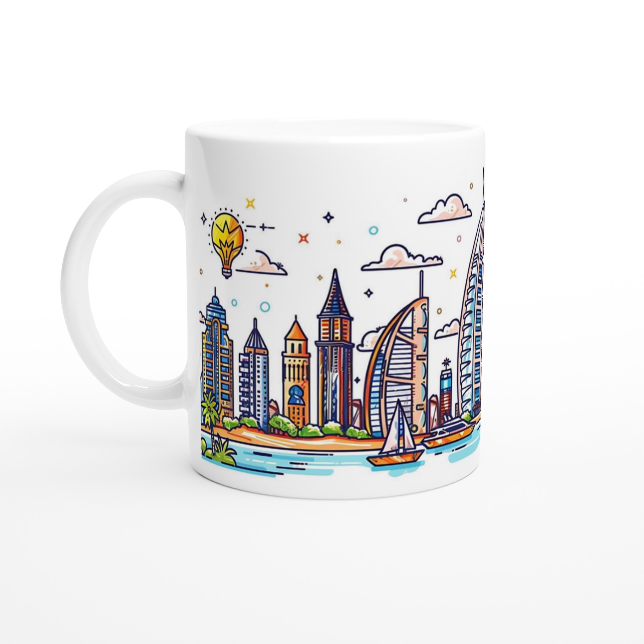 Inspirerad av Dubais ikoniska skyline, fångar denna mugg essensen av innovation och storslagenhet med sin livfulla och detaljerade design. Den blanka vita ytan ger ett skarpt och levande tryck som verkligen sticker ut, oavsett om det är en personlig design, ett roligt citat eller en present till någon du tycker om.