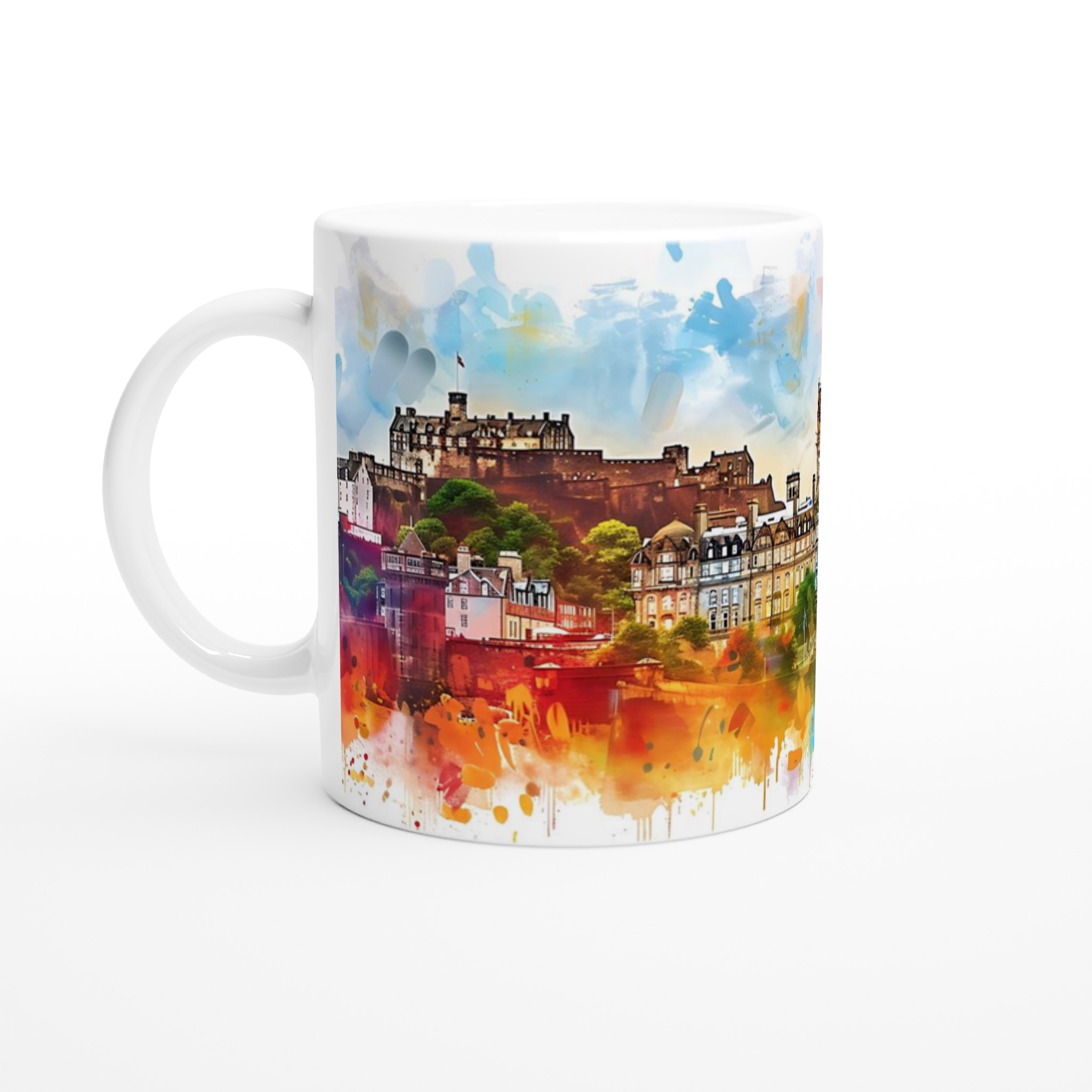 Inspirerad av Edinburghs ikoniska skyline, fångar denna mugg den livfulla energin och skönheten i stadens arkitektur genom en akvarellkonstnärs öga. Med sina varma och kalla färgövergångar, från eldigt rött till lugnande blått, är detta mer än bara en mugg – det är ett konstverk för din hand.