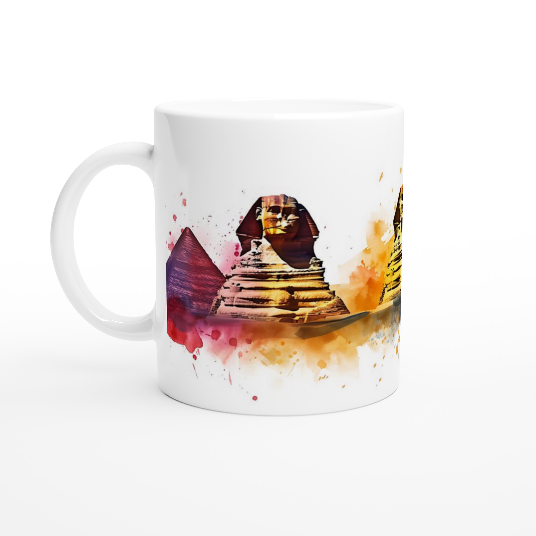 Inspirerad av Egyptens mystik och konstens livfullhet, fångar denna unika mugg storheten hos pyramiderna och Sfinxen genom en modern akvarellteknik. Med sin palett av varma röda, gyllene gula och lugnande blå nyanser, är varje klunk en resa genom tid och konst. Den blanka vita ytan ger ett skarpt och levande tryck som verkligen sticker ut, oavsett om det är en personlig design, ett roligt citat eller en present till någon du tycker om.