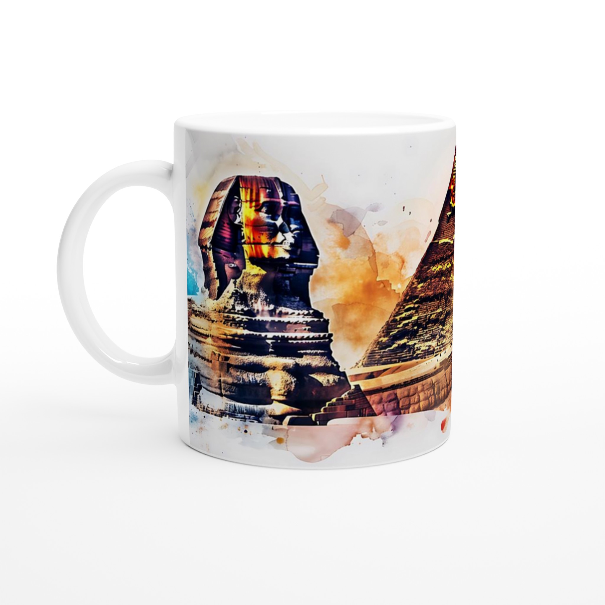 Förvandla din dagliga kafferitual till en resa genom tid och mystik med vår exklusiva keramikmugg, prydd med ett unikt akvarellmotiv av Egyptens ikoniska pyramider och sfinxer.