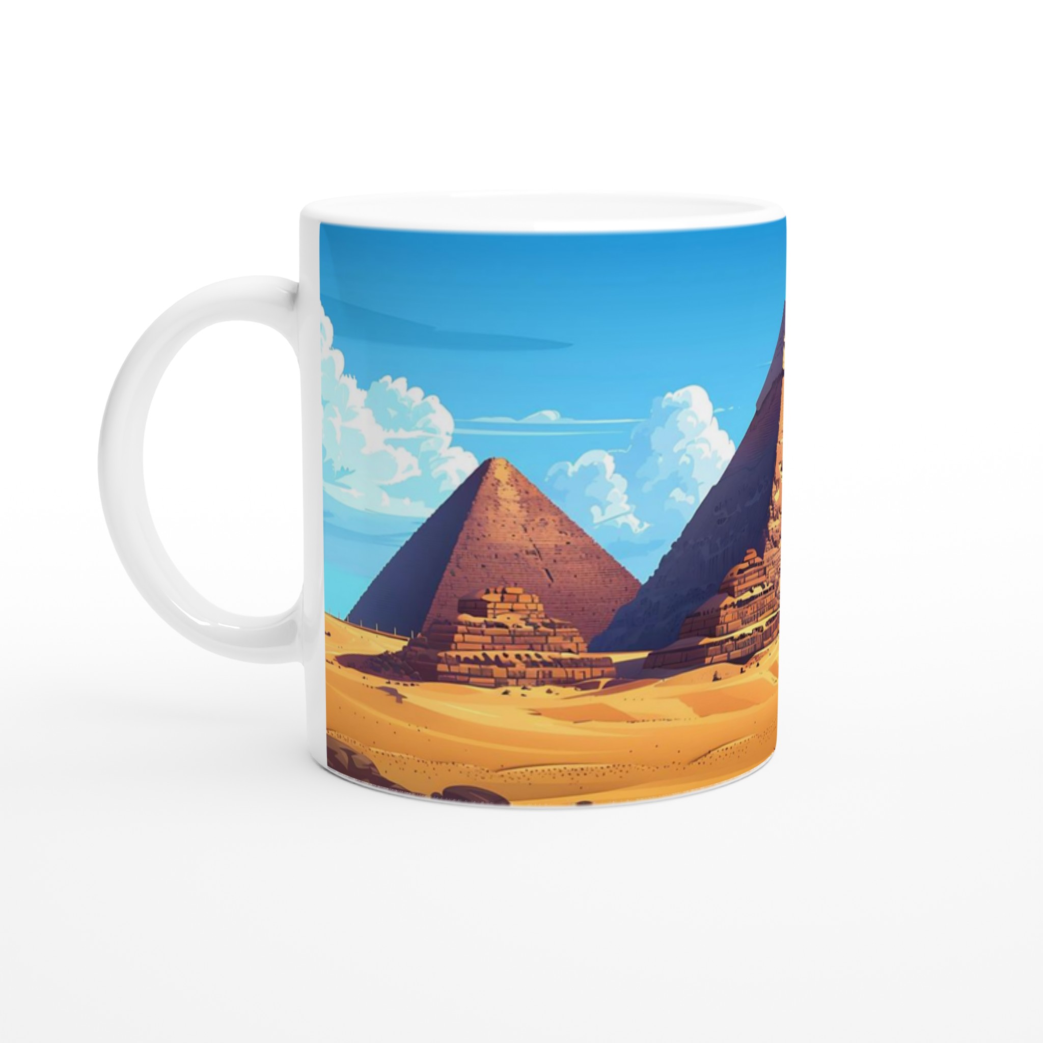 Inspirerad av den majestätiska skönheten hos de egyptiska pyramiderna under en klarblå himmel, fångar denna design den tidlösa känslan av äventyr och forntida mystik. Den blanka vita ytan ger ett skarpt och levande tryck som verkligen sticker ut, oavsett om det är en personlig design, ett roligt citat eller en present till någon du tycker om.