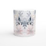 Förgyll dina fikastunder med vår eleganta keramiska mugg, prydd med ett förtrollande mönster av akvarellmålade löv i mjuka pastellrosa och subtila gråblå toner. Denna mugg för tankarna till en lugn och harmonisk trädgård, perfekt för att addera en touch av sofistikation till din vardag, oavsett om du njuter av morgonkaffet, en lugnande kopp te eller en rik varm choklad.