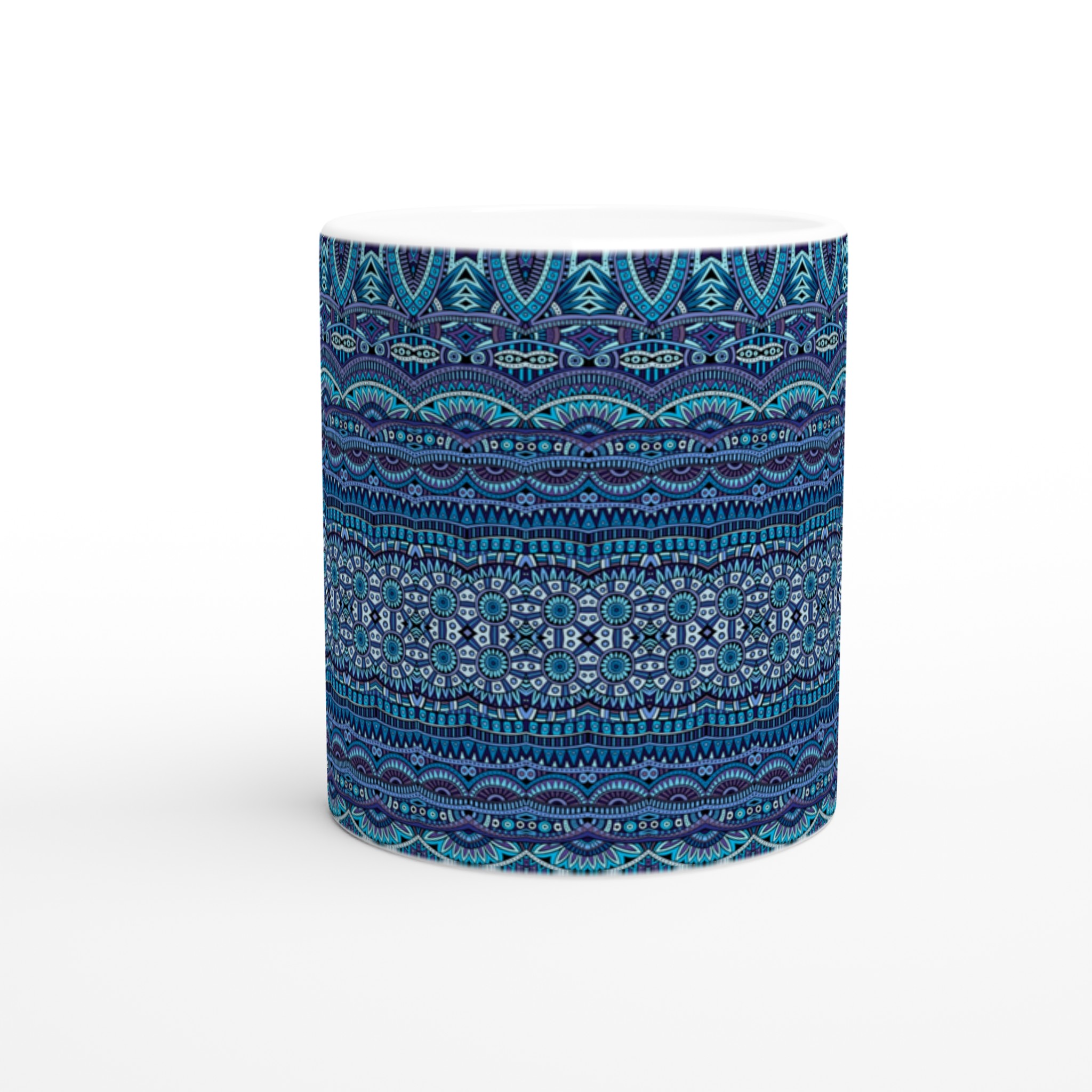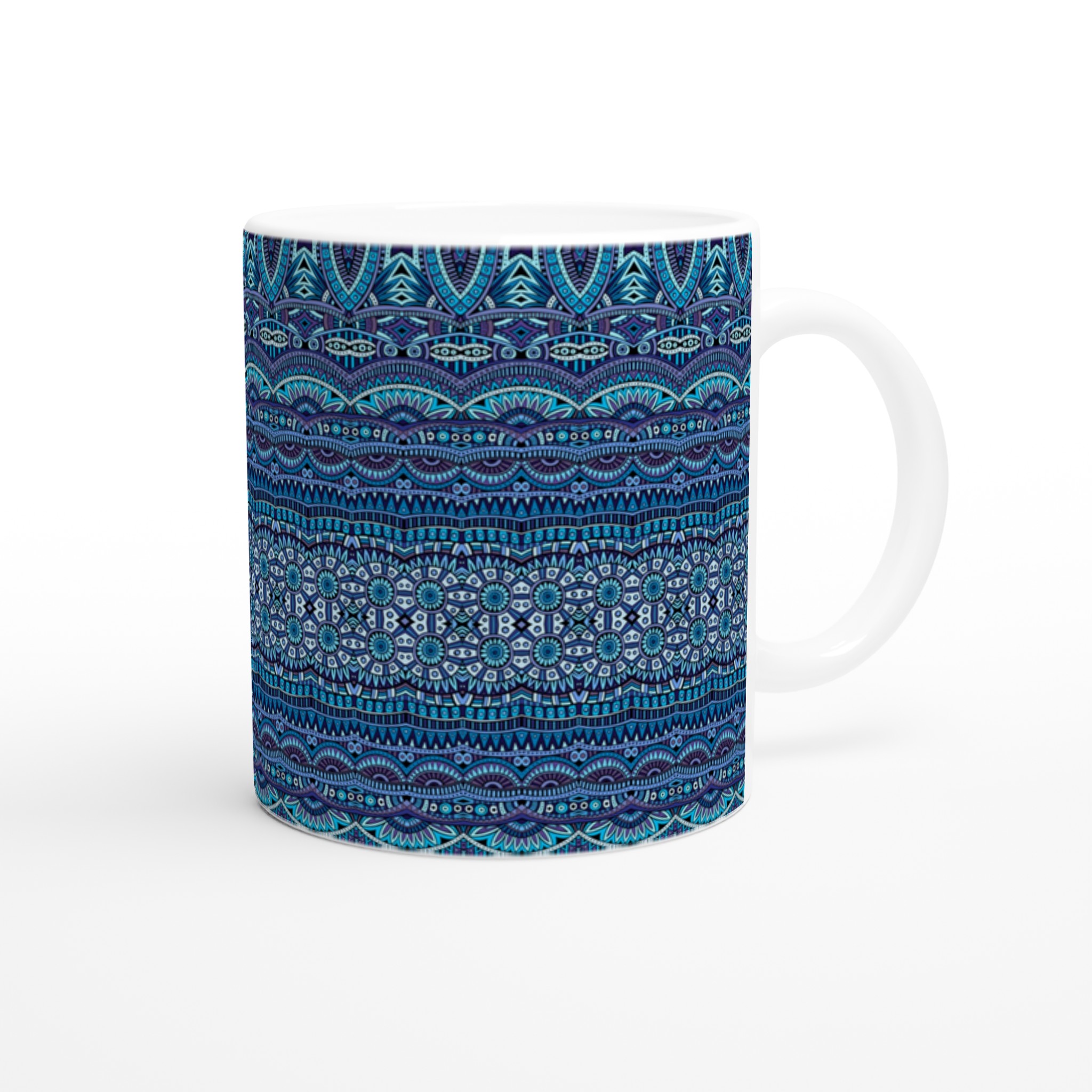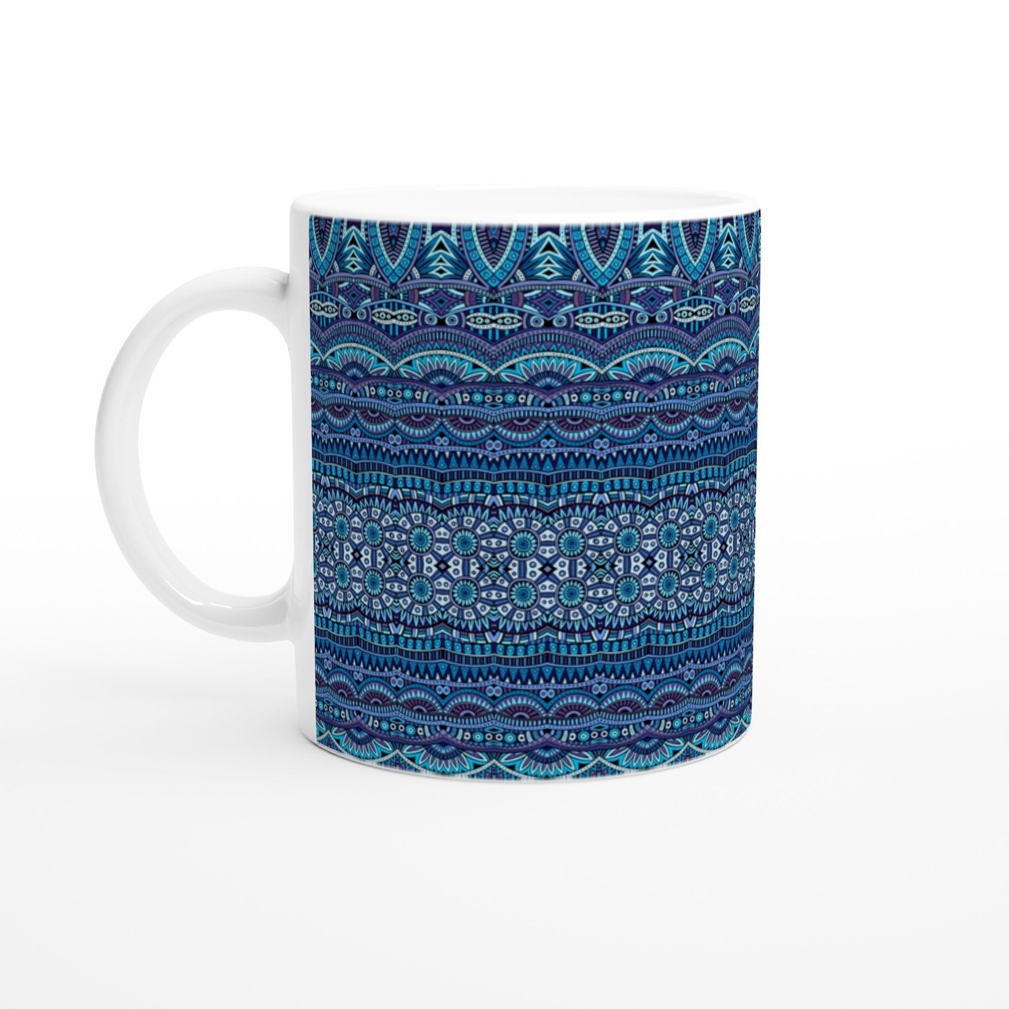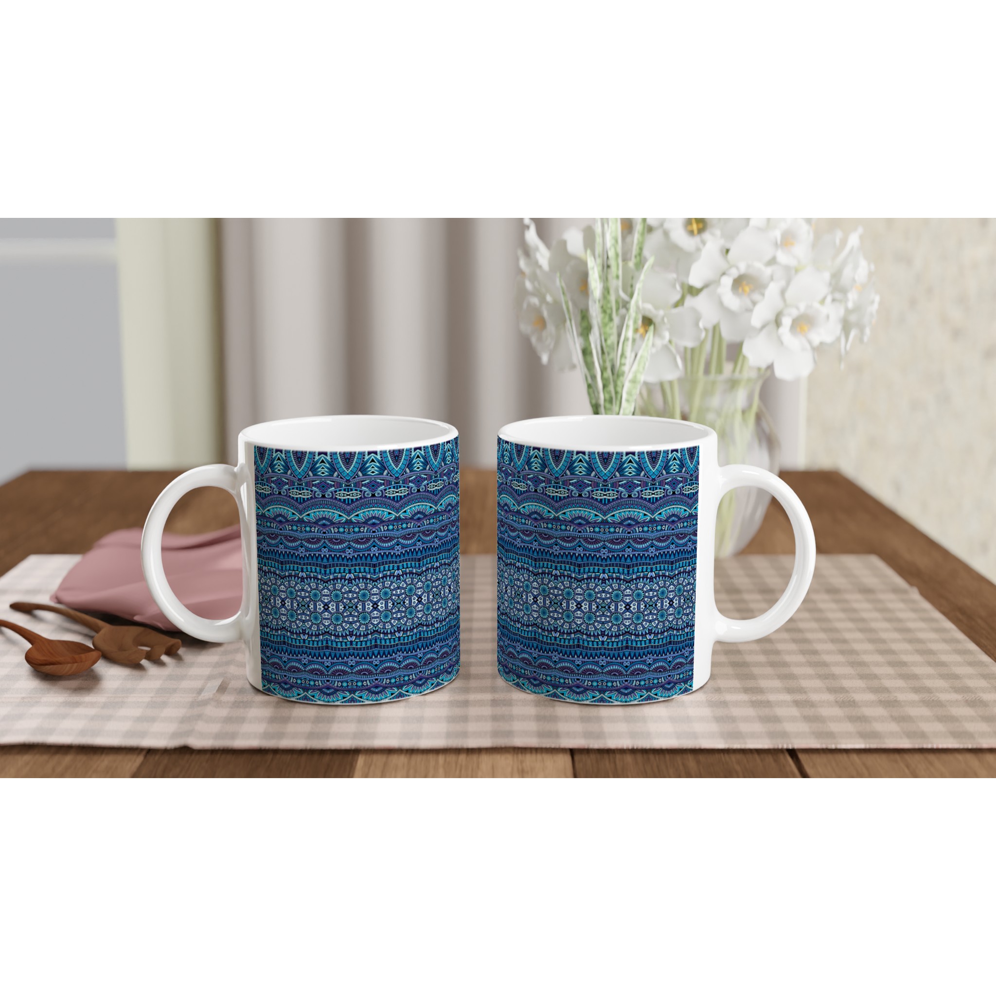 Förvandla varje fikastund till en resa med vår etniskt mönstrade keramikmugg! Inspirerad av intrikata traditionella mönster i lugnande blå och lila toner, är denna mugg en perfekt blandning av konst och funktion. Den blanka vita ytan låter det detaljerade trycket framträda med skarp klarhet och levande färger, vilket gör den till en iögonfallande favorit i ditt kök eller på kontoret. Oavsett om du njuter av ditt morgonkaffe, en värmande kopp te eller en härlig varm choklad, kommer denna mugg att höja din upplevelse.