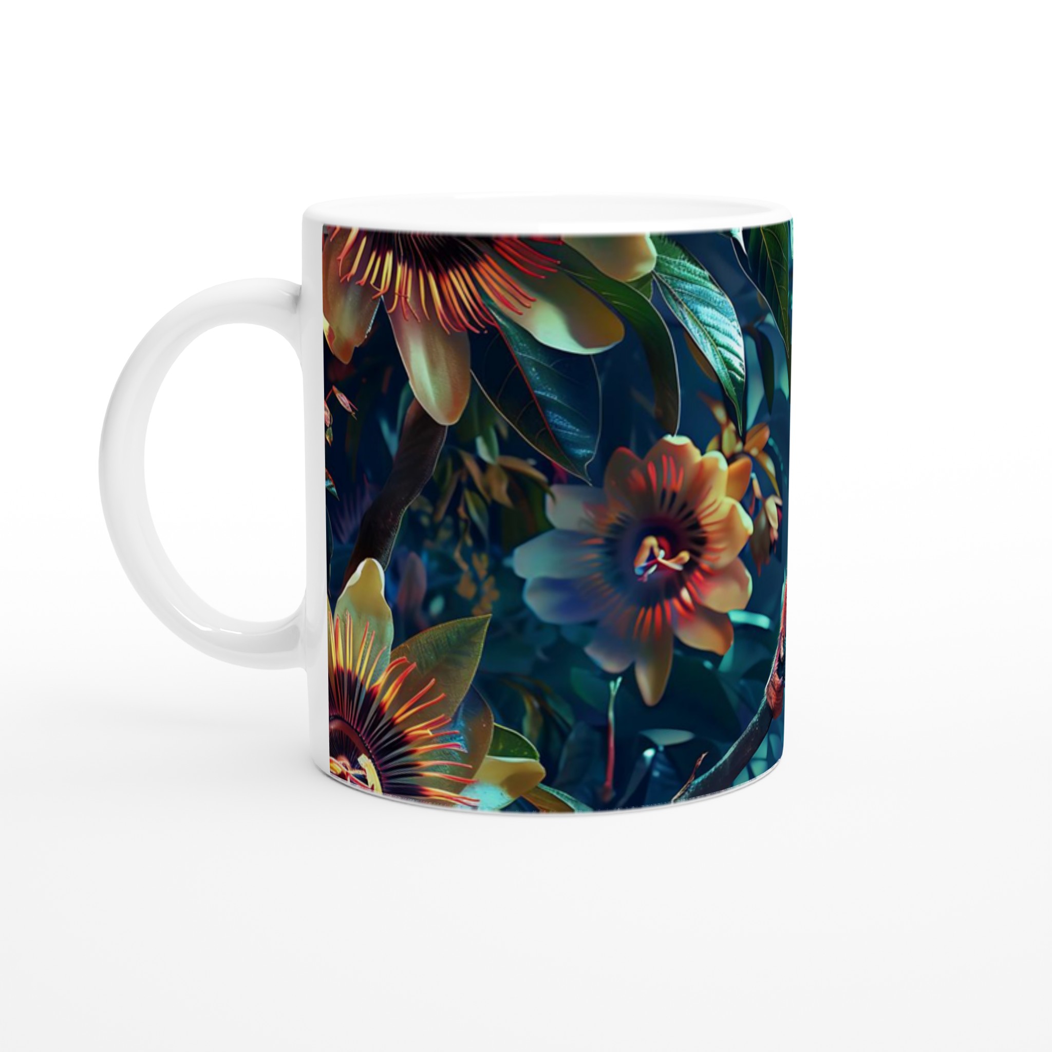 Fånga den tropiska magin med vår unika keramikmugg, prydd med en levande illustration av en rödbrun apa som vilar bland frodiga, färgstarka djungelblommor. Denna mugg är perfekt för dig som älskar naturinspirerad konst och vill addera en exotisk touch till din dryckesupplevelse. Med sin detaljrika design och rika färgpalett, från djupblått till varma rödbruna toner, blir varje sip en liten flykt till regnskogen.