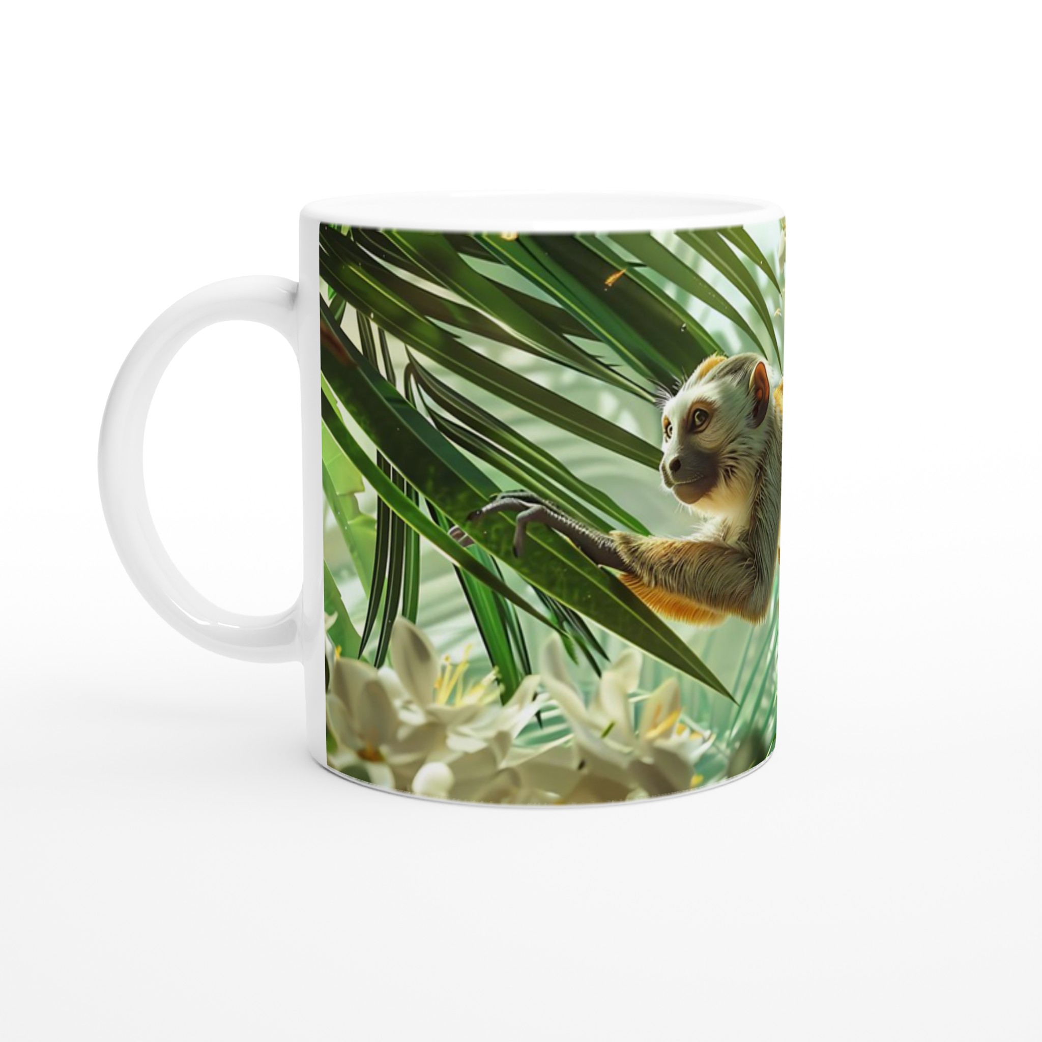 Denna charmiga mugg fångar den lekfulla andan från tropikerna med en förtrollande apdesign, omgiven av frodiga gröna blad och vita blommor. Den blanka vita ytan ger ett skarpt och levande tryck som verkligen sticker ut, oavsett om det är en personlig design, ett roligt citat eller en present till någon du tycker om.