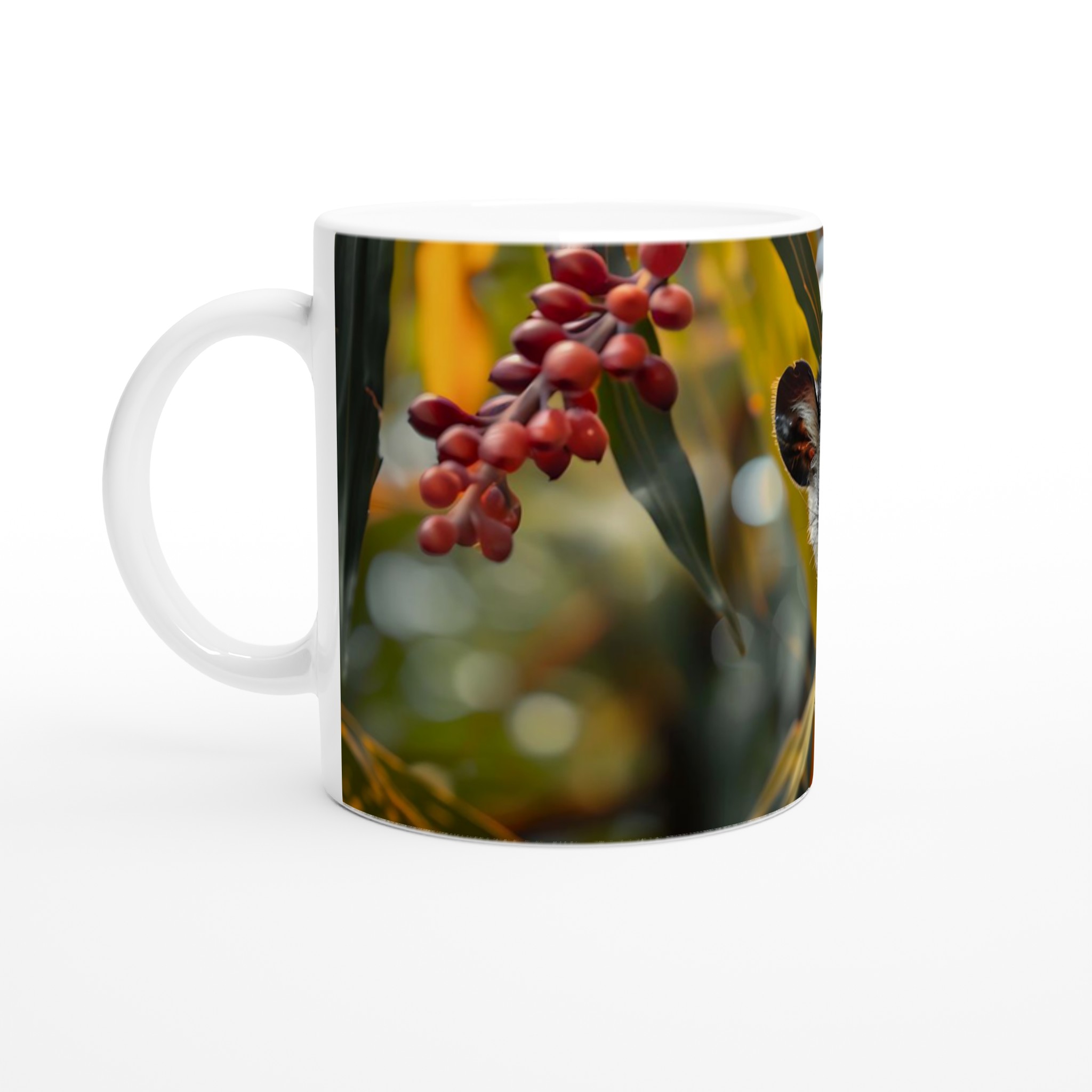 Denna exklusiva mugg fångar den fängslande blicken av en civet med glödande ögon, omgiven av frodig grönska och djupröda bär. Den intensiva kompositionen och färgpaletten gör varje klunk till en liten flykt till en exotisk värld. Vare sig du drömmer om avlägsna djungler eller bara älskar unika, konstnärliga motiv, kommer denna mugg att sätta en speciell prägel på din dag.