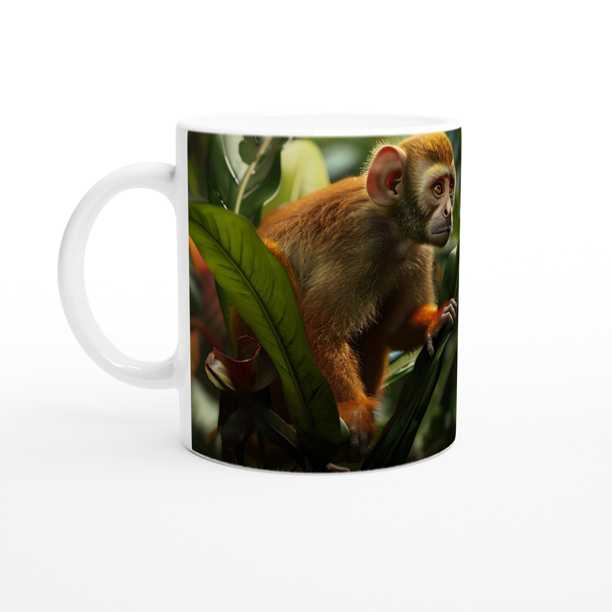 Inspirerad av den livfulla djungeln, fångar denna mugg den mystiska skönheten hos en apa omgiven av frodig grönska och exotiska blommor. Den detaljrika designen, med dess varma färger och naturtrogna känsla, förvandlar varje sipp till en liten flykt till en tropisk oas. Vare sig du älskar natur, djur eller bara vill ha en unik touch till din samling, är denna mugg ett perfekt samtalsämne.